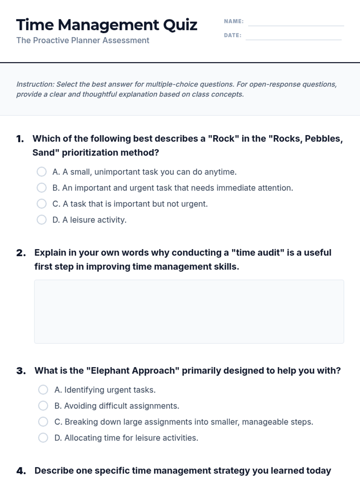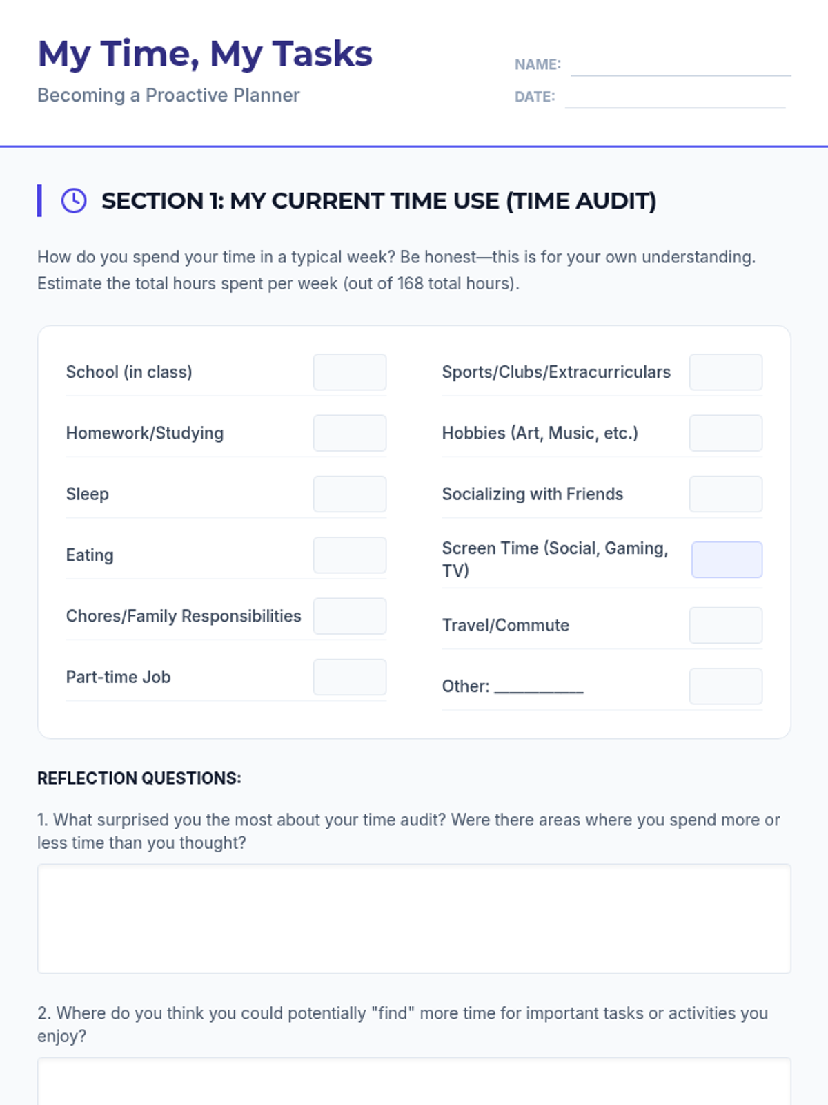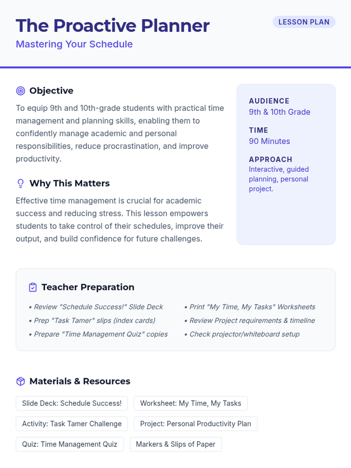 A comprehensive lesson for 9th and 10th-grade students on developing effective time management and planning skills through auditing, prioritization, and task breakdown.