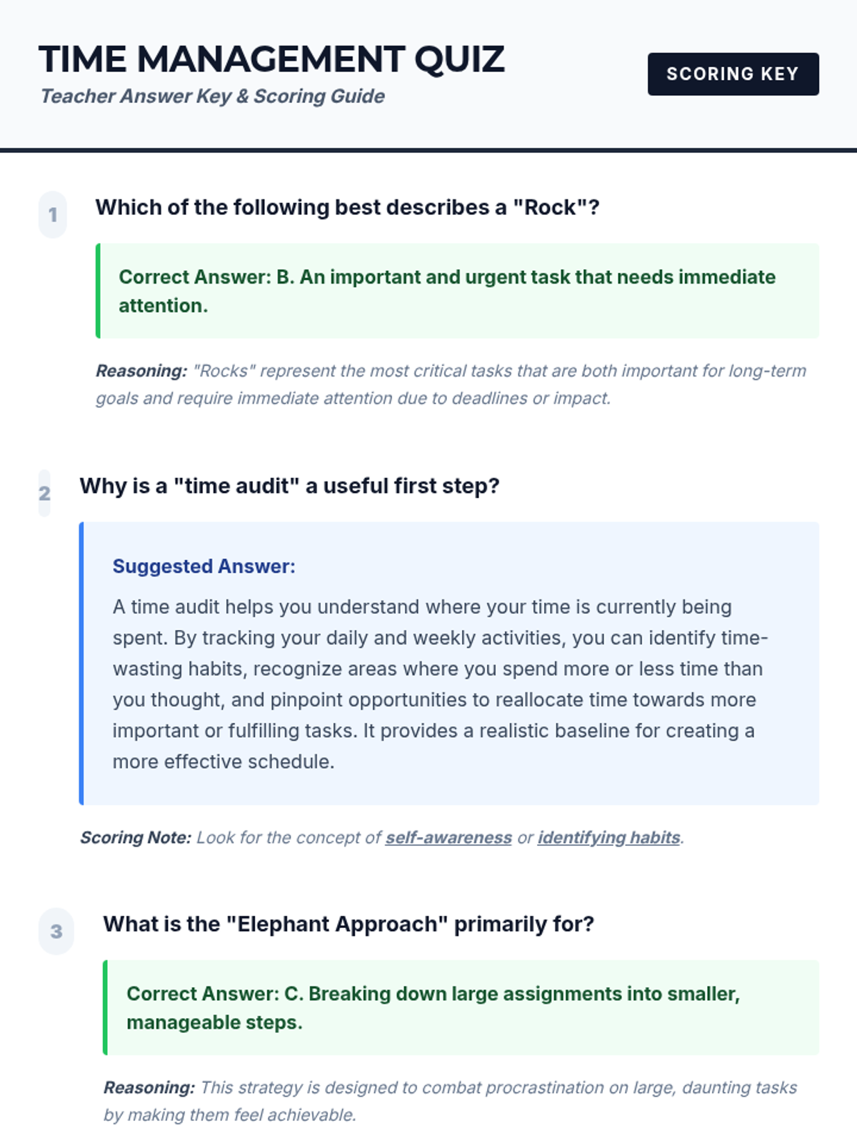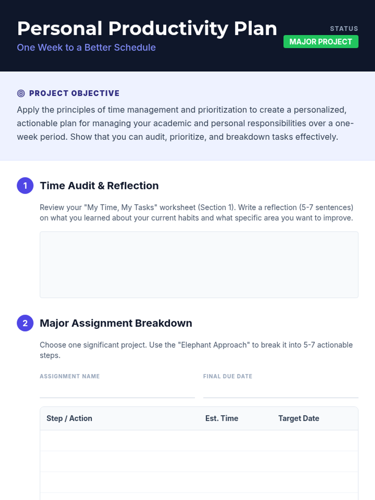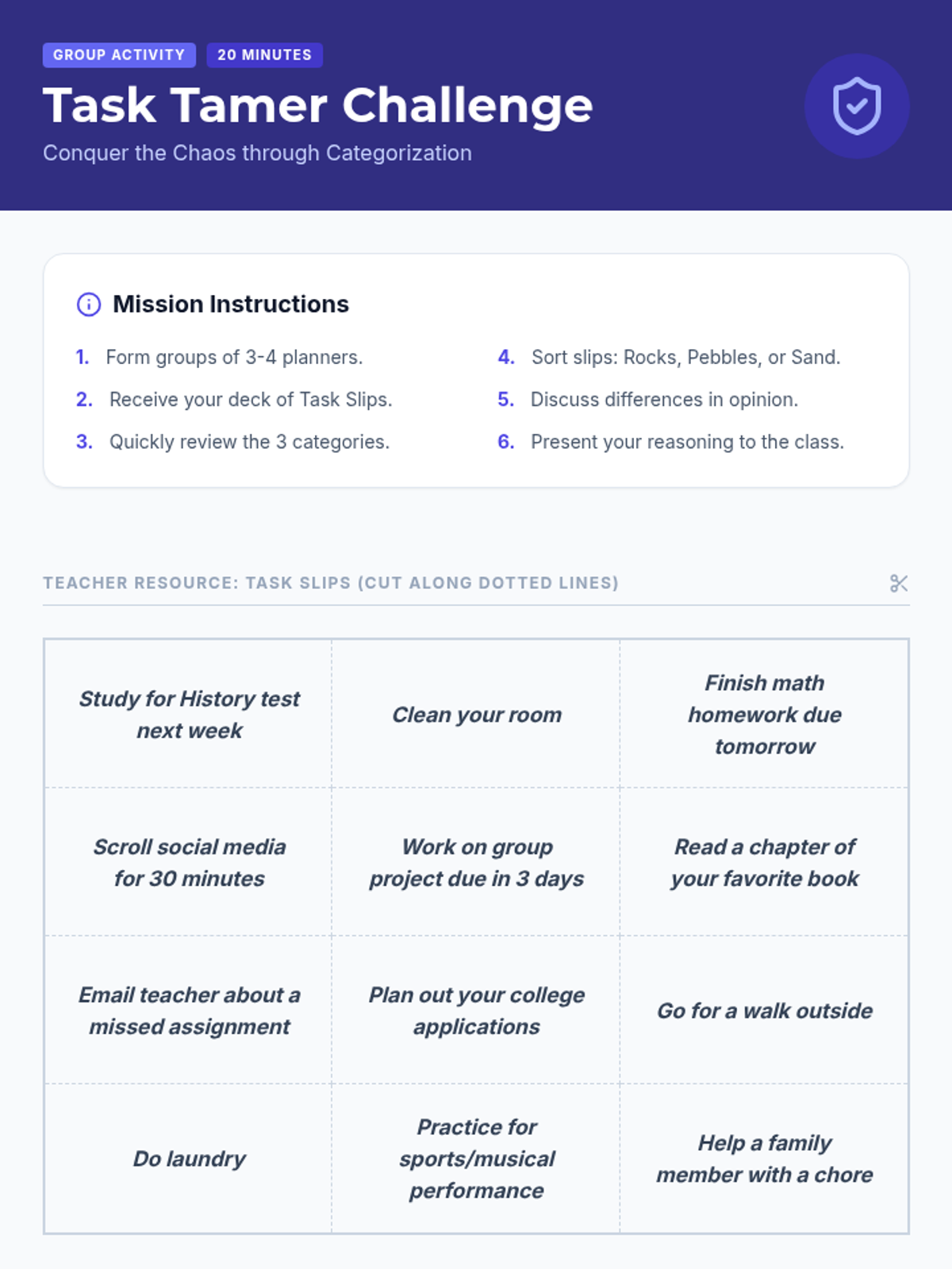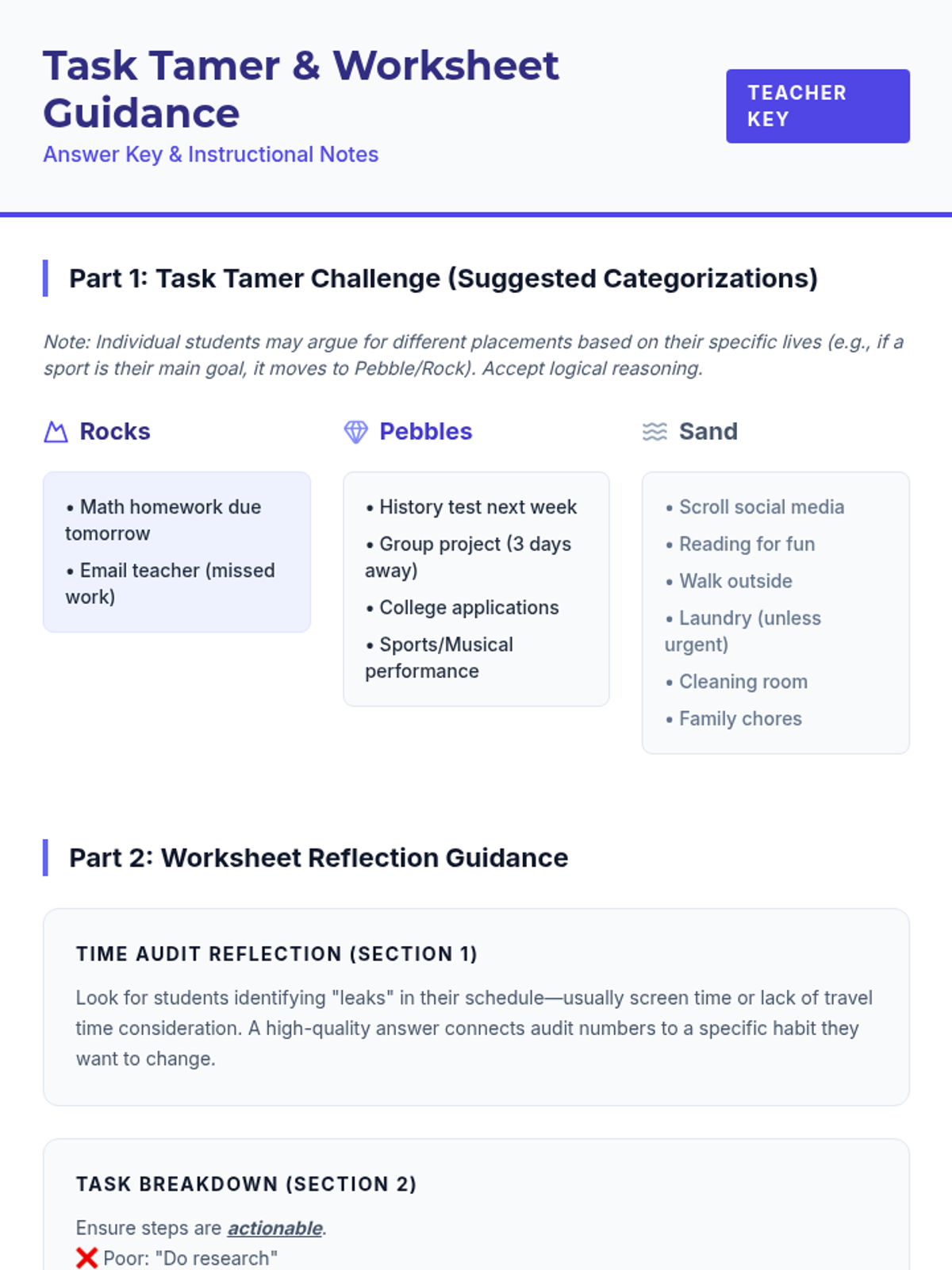 A comprehensive lesson for 9th and 10th-grade students on developing effective time management and planning skills through auditing, prioritization, and task breakdown.