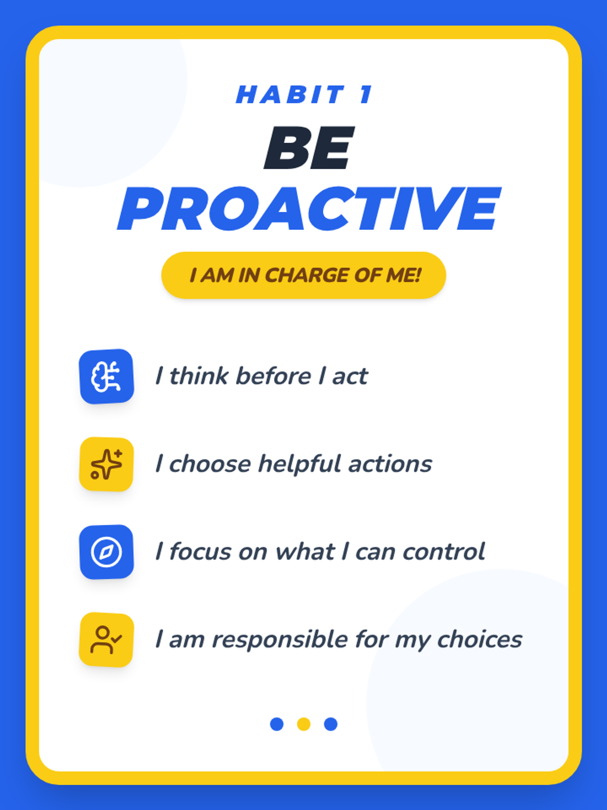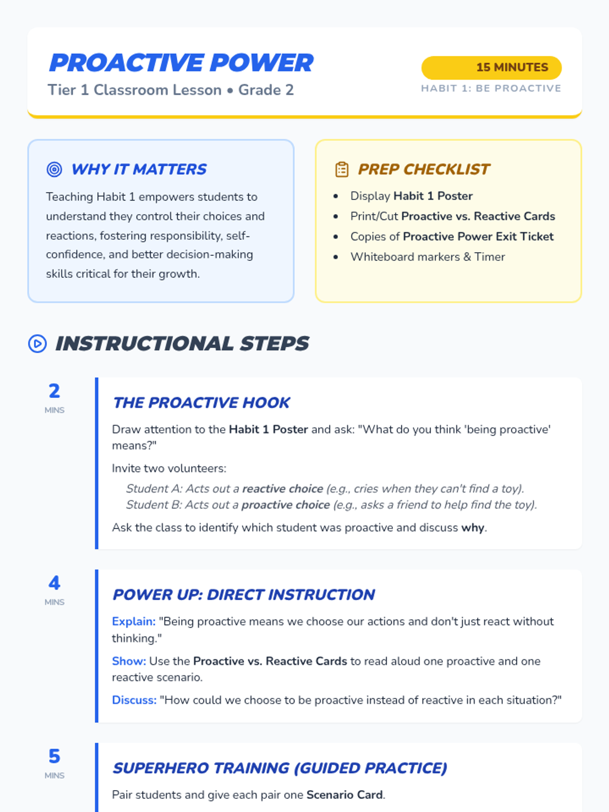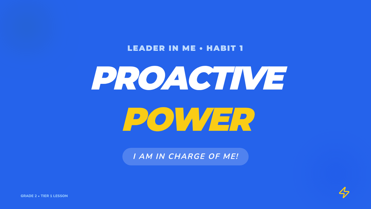 A 15-minute Tier 1 classroom lesson for 2nd graders introducing Leader in Me Habit 1: Being Proactive. Students explore the concept of choice and responsibility through scenarios and role-play.