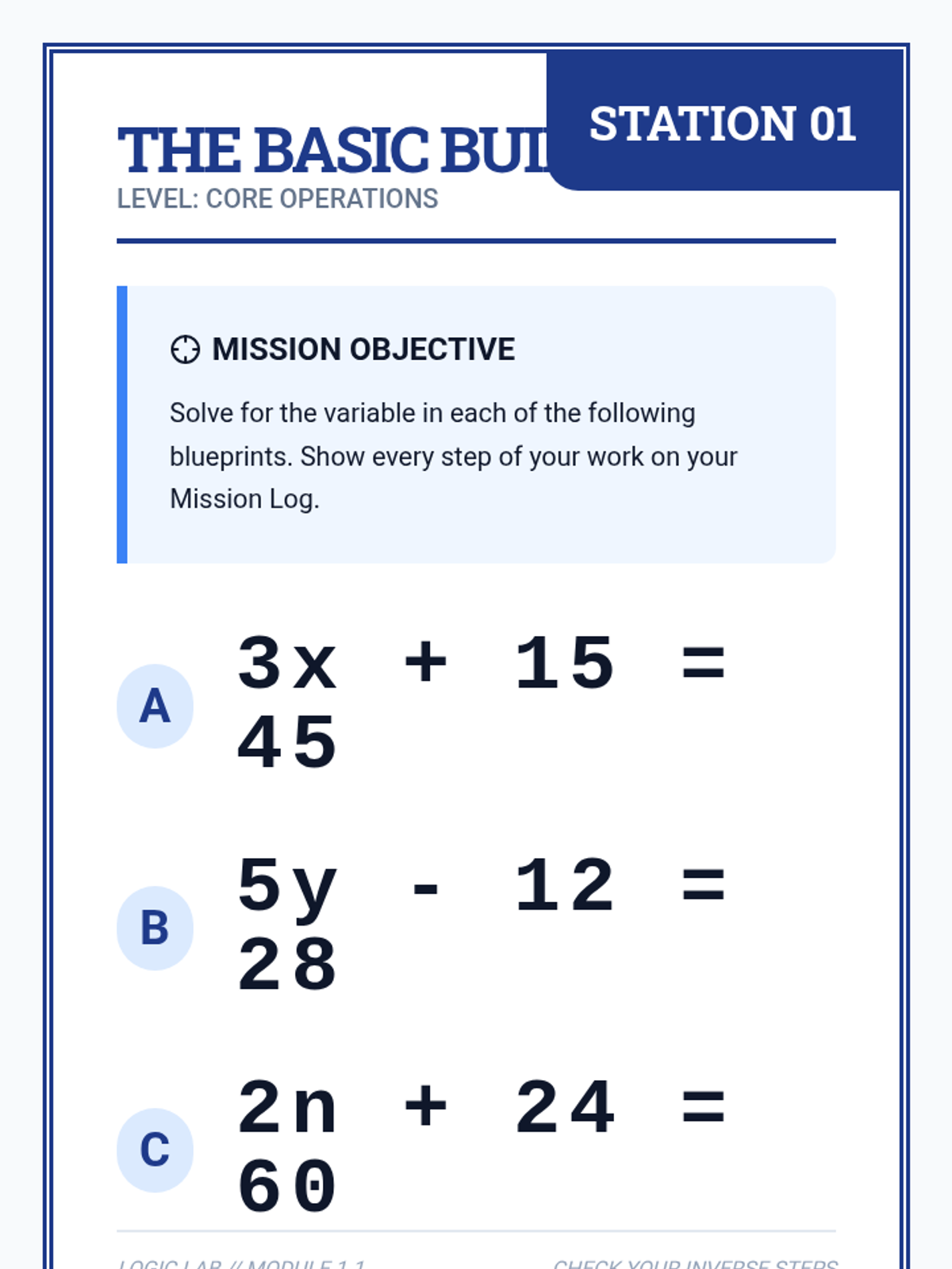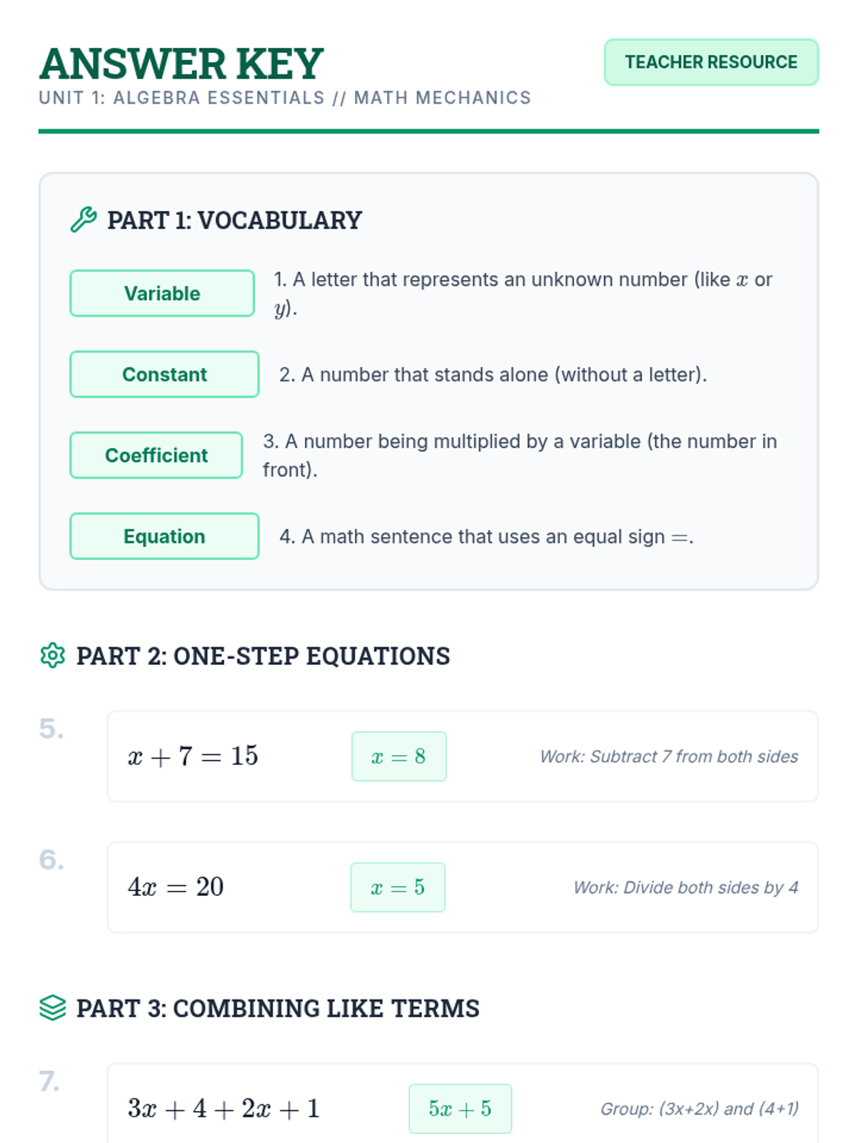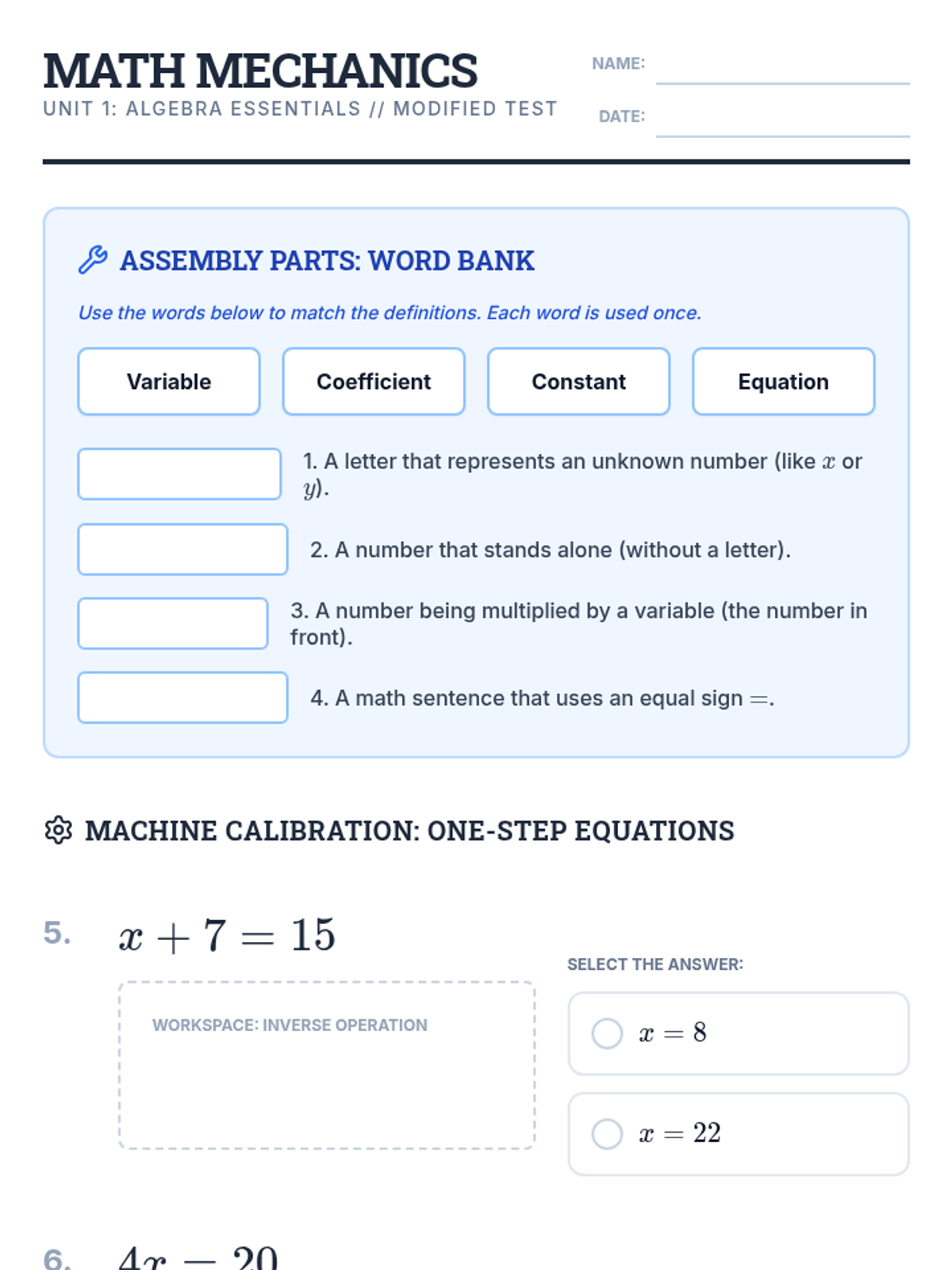 A modified unit test covering one-step equations, combining like terms, and the distributive property using positive whole numbers. Includes visual scaffolds, reduced problem sets, and multiple-choice options to support diverse learners.