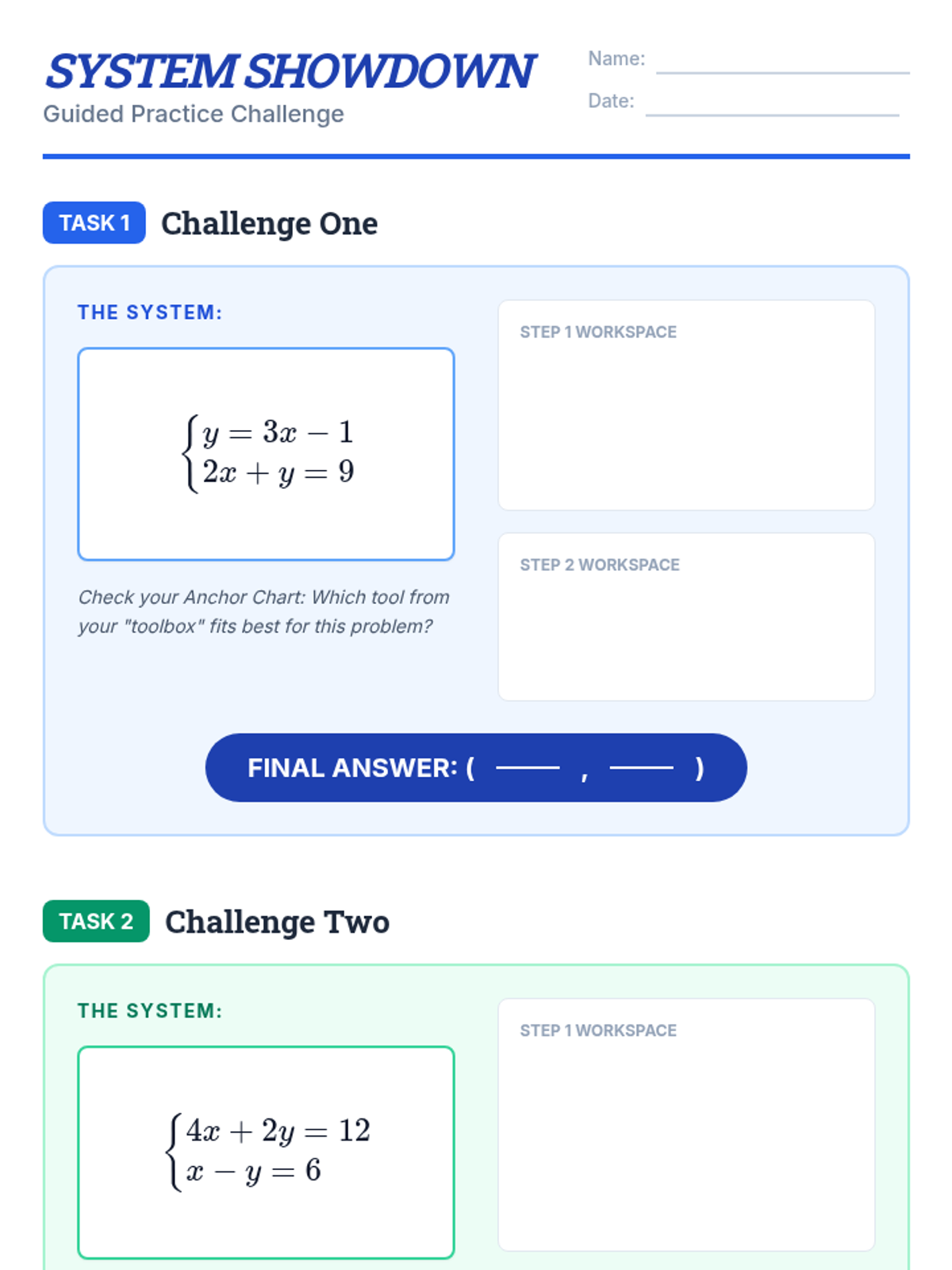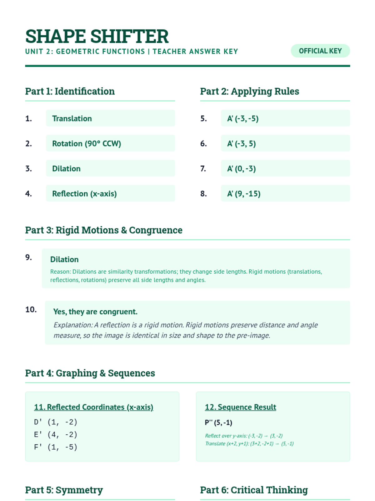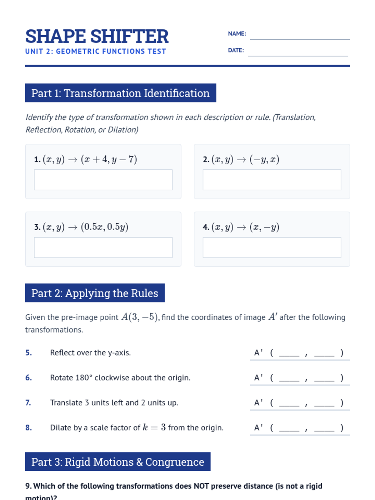 A modified unit test covering one-step equations, combining like terms, and the distributive property using positive whole numbers. Includes visual scaffolds, reduced problem sets, and multiple-choice options to support diverse learners.