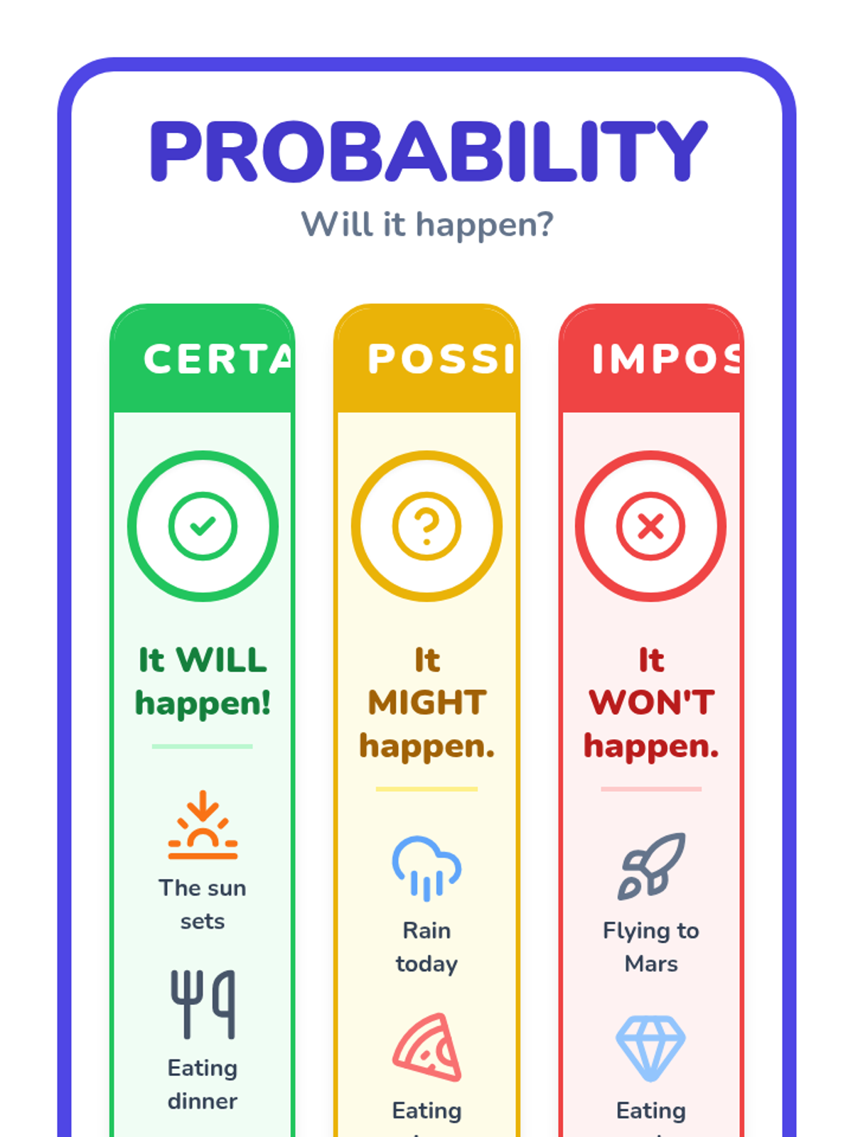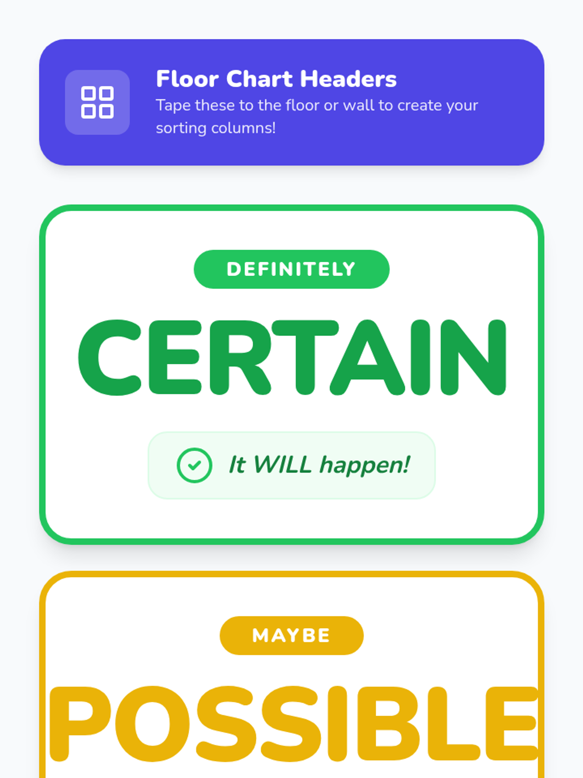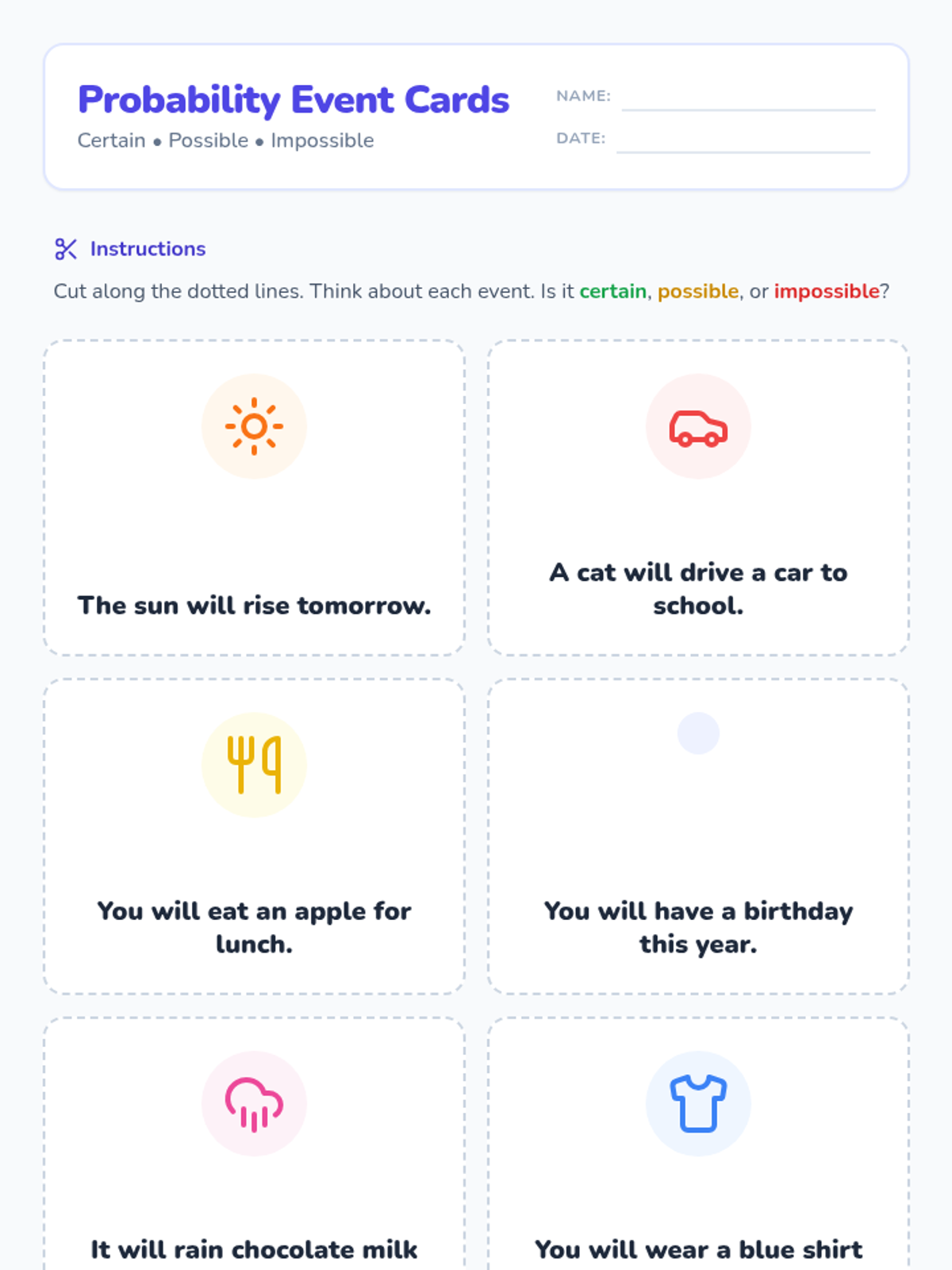 A foundational probability lesson for K-1 students using daily life scenarios to classify events as certain, possible, or impossible. Includes a video-guided discussion, floor sorting activity, and visual anchor charts.