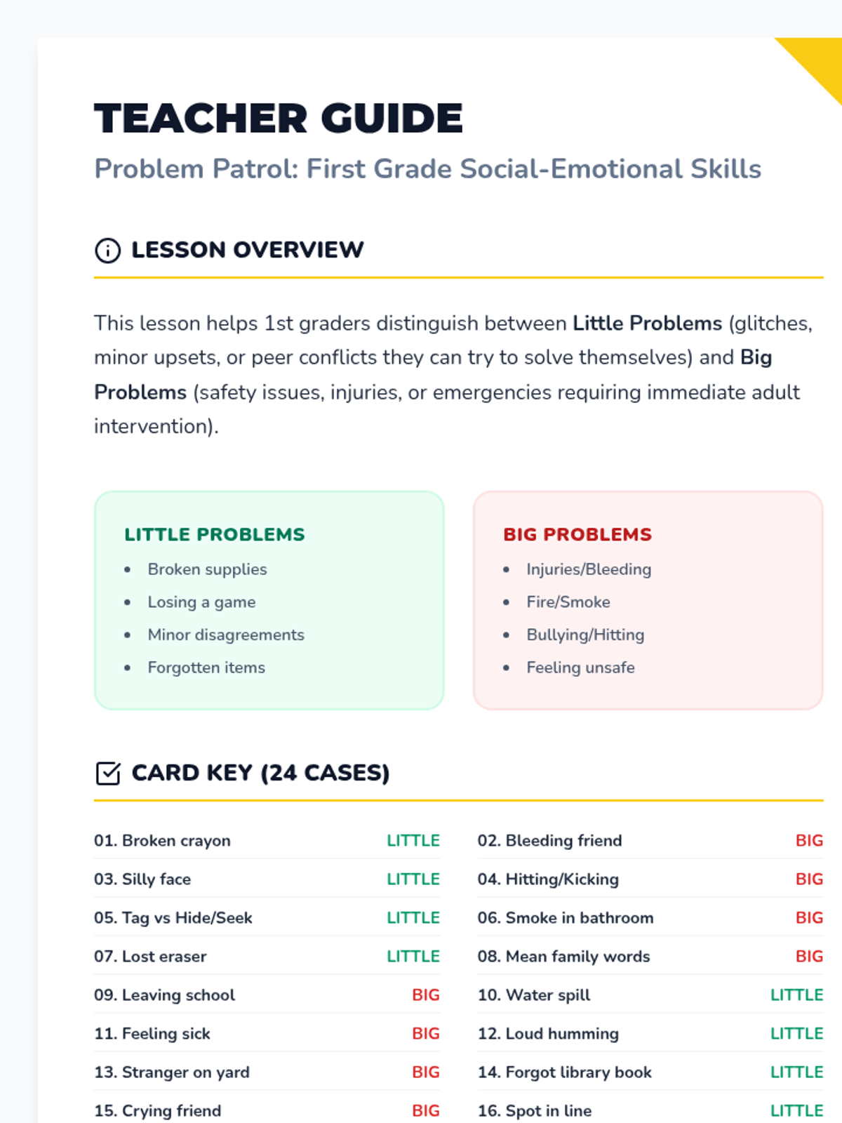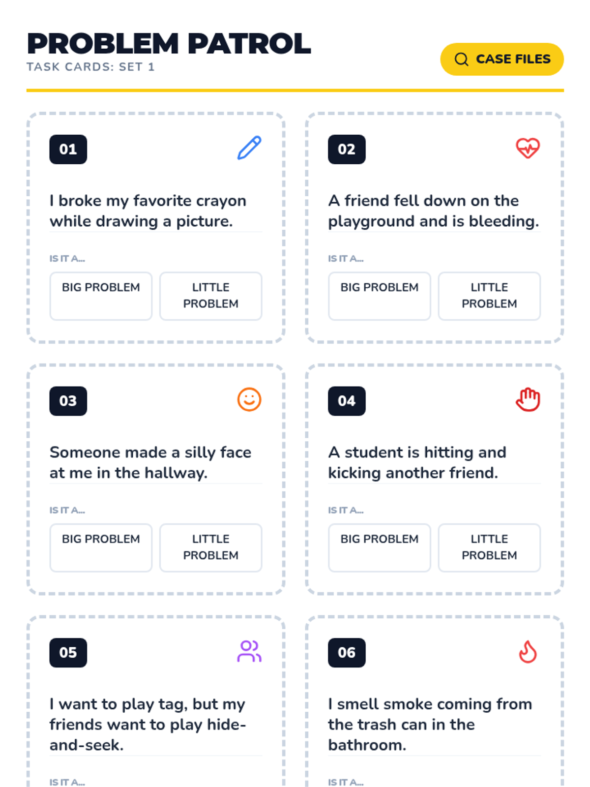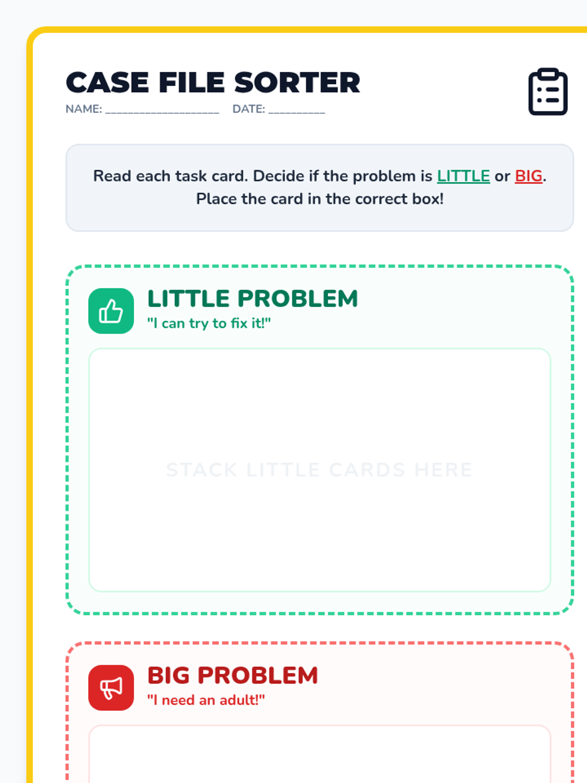 A lesson helping first graders distinguish between minor inconveniences they can solve themselves and major issues requiring adult intervention.