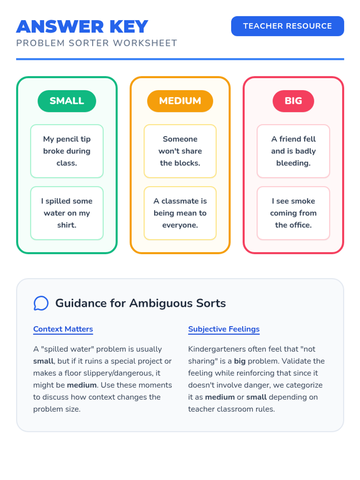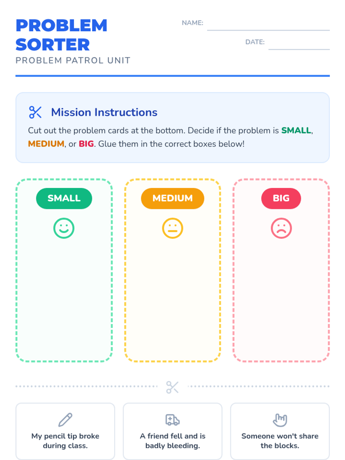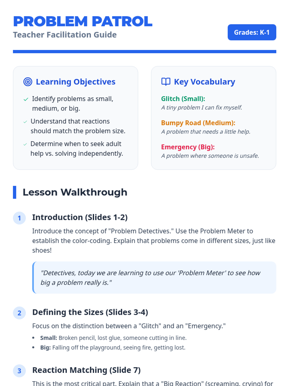 A foundational Social-Emotional Learning lesson for Kindergarten students to identify the 'size' of different problems and match their reactions accordingly. Students will learn to distinguish between small glitches and bigger challenges using a color-coded system.