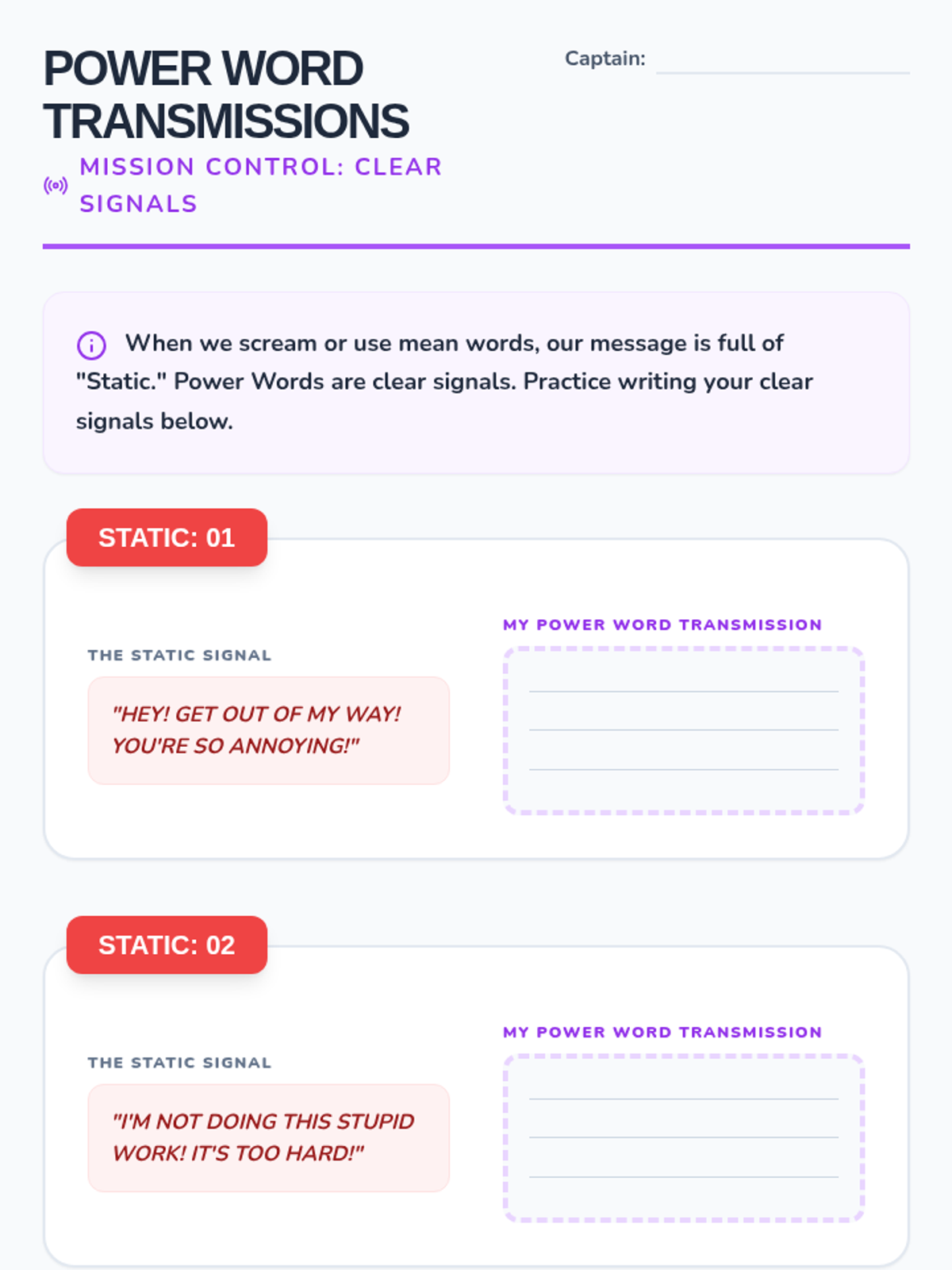 Focuses on calm self-advocacy and using 'Power Words' to express dislikes or frustrations without resorting to shouting or threats.