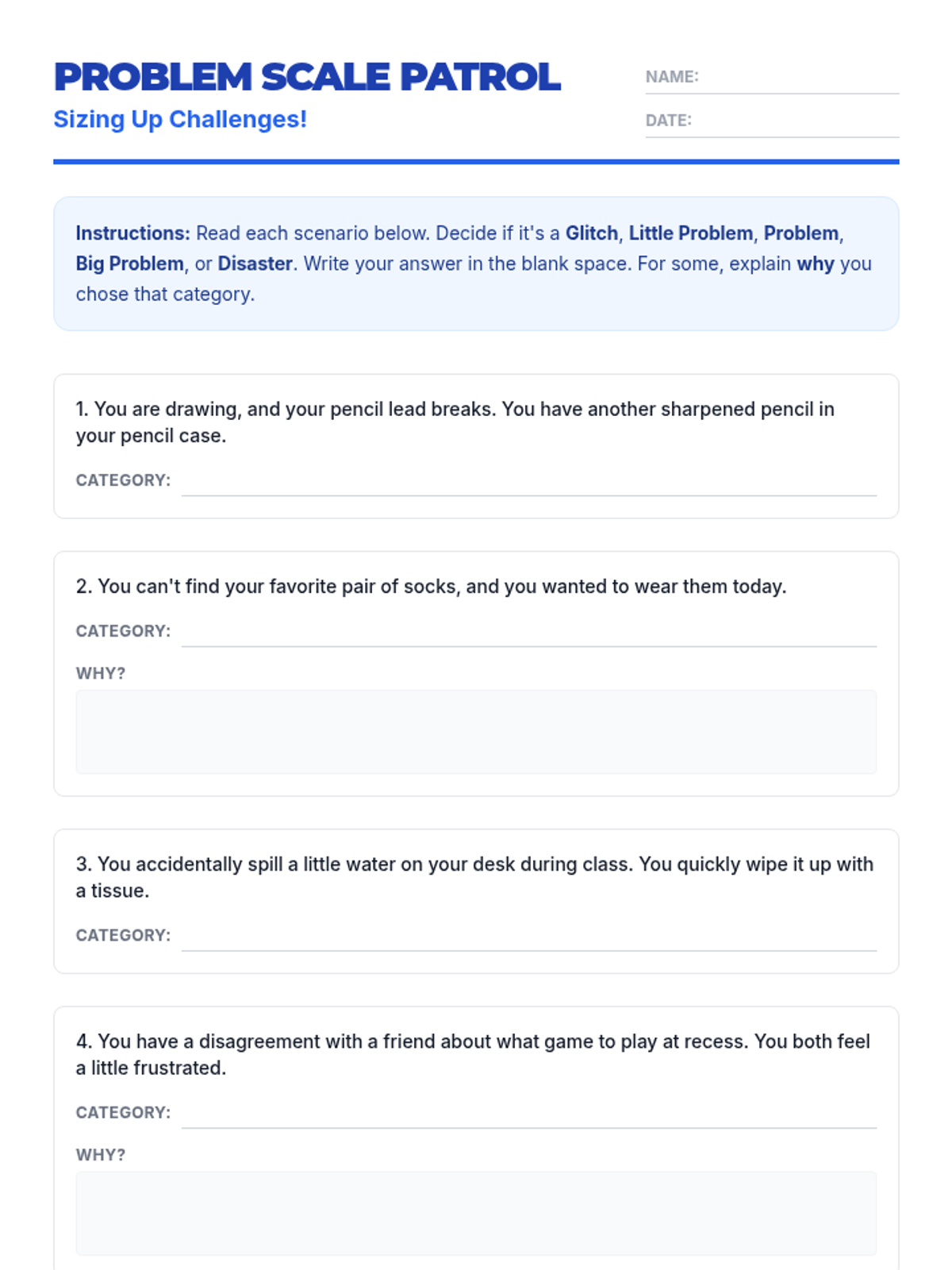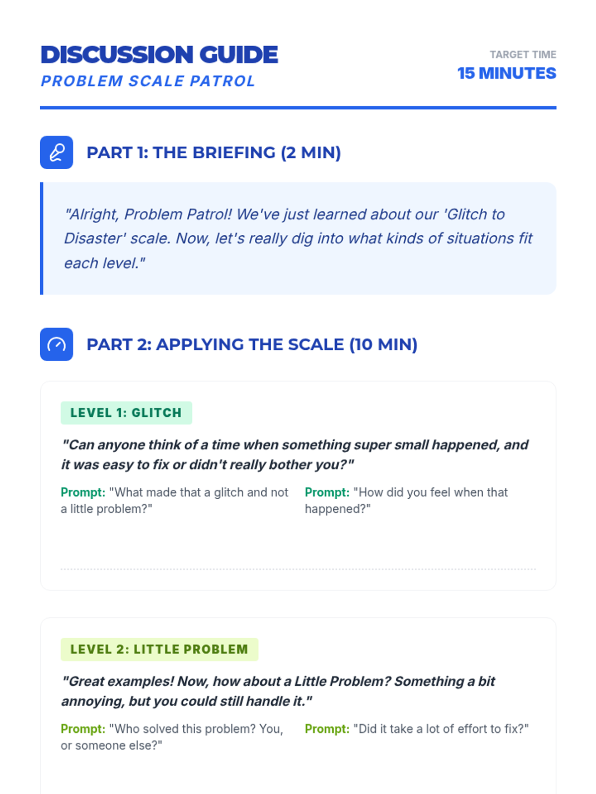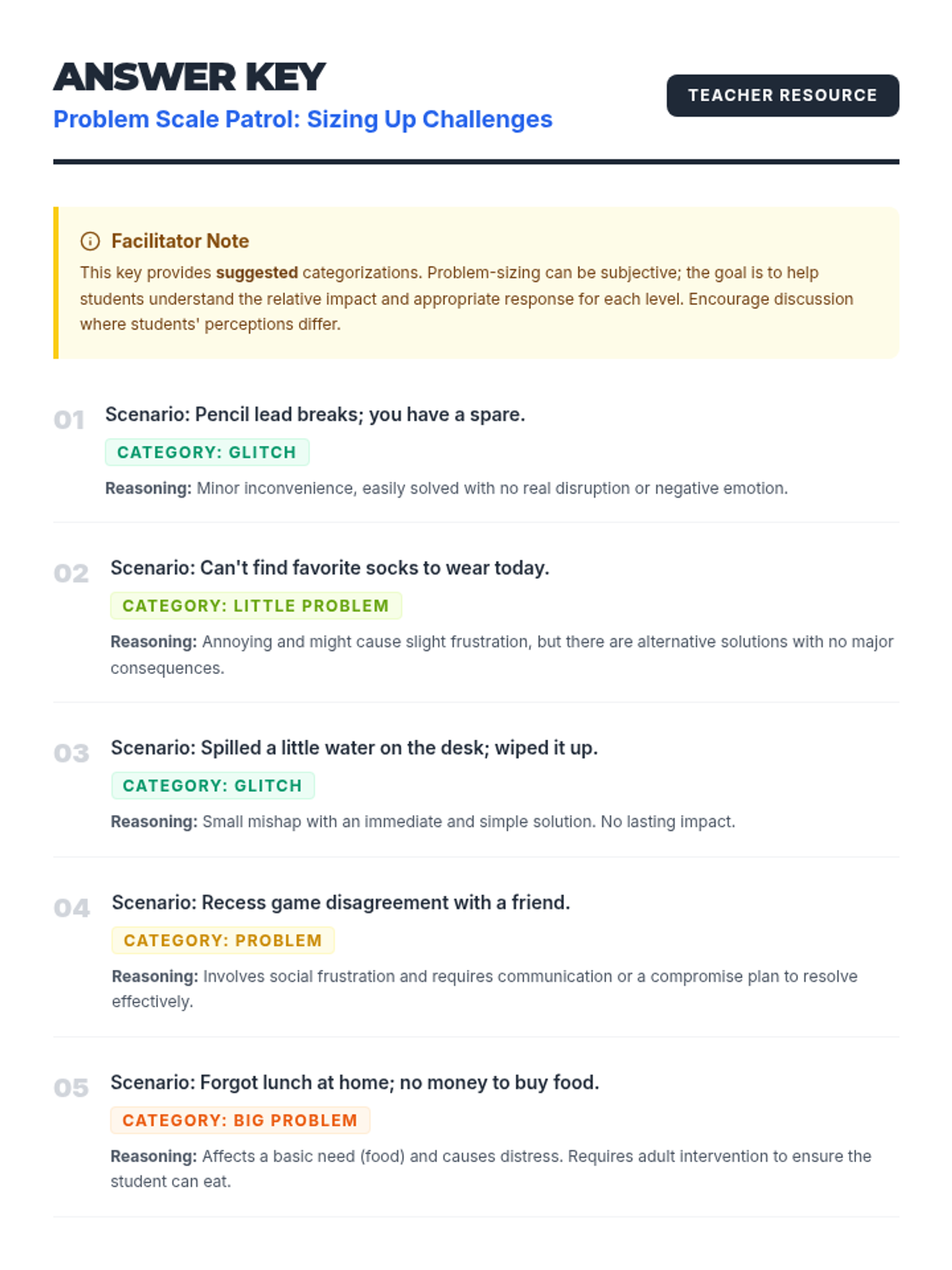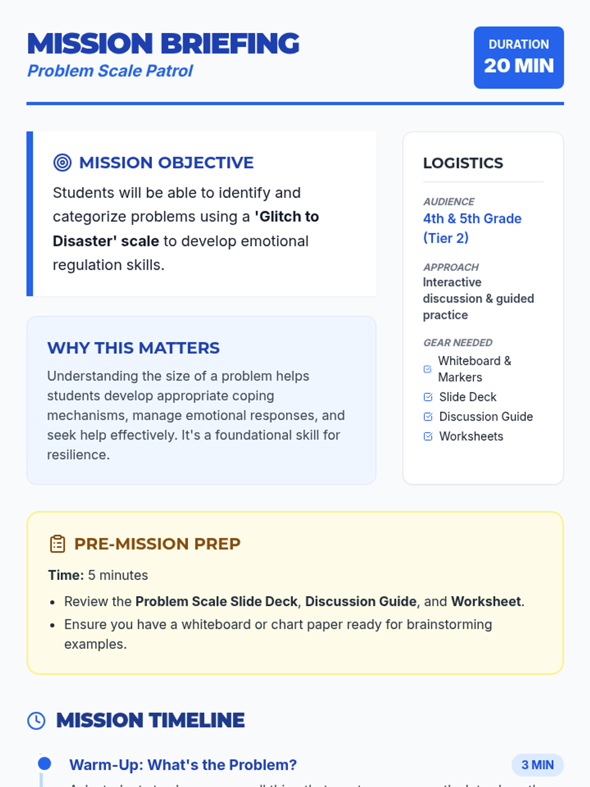 This 20-minute Tier 2 lesson helps 4th and 5th graders identify the size of problems using a 'Glitch to Disaster' scale to develop effective coping strategies.