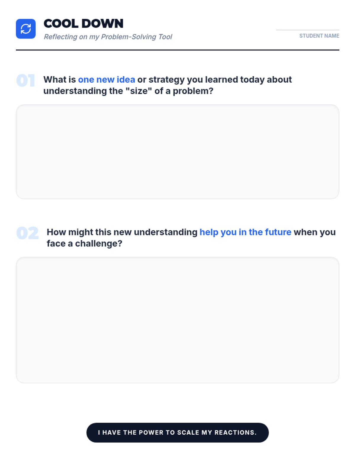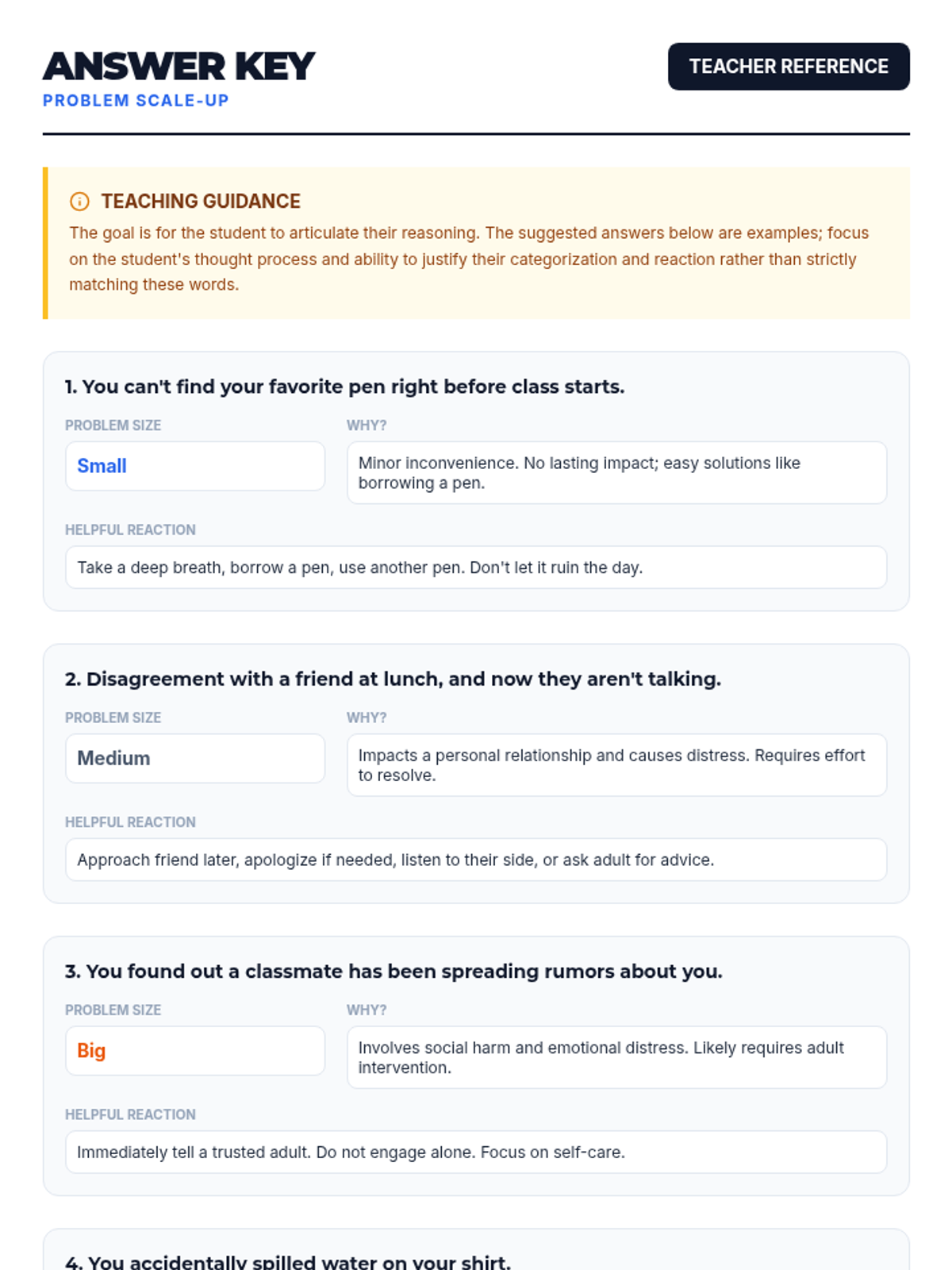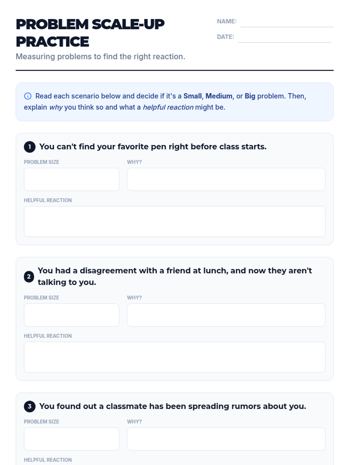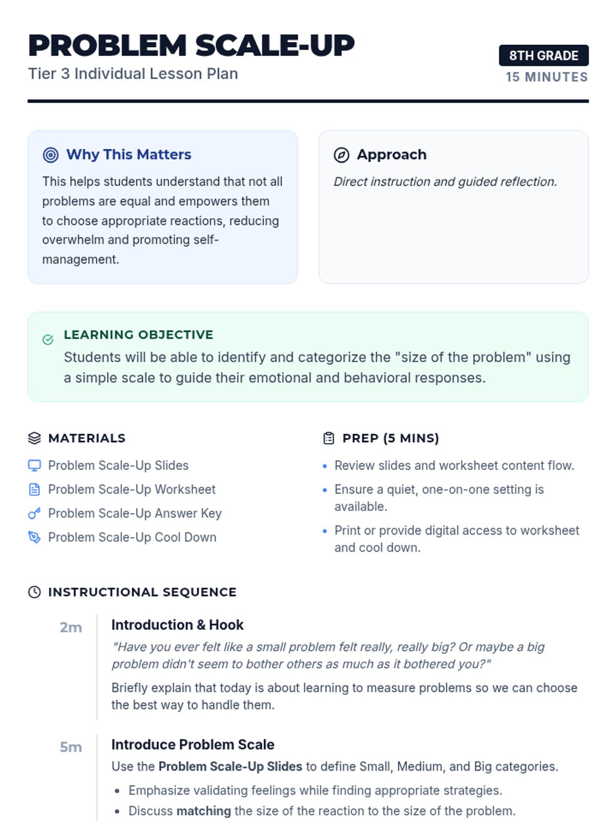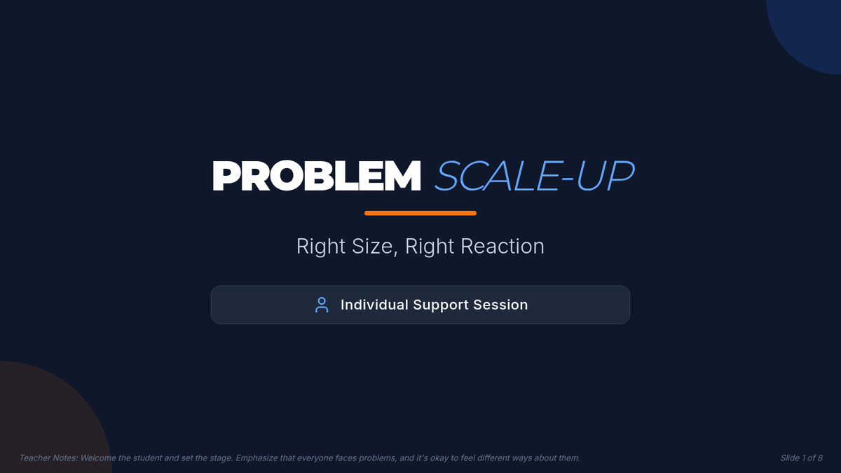 A 15-minute Tier 3 individual lesson for 8th graders to categorize the 'size of the problem' and match emotional responses accordingly. Students learn to distinguish between small hiccups and major life events to foster self-regulation and independence.