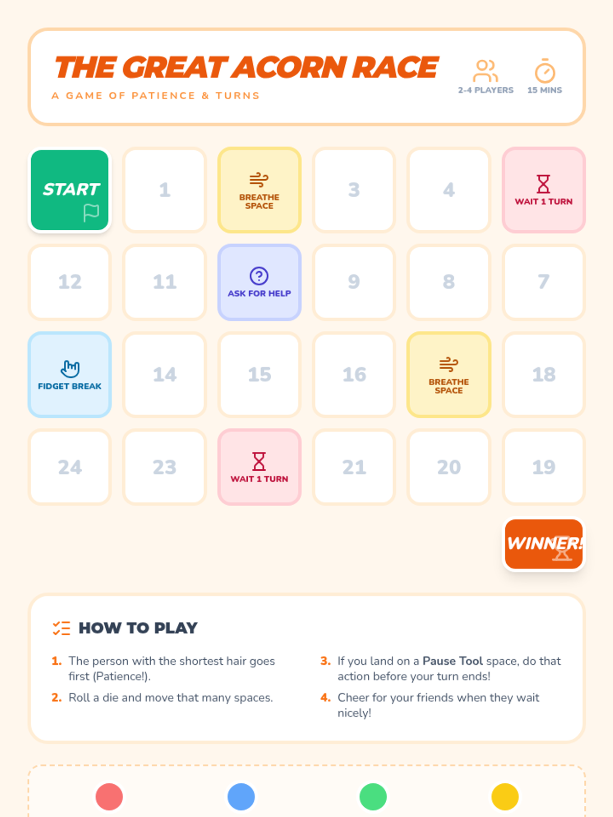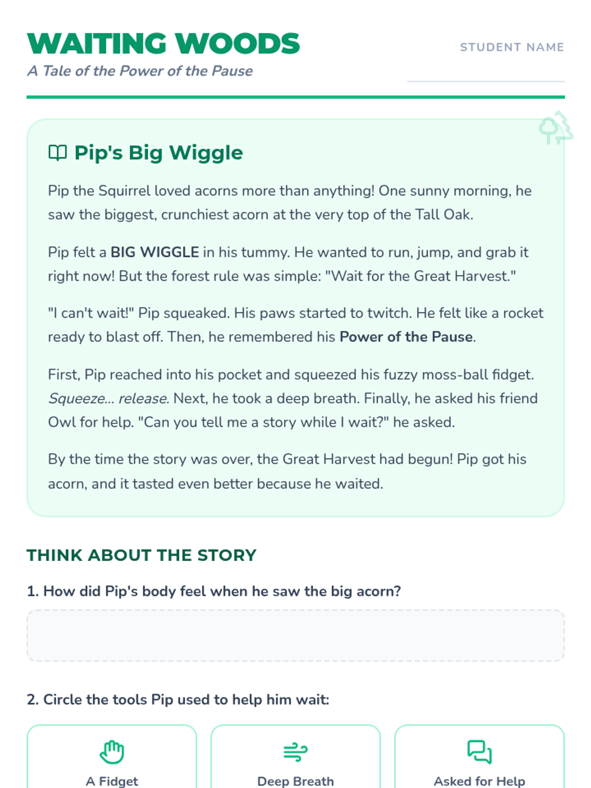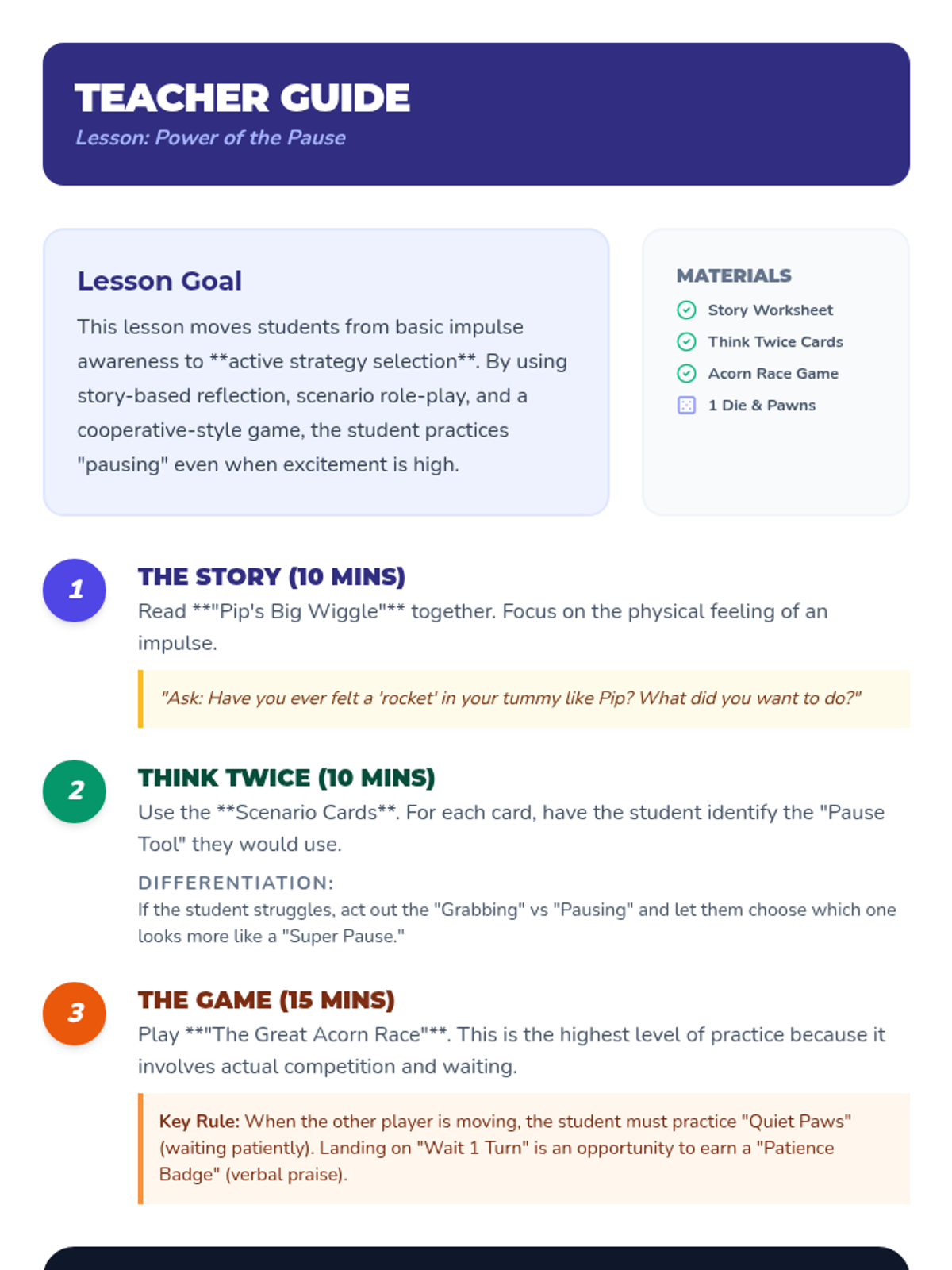 A social-emotional learning lesson focused on impulse control for first graders, teaching the 'Power of the Pause' through storytelling, discussion, and a turn-taking game.