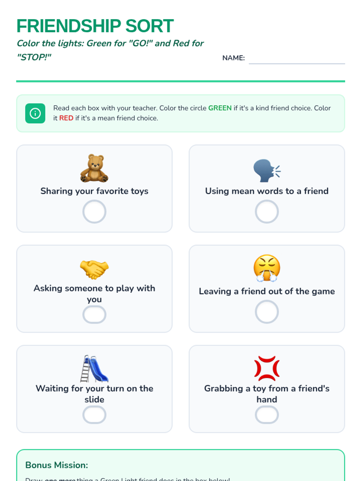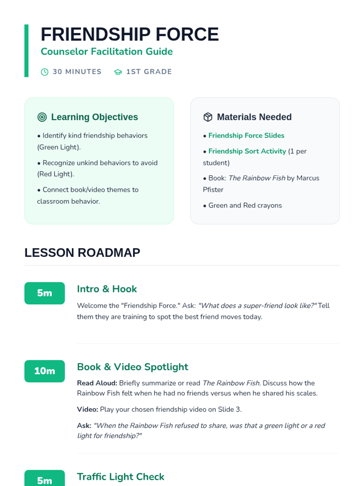 A high-energy, 30-minute guidance lesson for 1st graders focused on the social skills needed to initiate and maintain healthy friendships through simple 'Green Light' actions.
