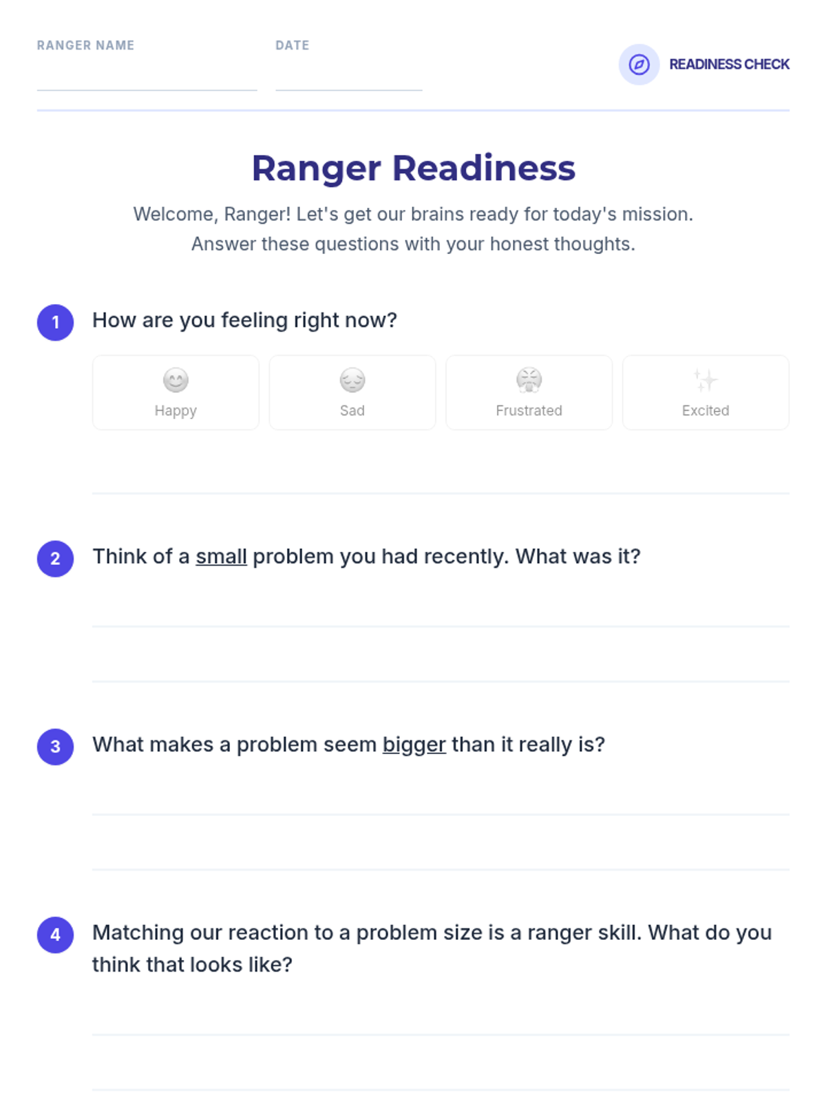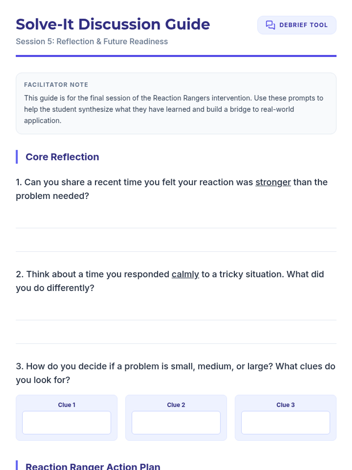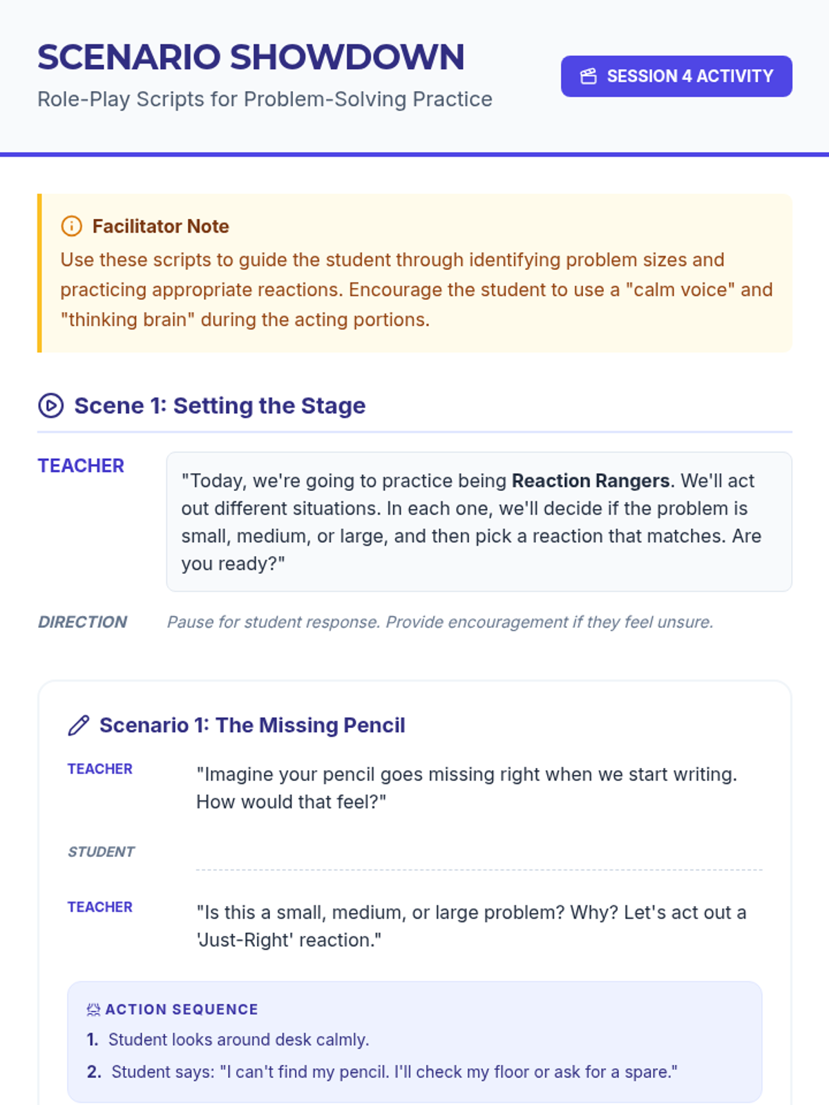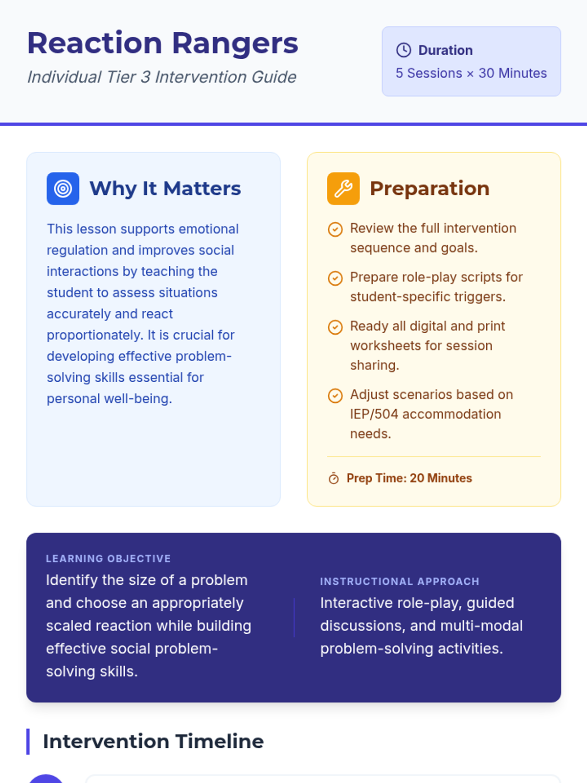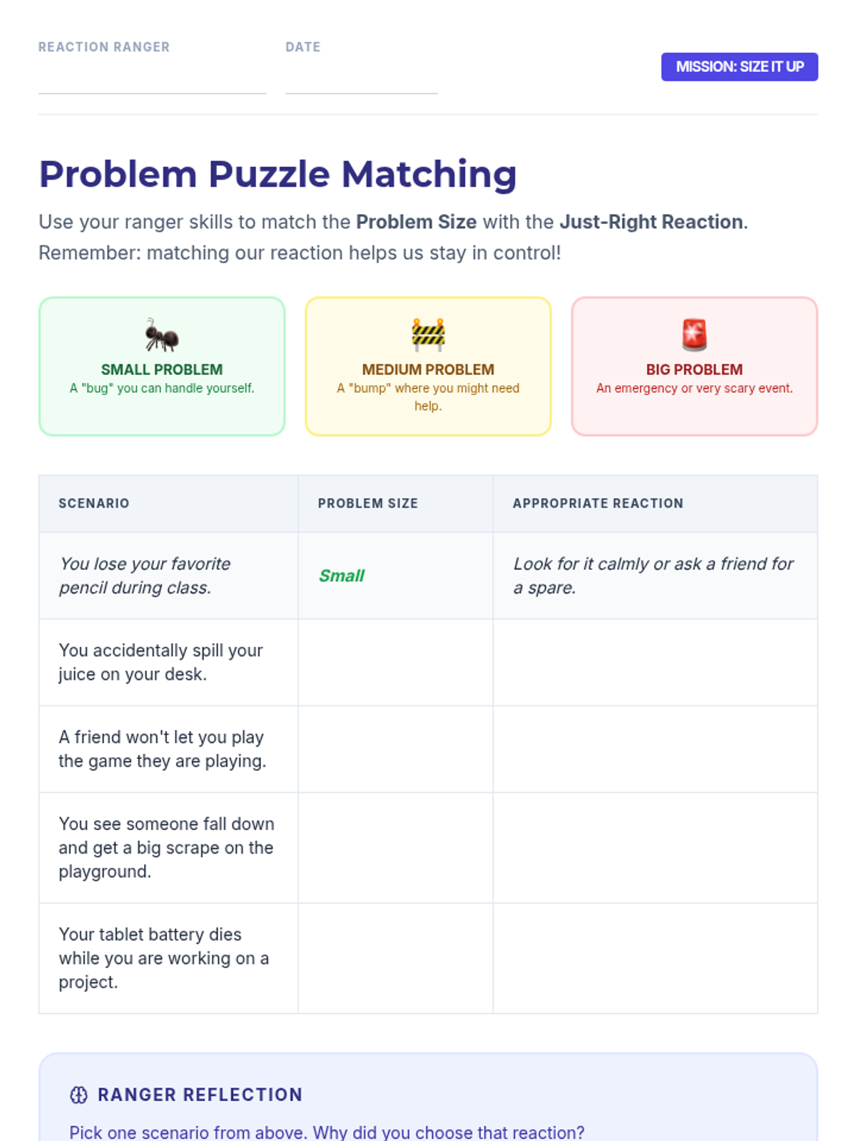 A comprehensive 5-session Tier 3 intervention for 1st-grade students to learn emotional regulation by matching problem sizes with appropriate reactions through role-play, discussion, and guided practice.
