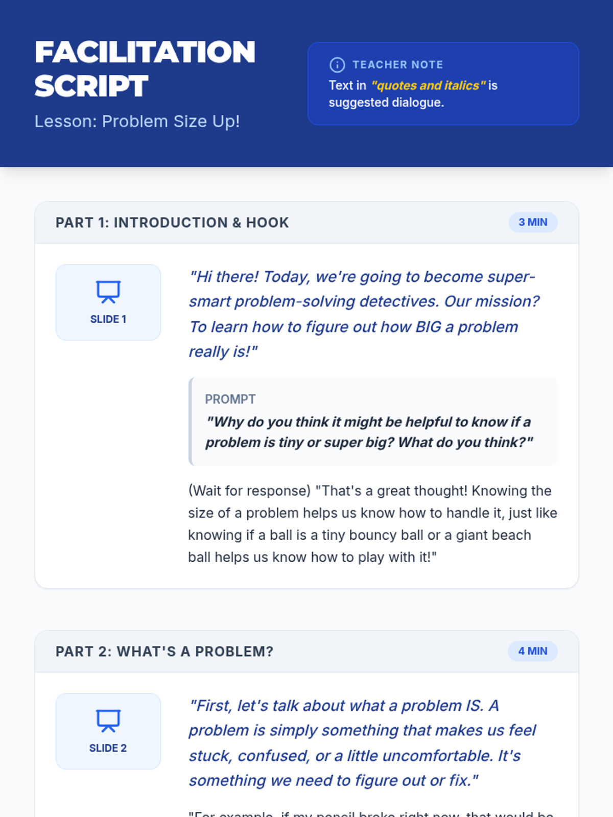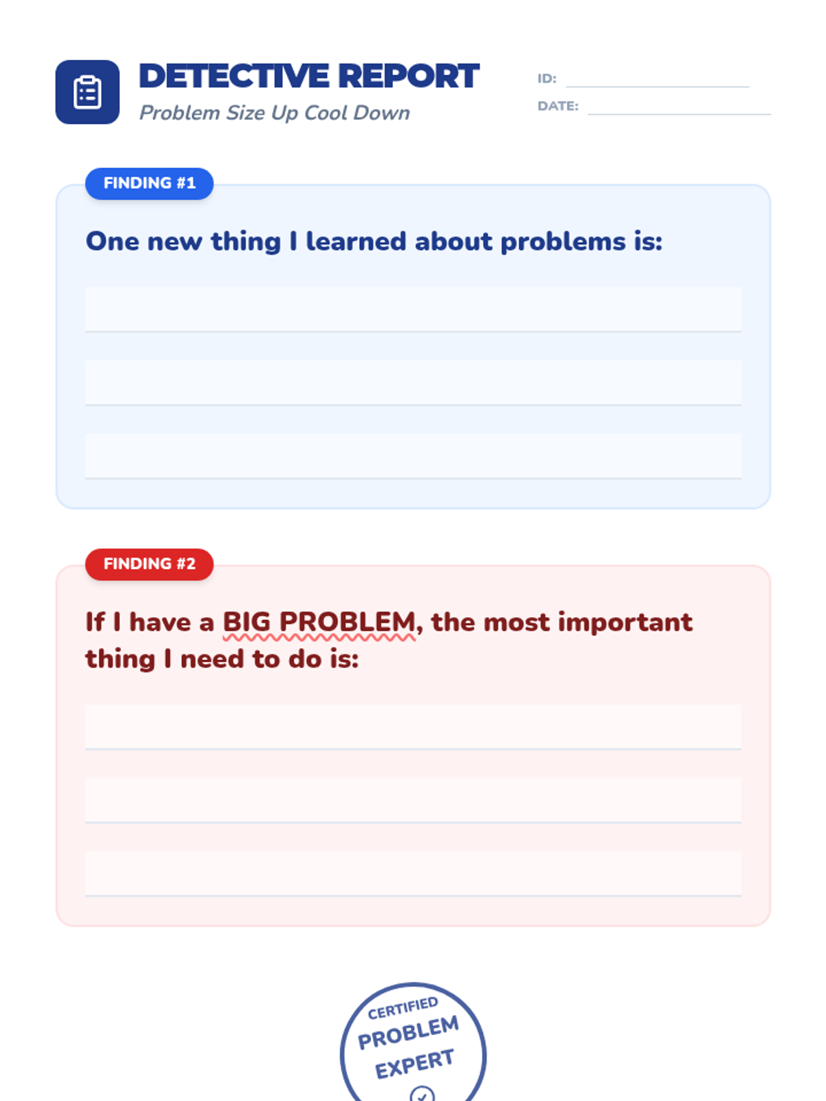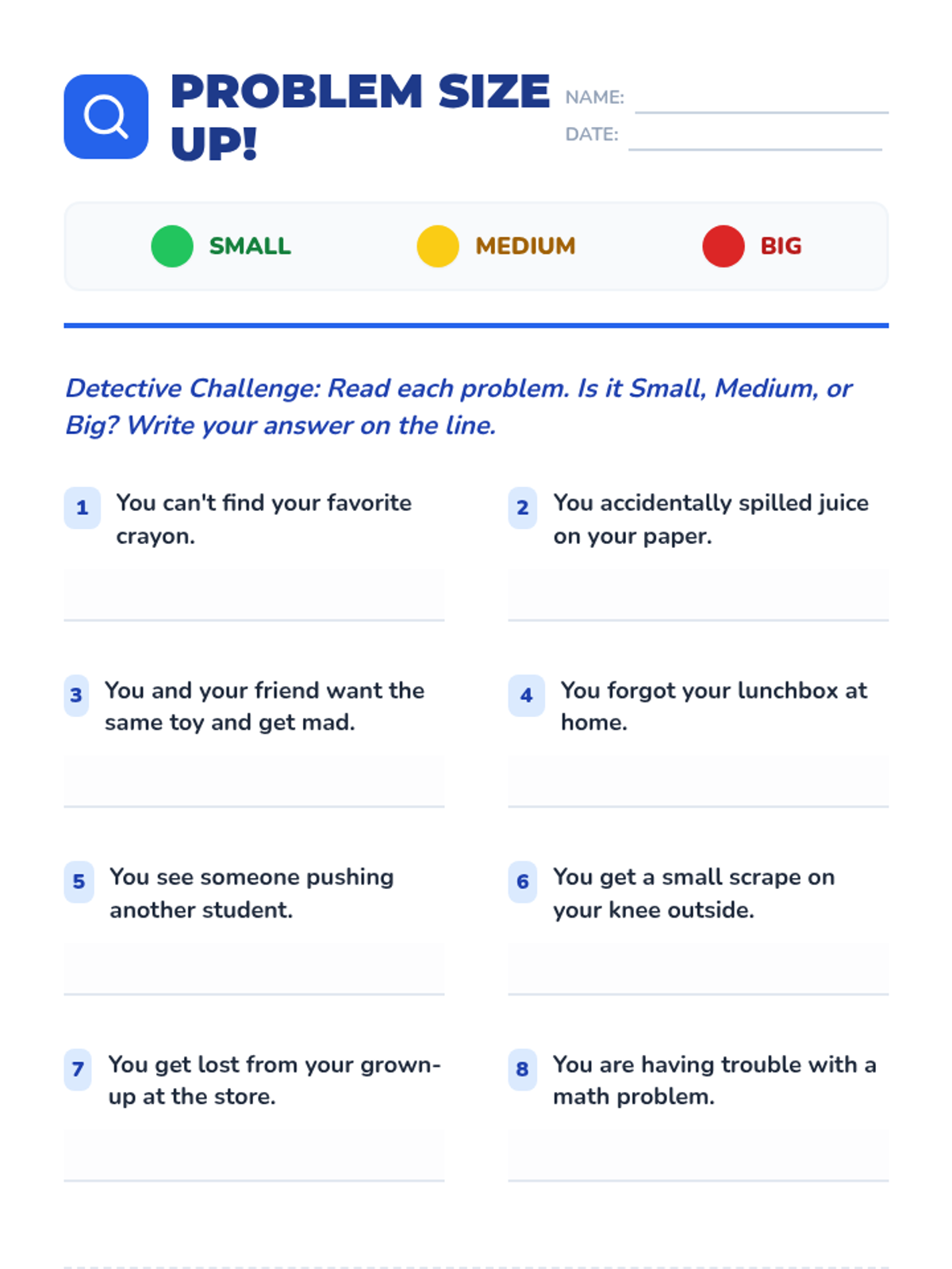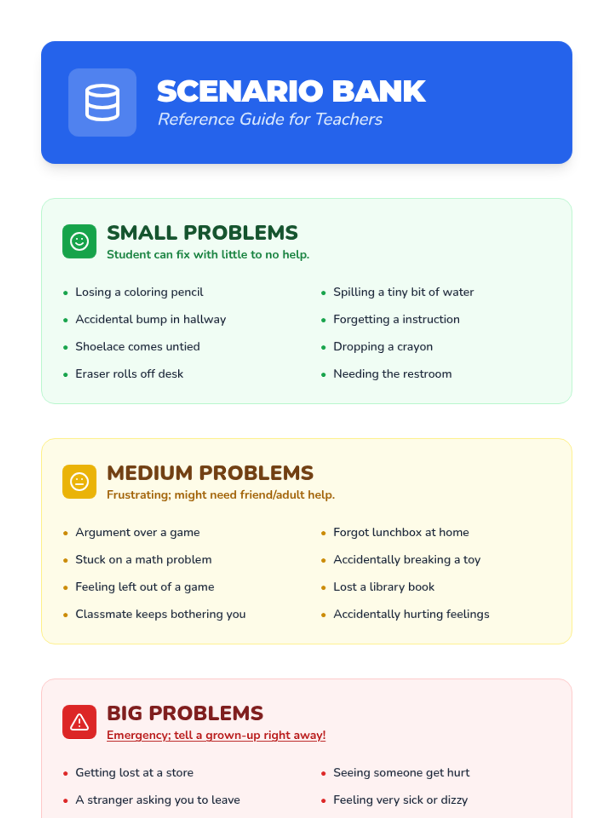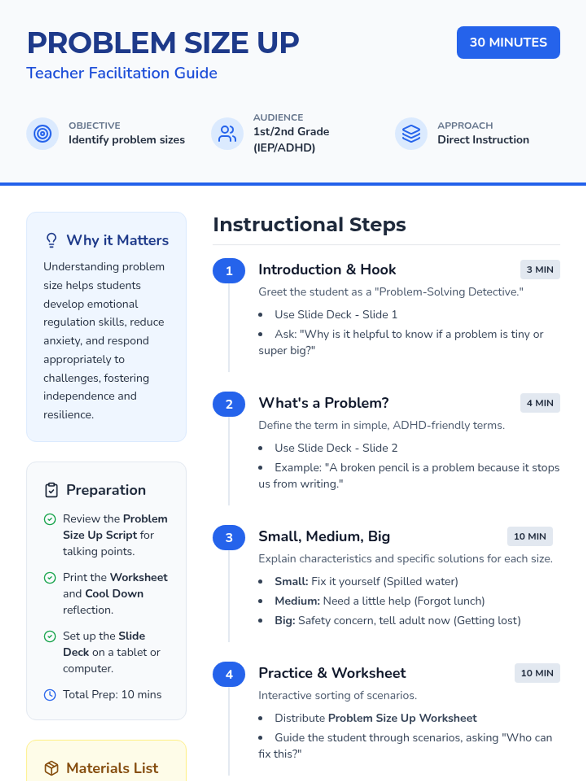 A 30-minute individualized lesson for 1st and 2nd graders with IEPs and ADHD to identify 'small,' 'medium,' and 'big' problems and learn appropriate responses.