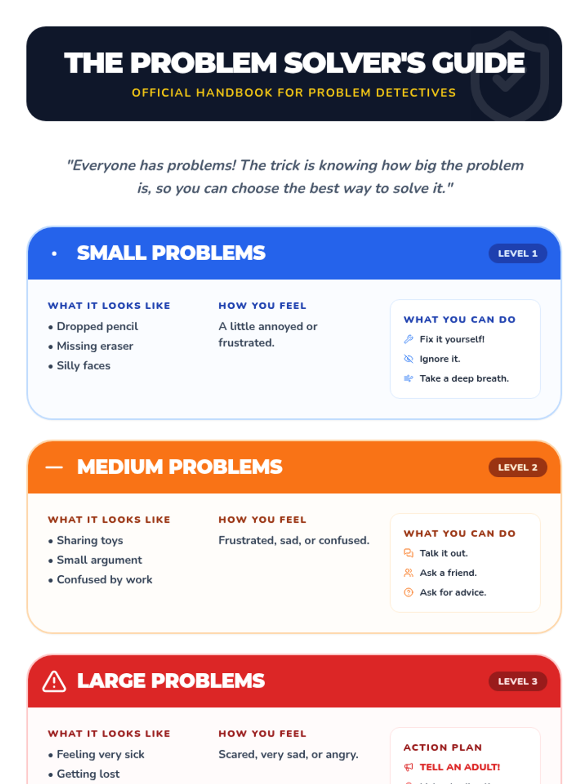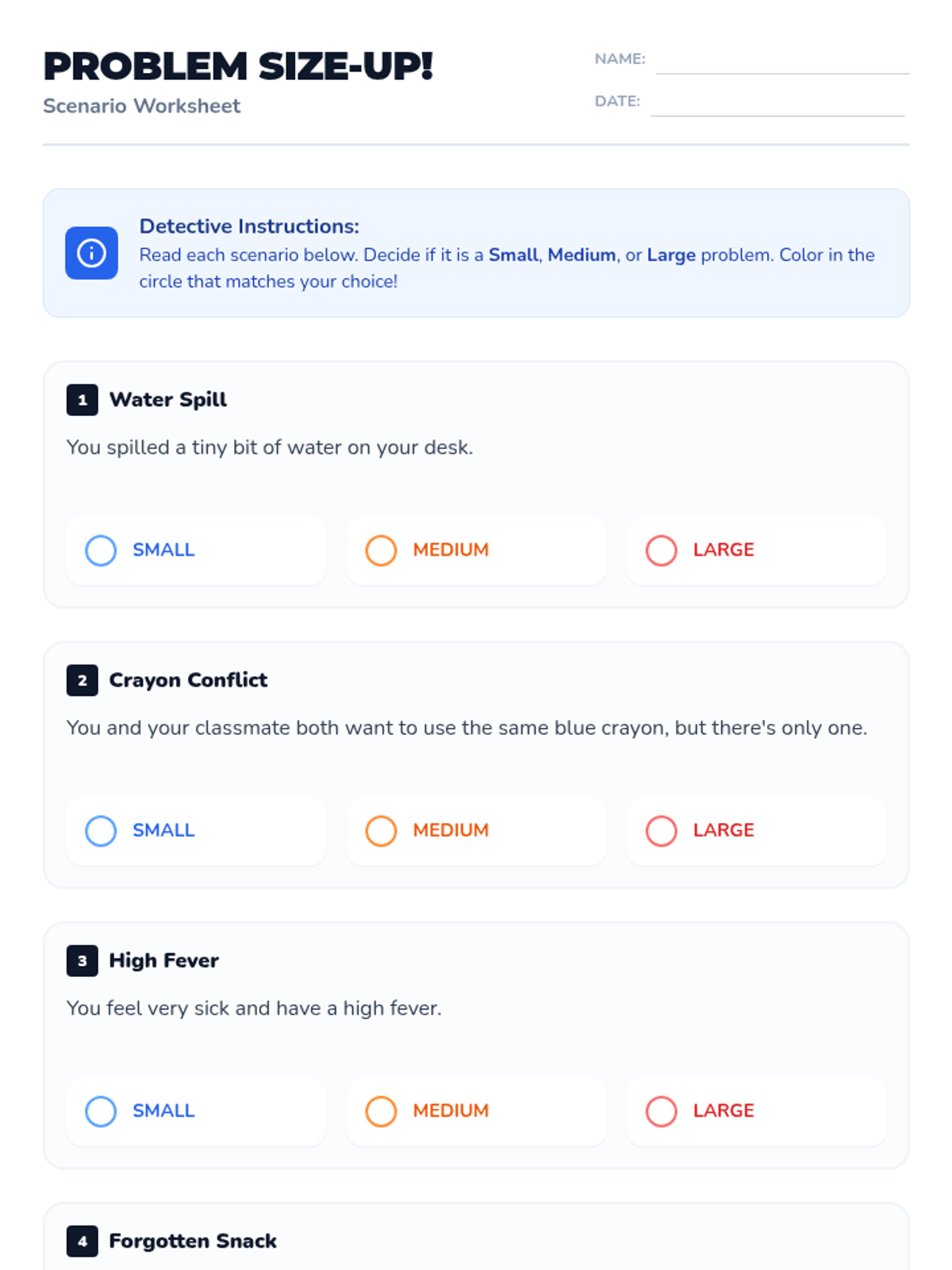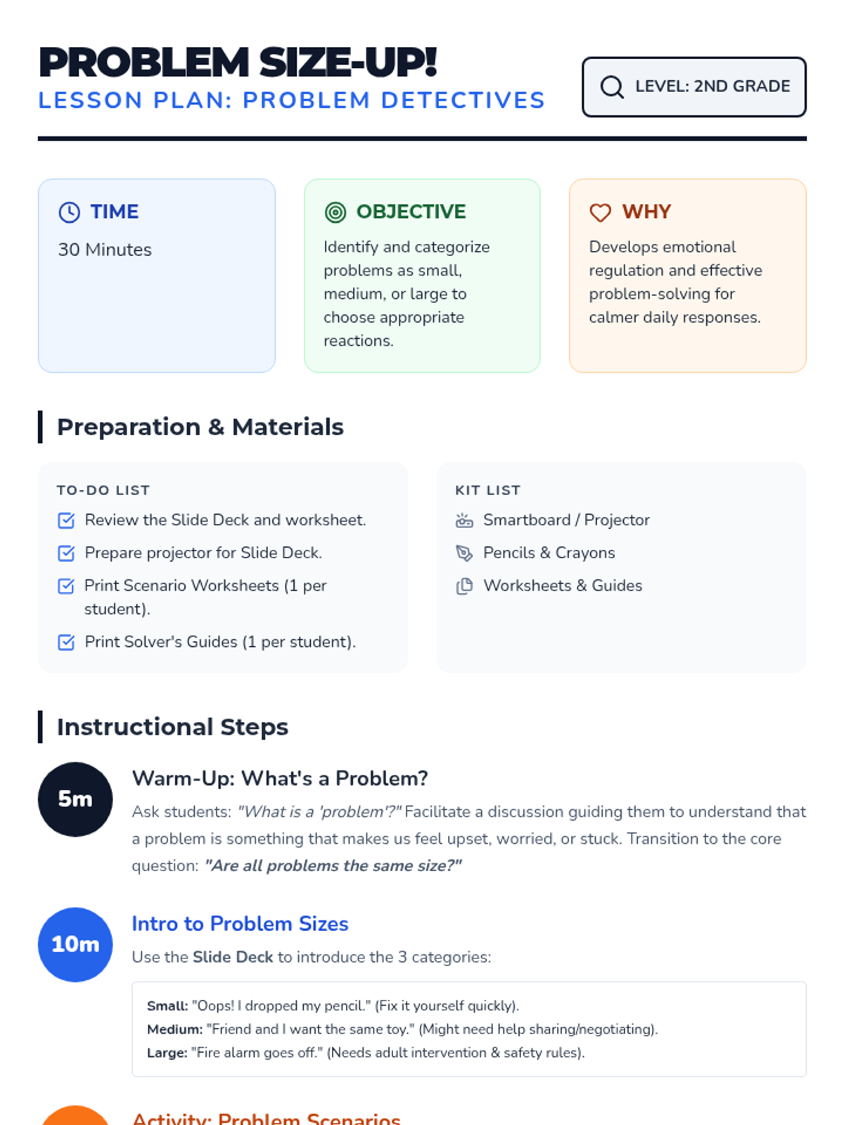 This lesson teaches 2nd-grade students to identify and categorize problems based on their size (small, medium, large). Understanding problem size helps students choose appropriate reactions and coping strategies, fostering emotional regulation and problem-solving skills.