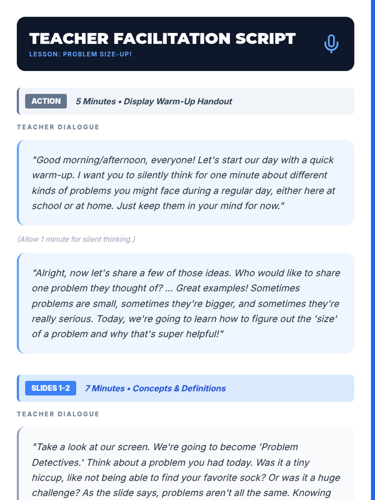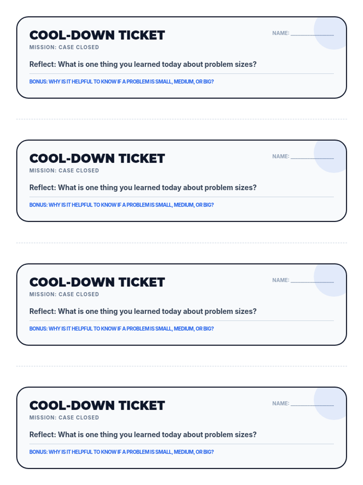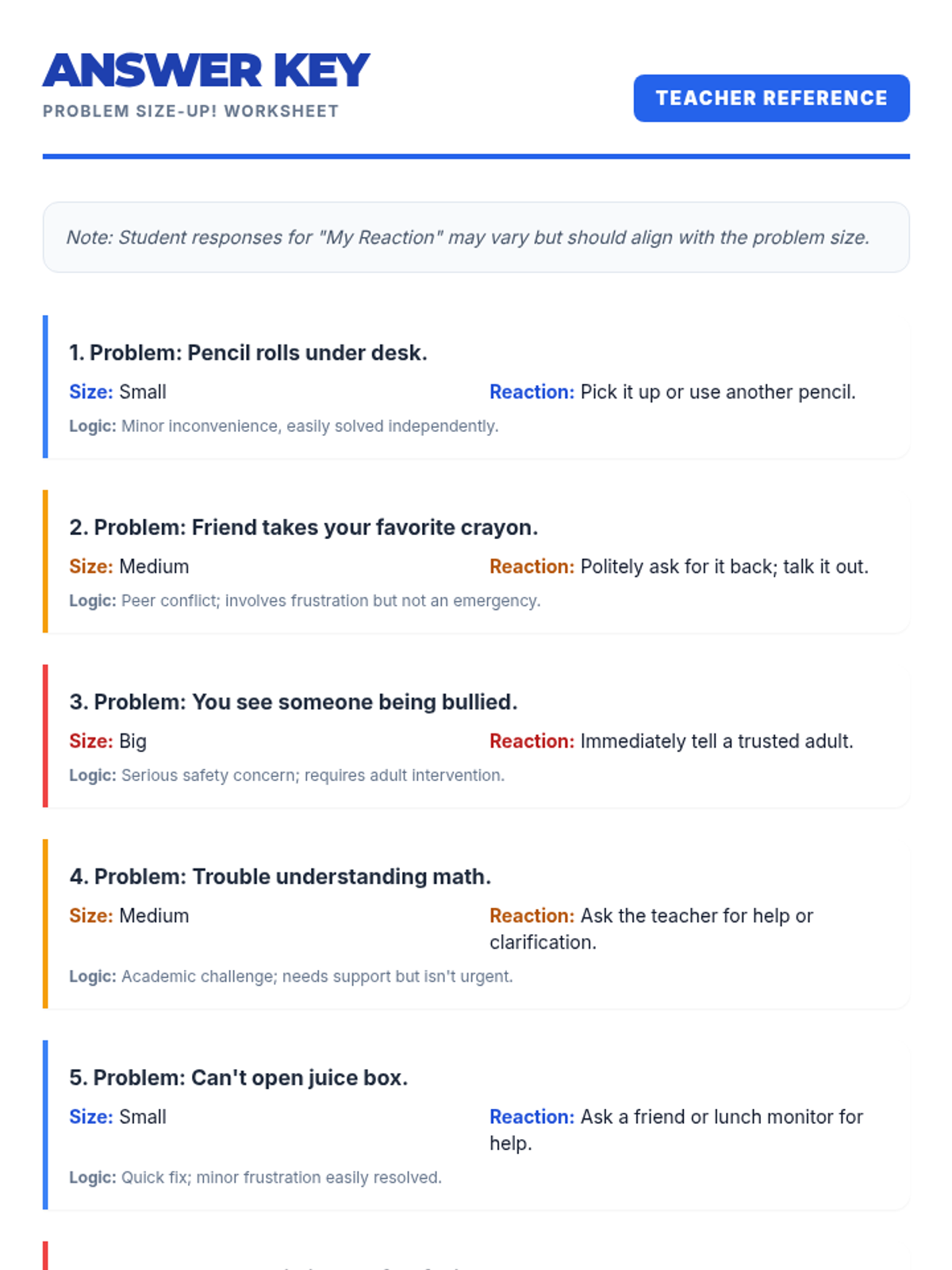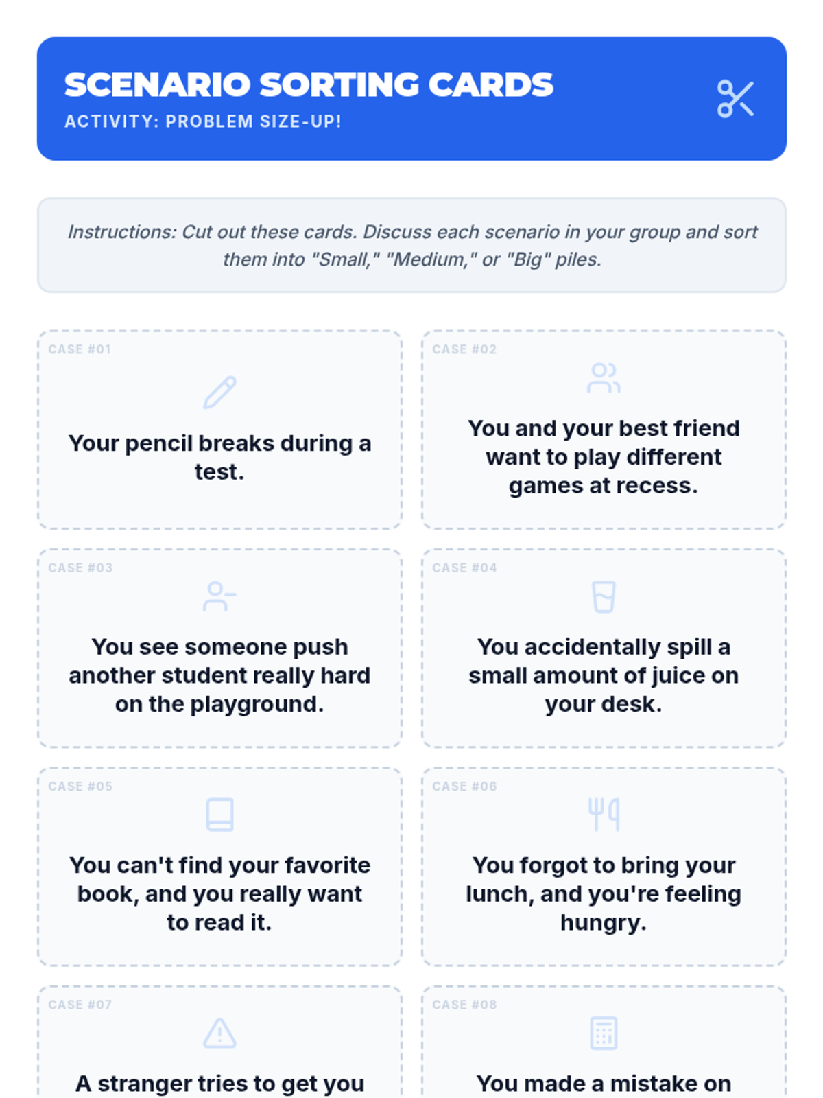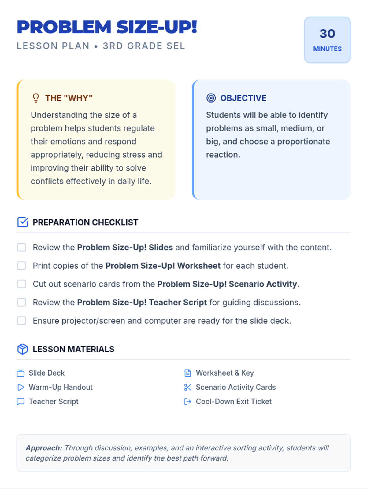 An interactive 30-minute lesson teaching 3rd-grade students how to identify the 'size' of a problem (small, medium, or big) and match their reaction accordingly. This lesson uses discussion, scenario sorting, and independent practice to build emotional regulation skills.