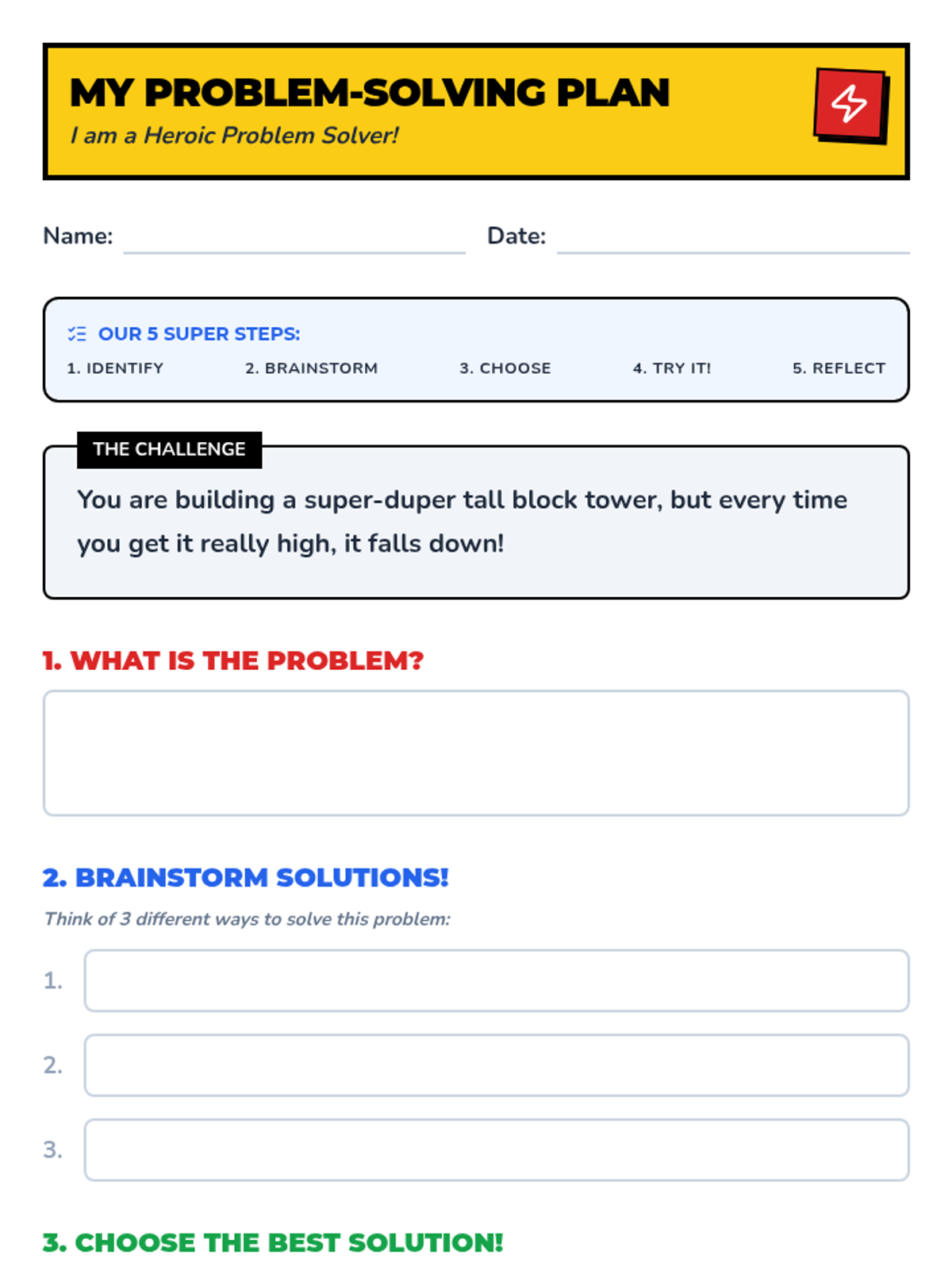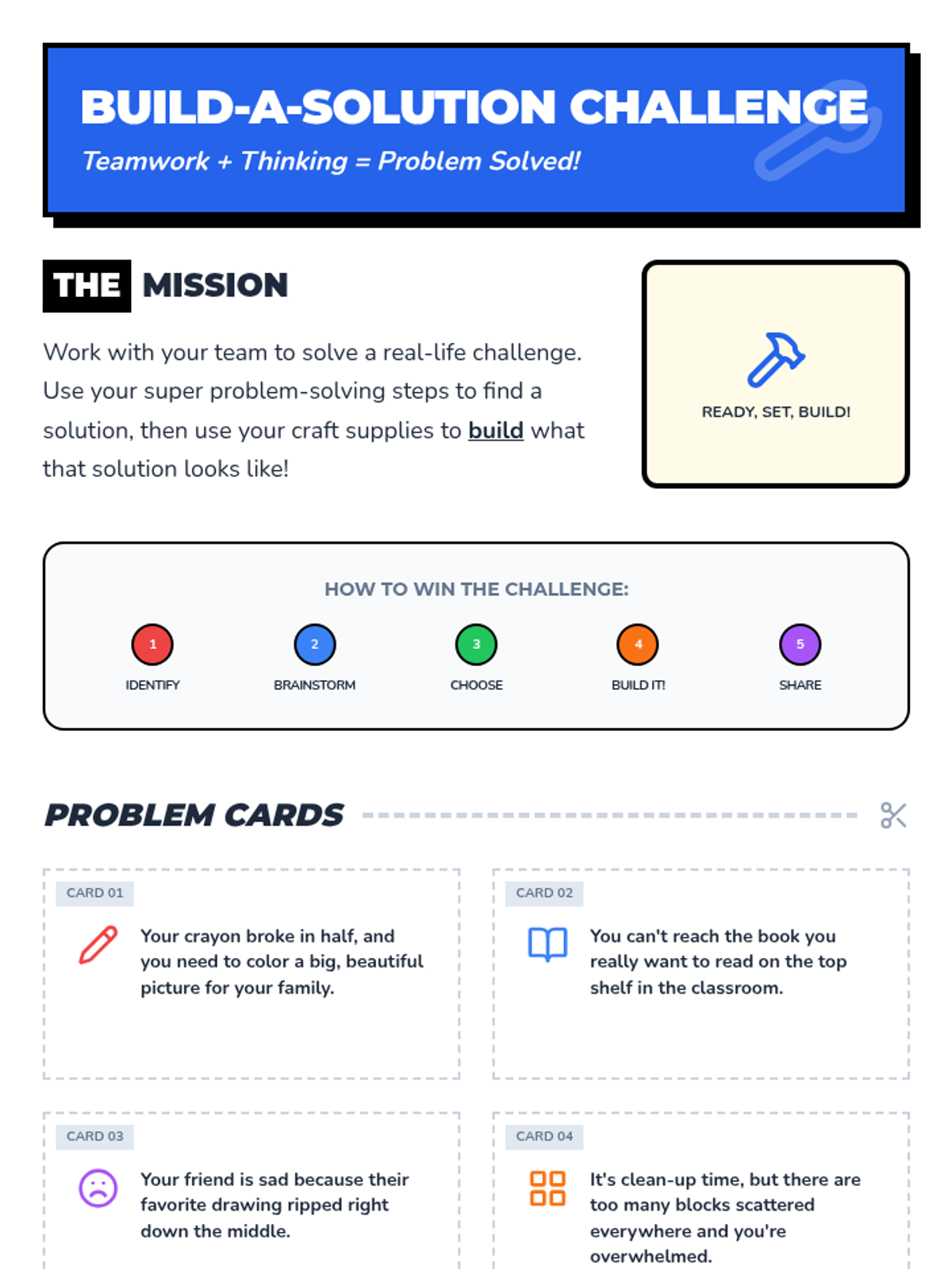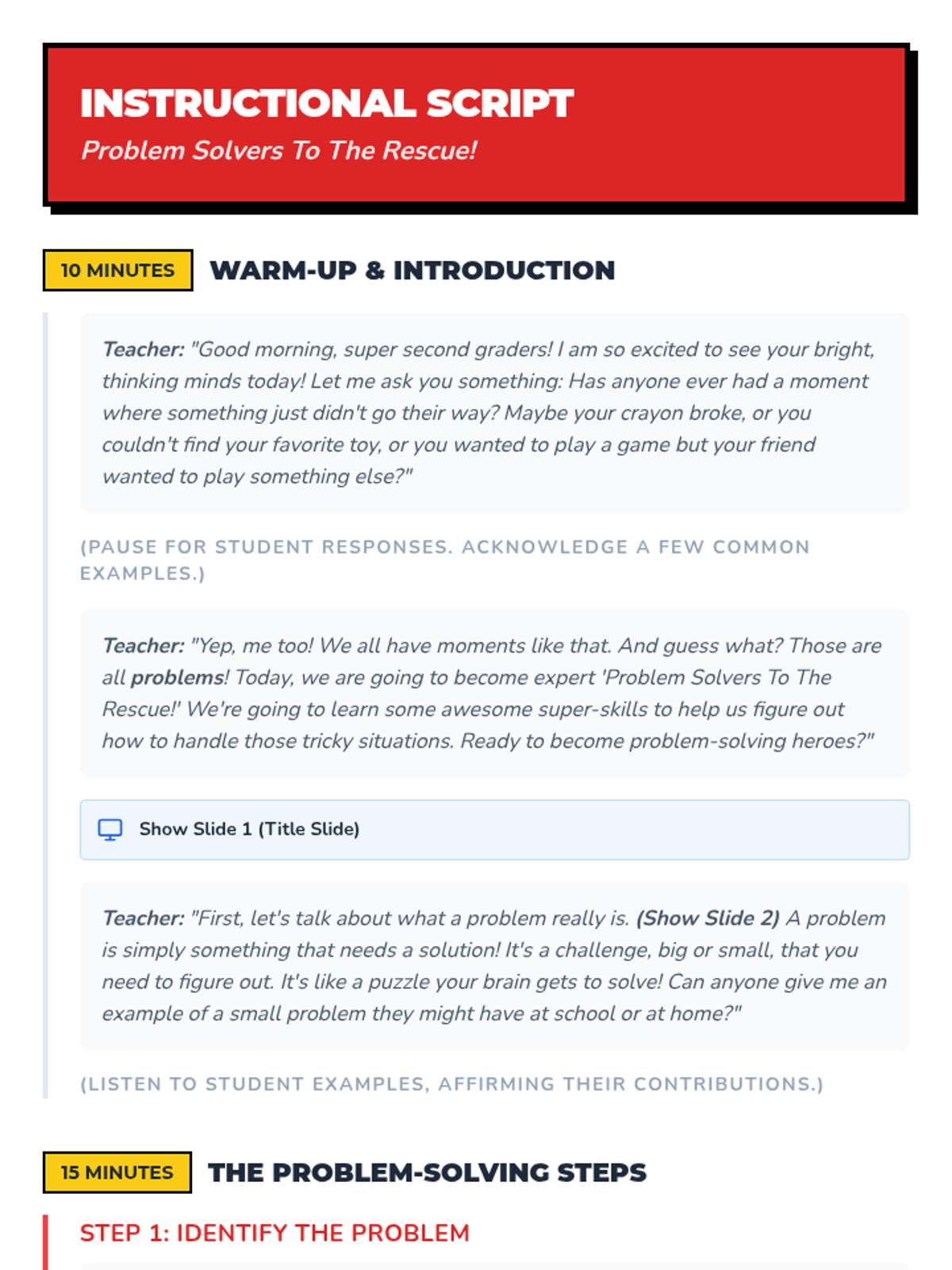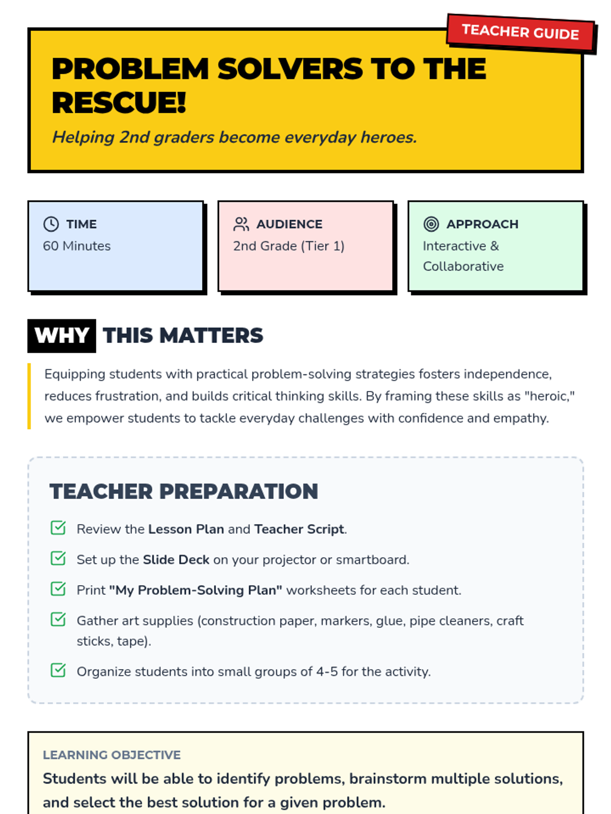 This 60-minute Tier 1 lesson empowers 2nd-grade students with a 5-step strategy to identify, brainstorm, and solve everyday challenges through interactive discussion and hands-on building.