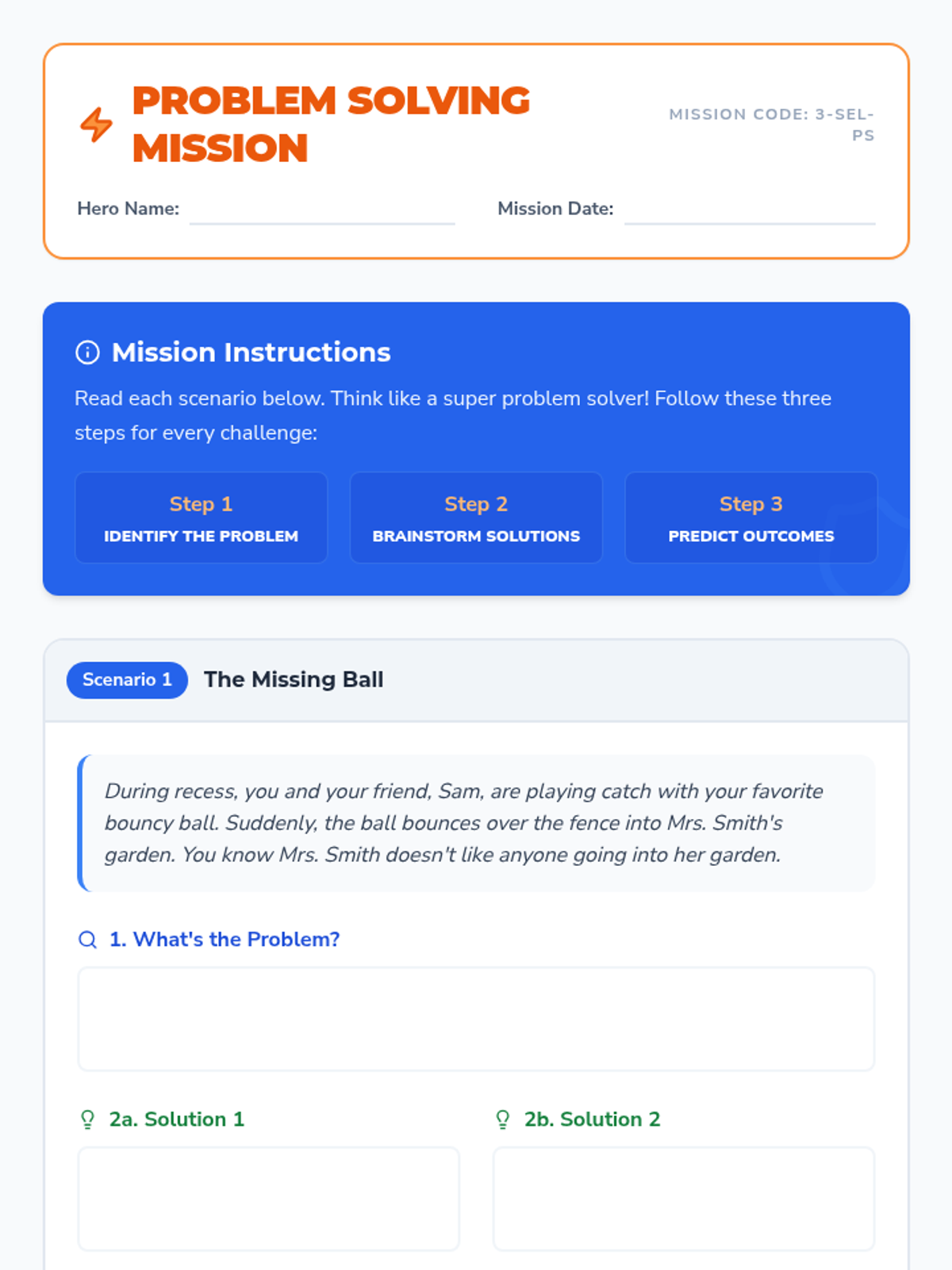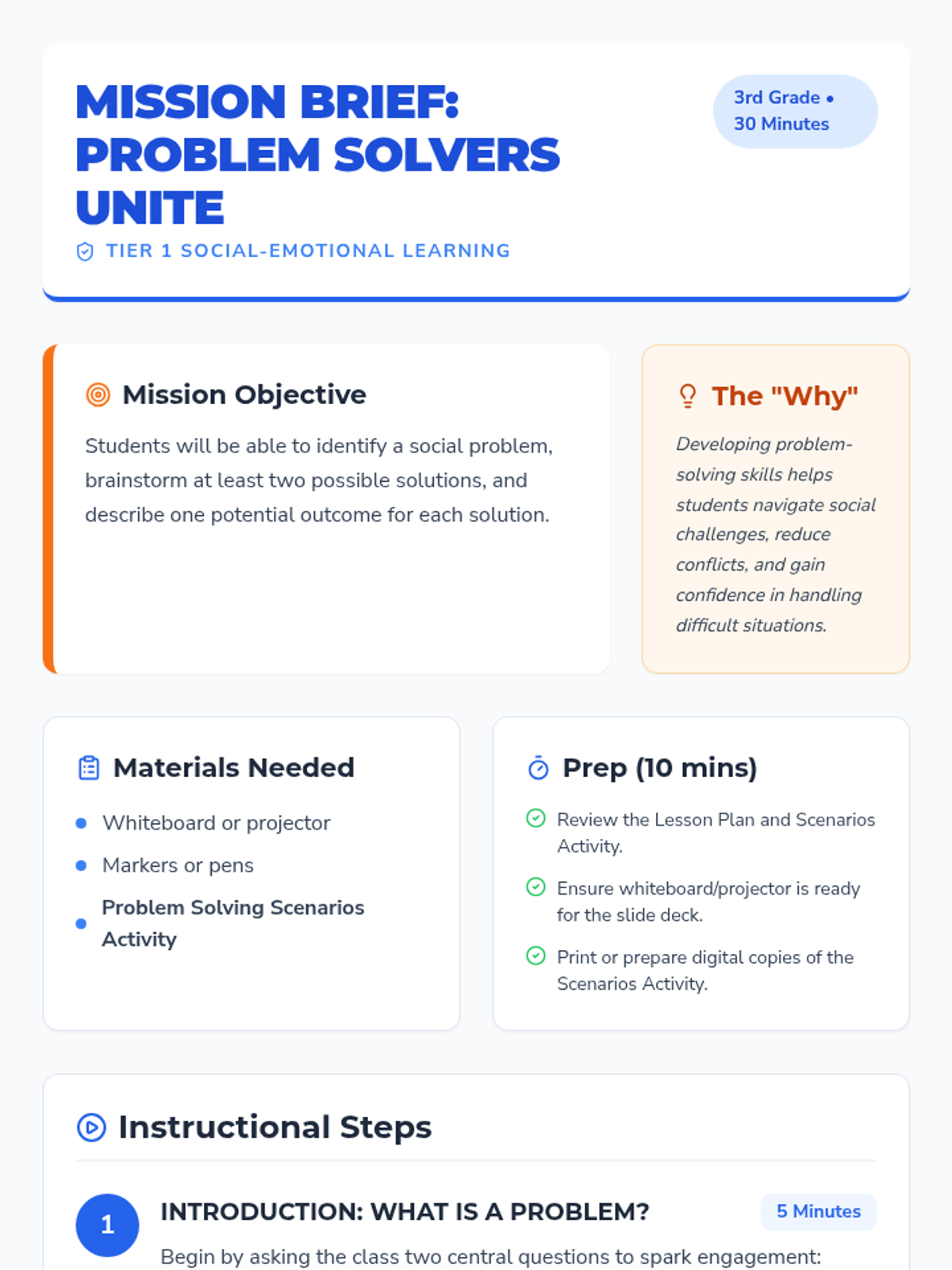 This 30-minute social-emotional lesson empowers 3rd-grade students with practical strategies for solving common social problems. Students will learn to identify problems, brainstorm solutions, and evaluate outcomes, building resilience and fostering positive relationships.