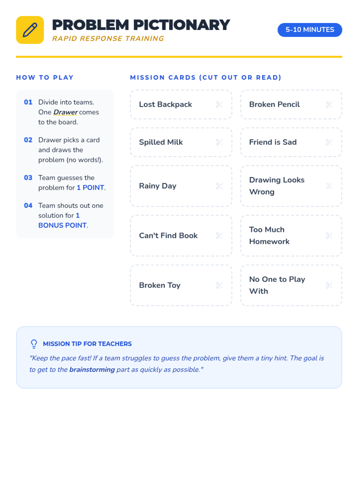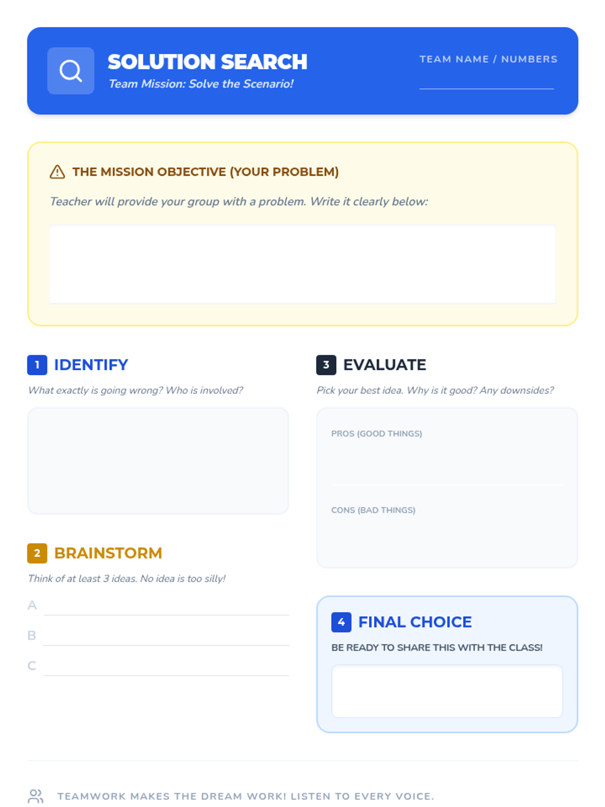 Practical team-based synergy challenges to apply collaborative problem-solving skills.