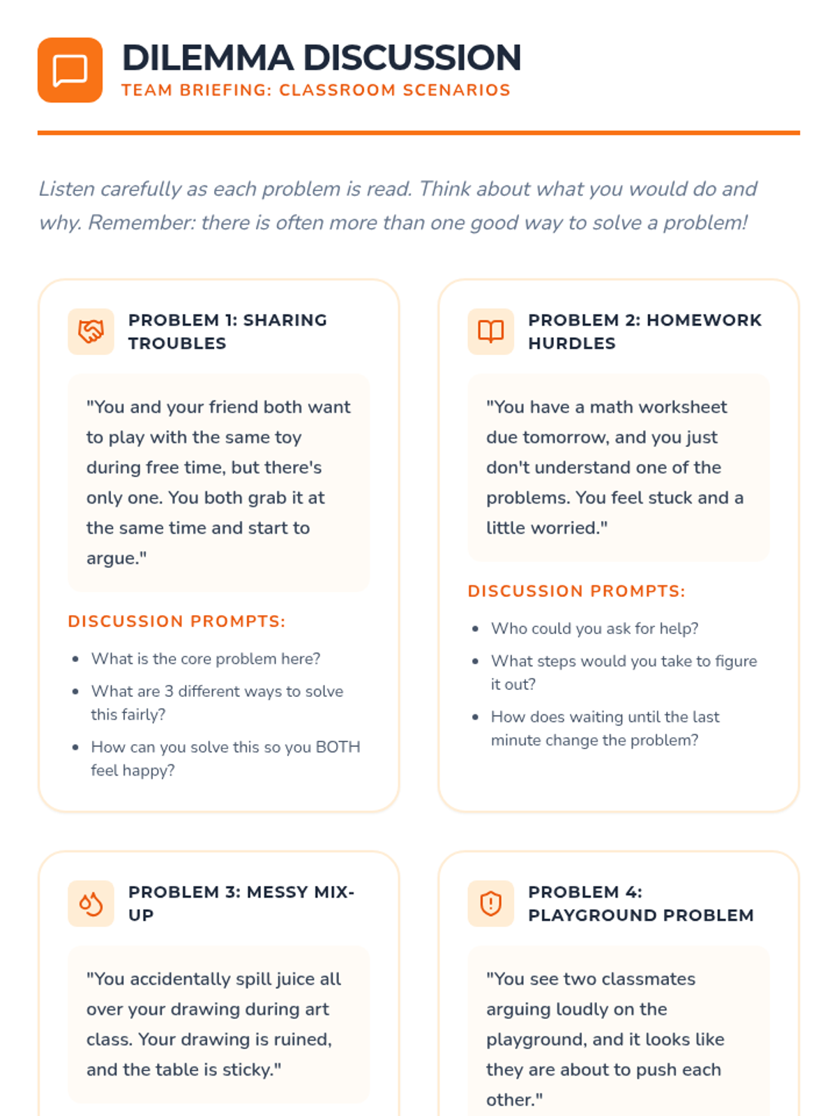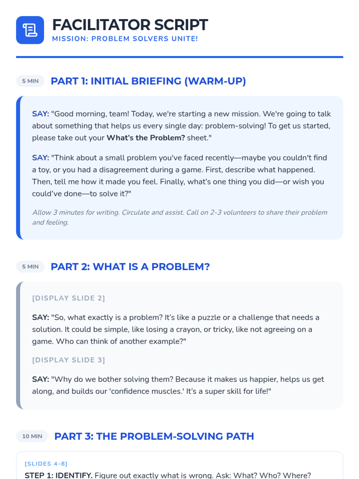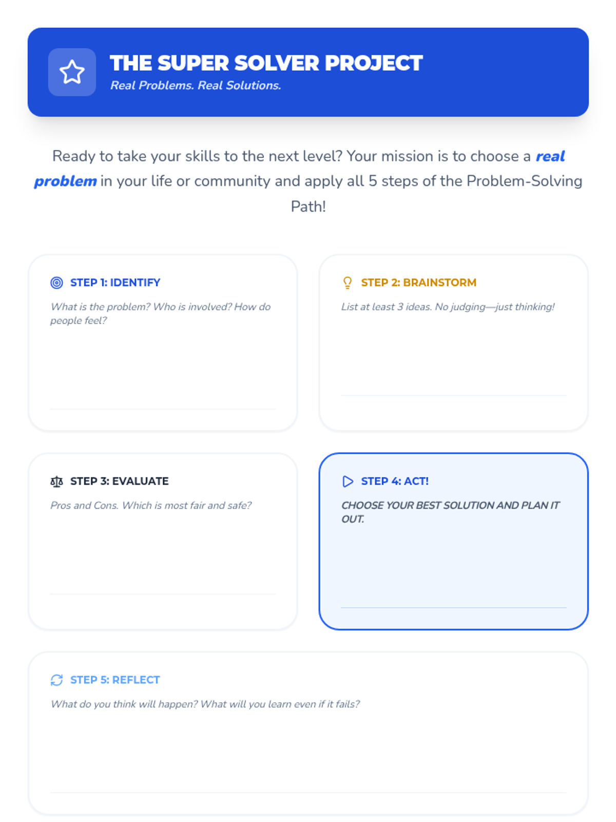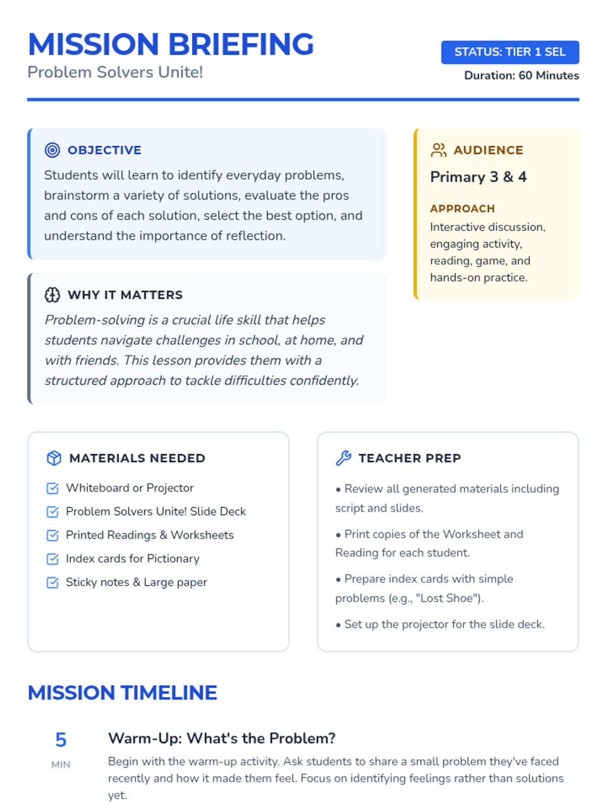 A Tier 1 SEL lesson for Primary 3-4 students that teaches a structured 5-step approach to solving everyday problems through interactive activities, discussions, and personal reflection.