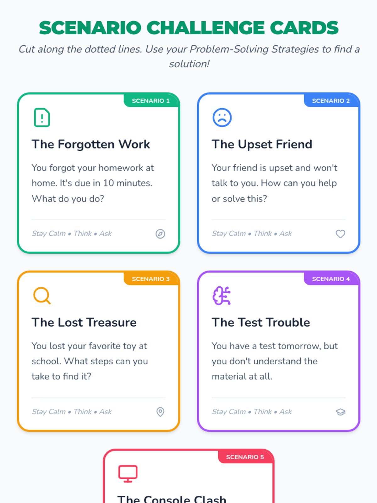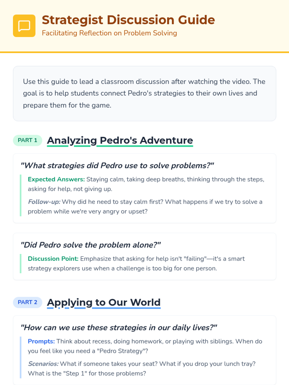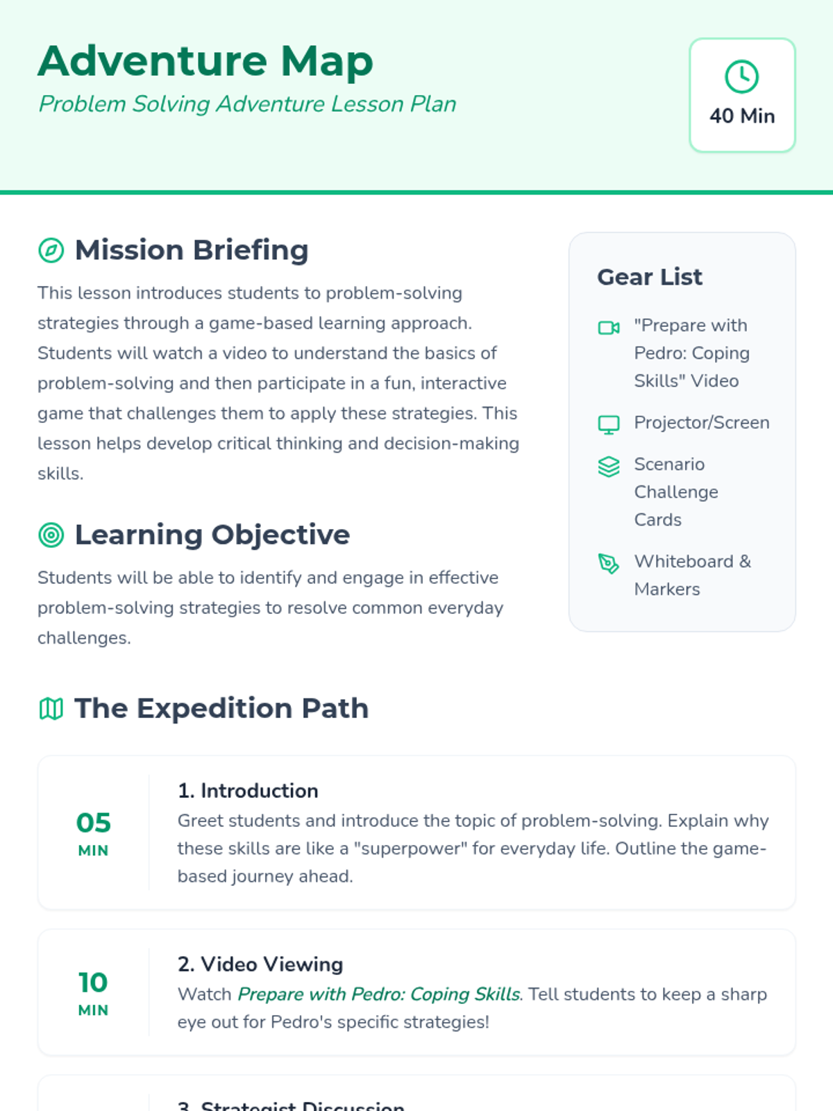 A game-based lesson where elementary students learn and apply problem-solving strategies through interactive scenarios and video-based modeling.