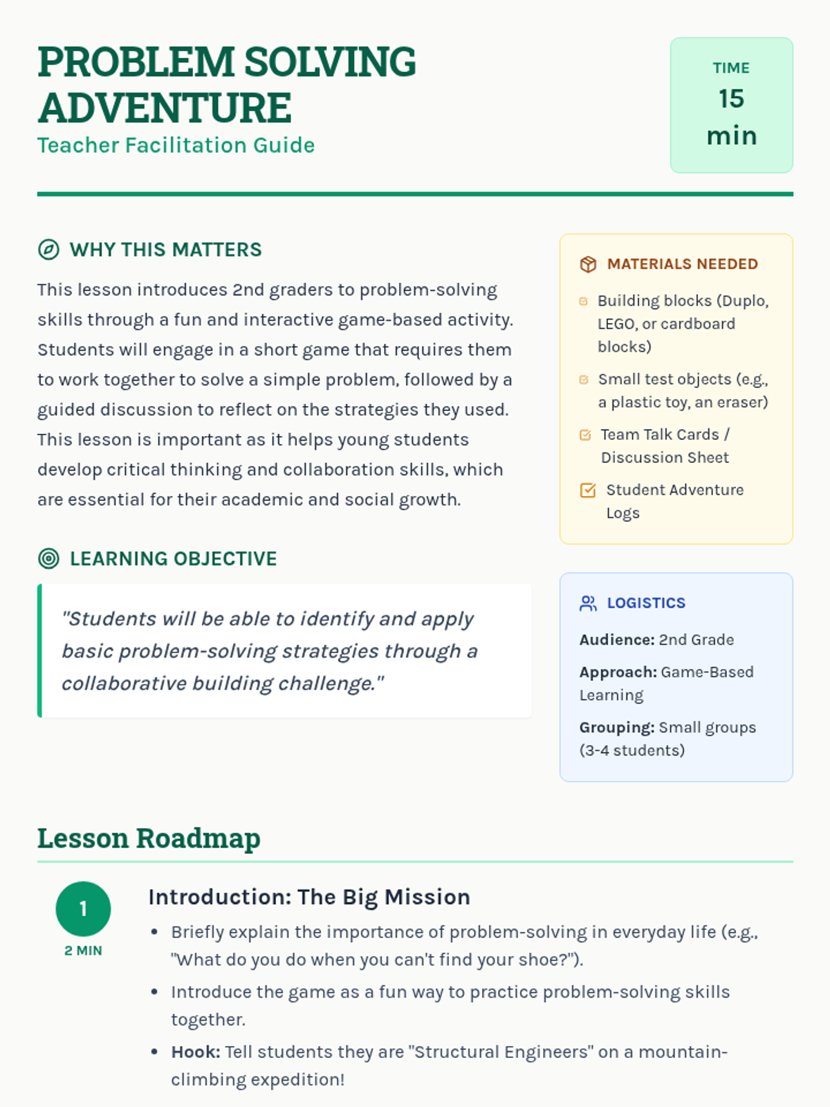 A 15-minute game-based lesson for 2nd graders to develop problem-solving and collaboration skills through a 'Building Challenge' adventure.