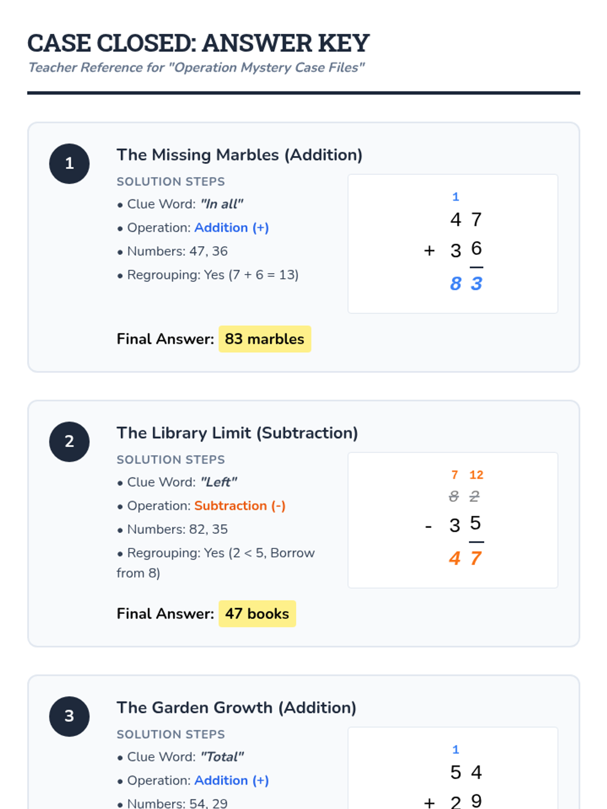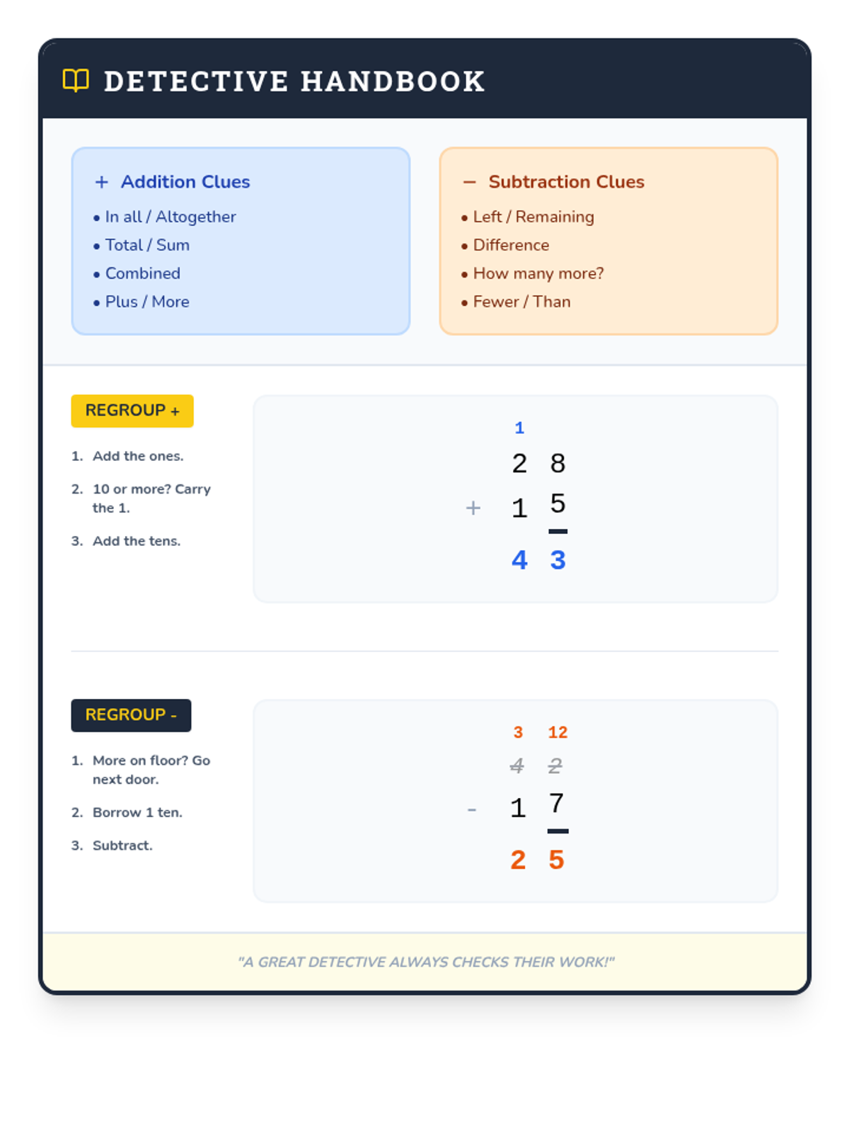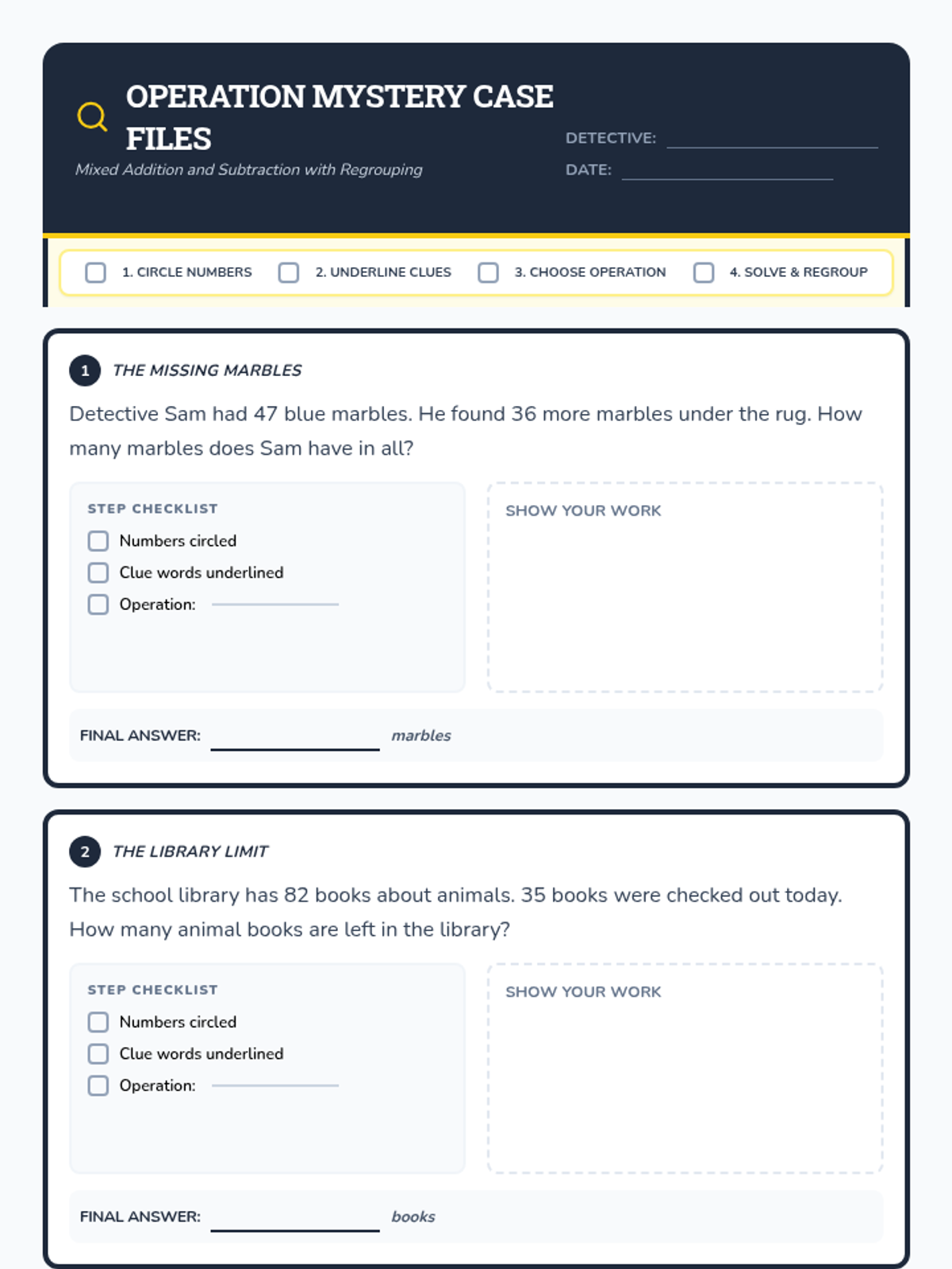 A lesson on solving mixed addition and subtraction word problems with regrouping for 2nd grade. Students use a detective-themed checklist to identify operations and solve double-digit problems accurately.