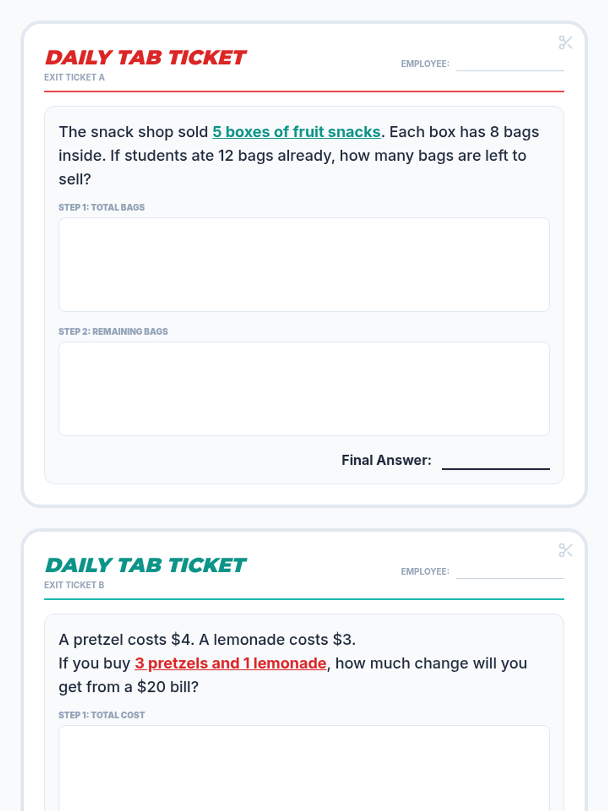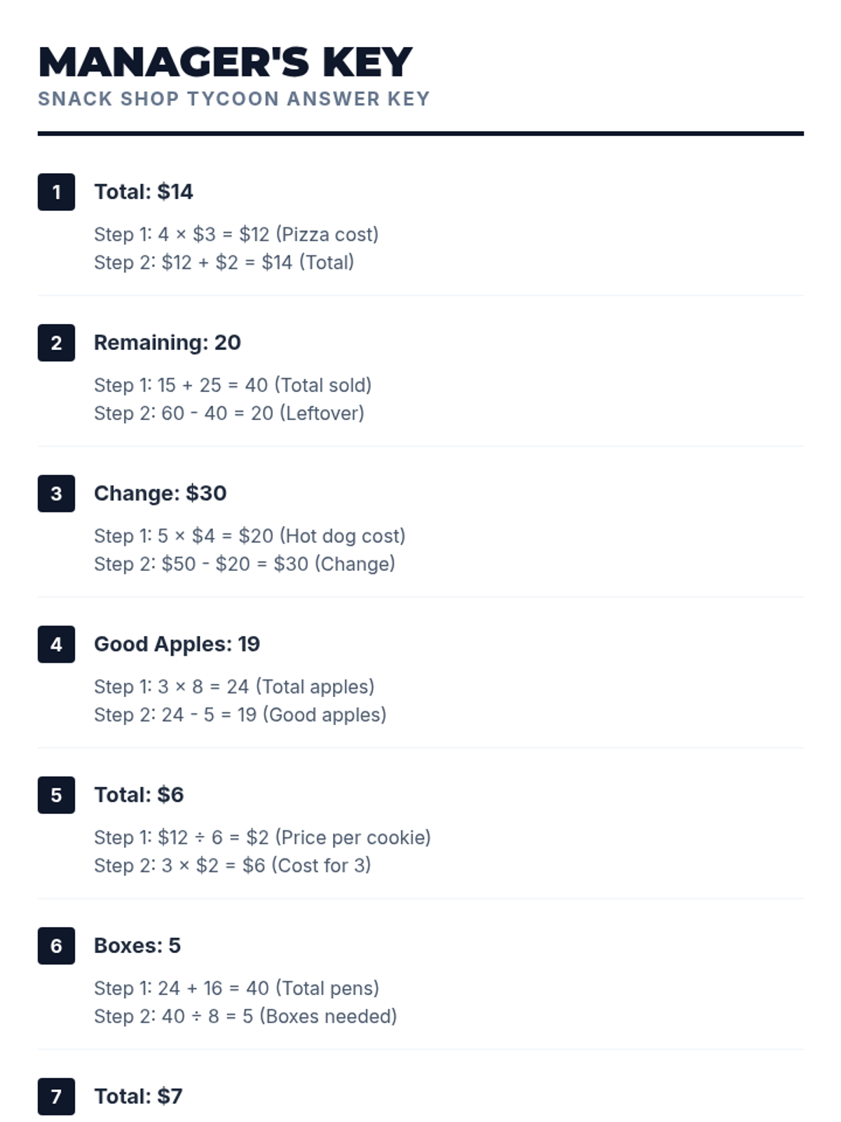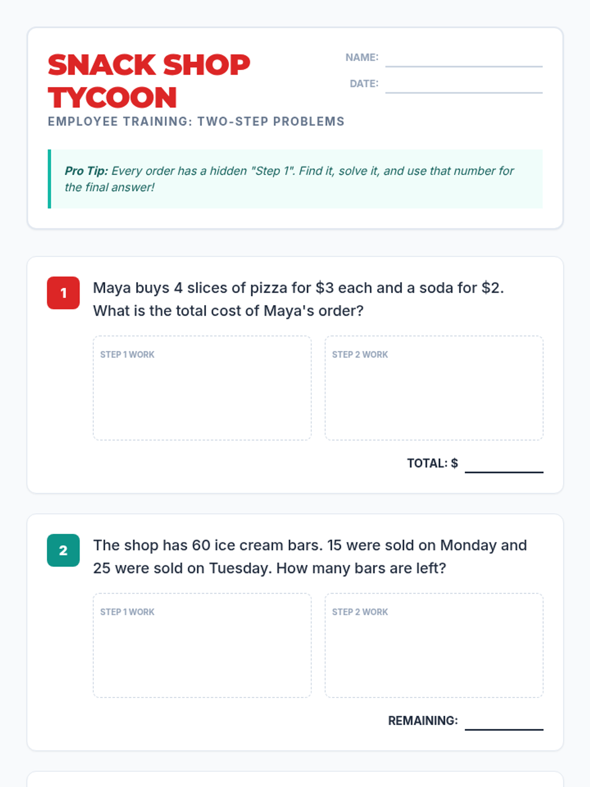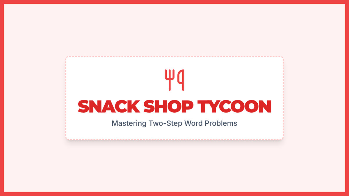 A math lesson focused on solving two-step word problems using the four operations, themed around managing a busy snack shop. Students learn to break down complex problems into manageable steps.