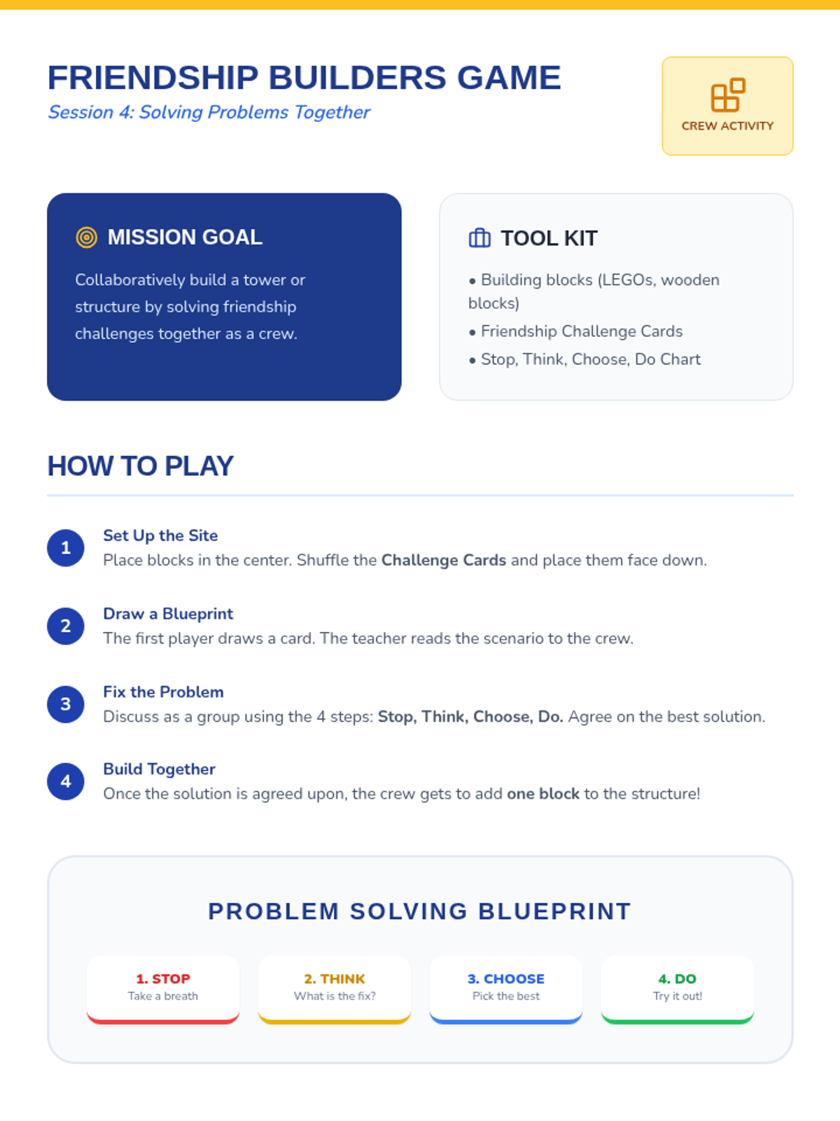 Introduces the 'Stop, Think, Choose, Do' problem-solving framework through a collaborative building game.