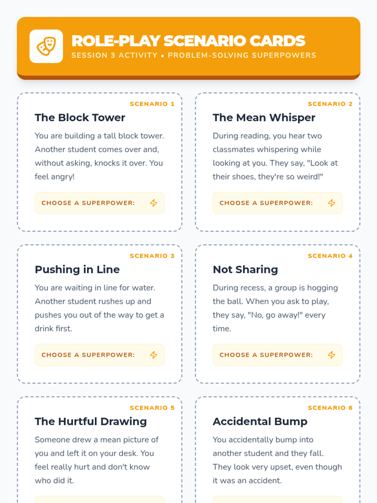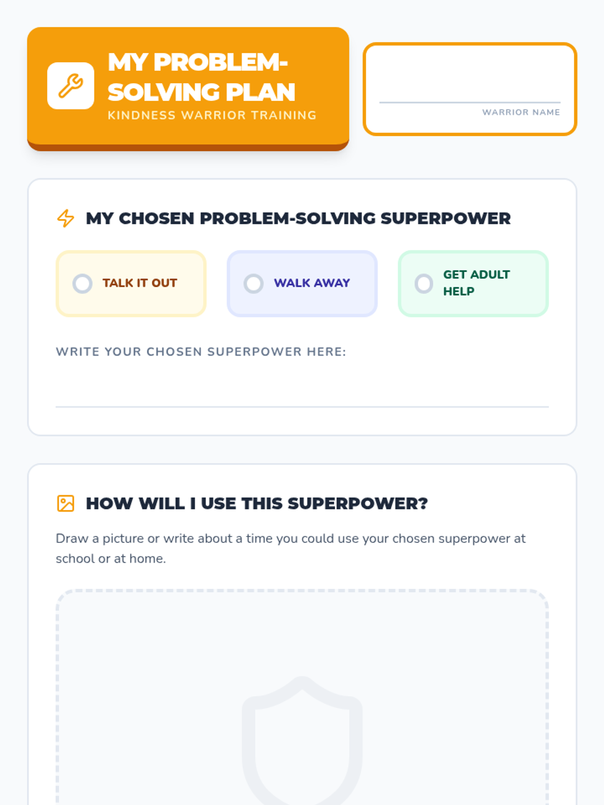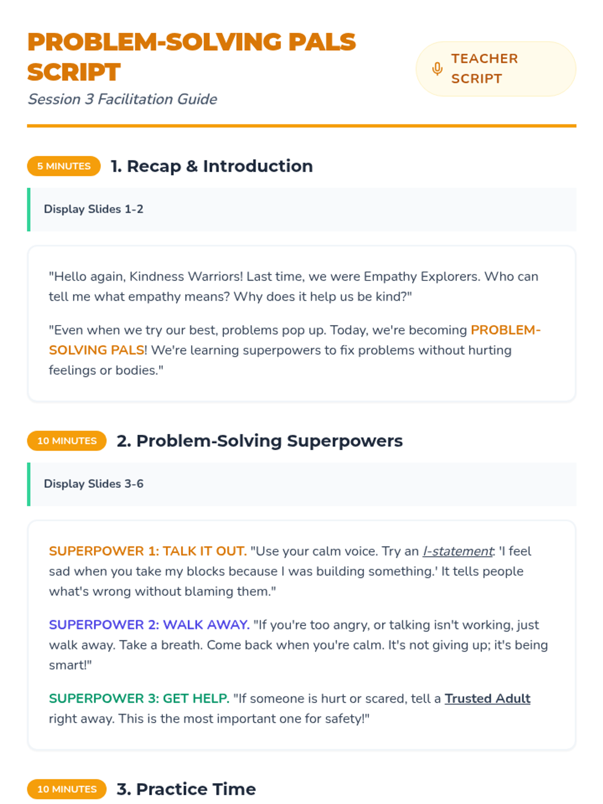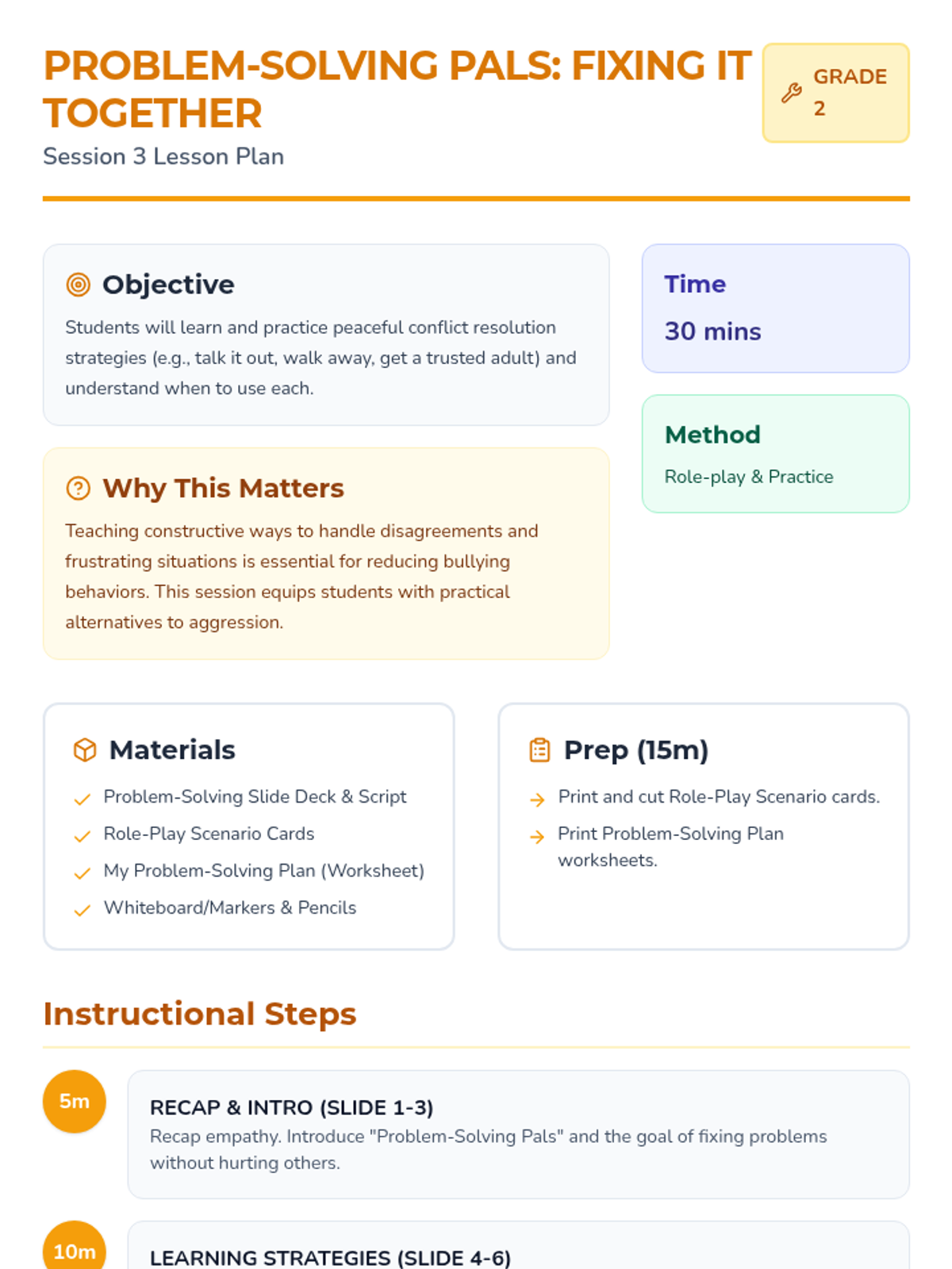 Students learn and practice three core strategies for peaceful conflict resolution: Talk It Out, Walk Away, and Get a Trusted Adult. Includes role-playing and personal planning.