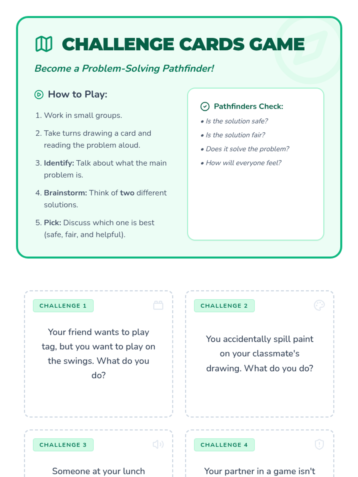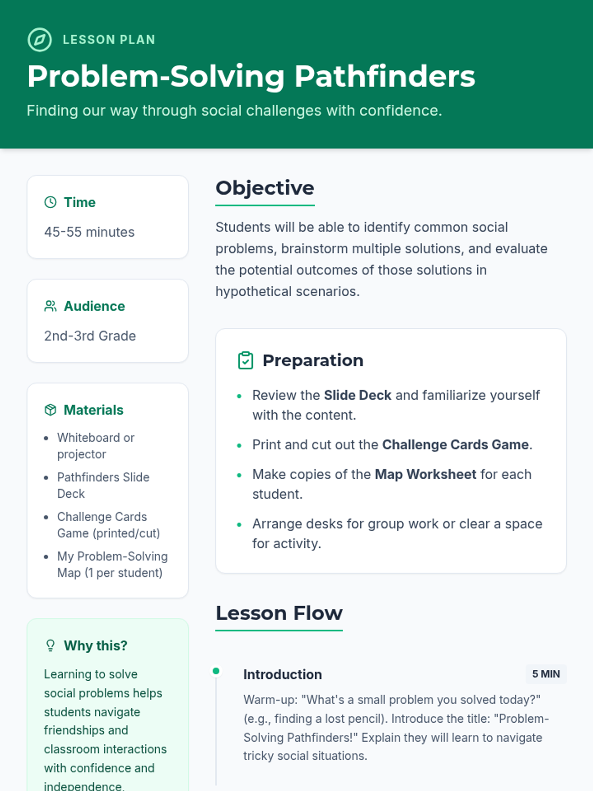 This lesson equips 2nd-3rd grade students with practical strategies for identifying and solving common social problems. Through collaborative games and role-playing, students will develop critical thinking skills to navigate conflicts and challenges independently, promoting self-efficacy.
