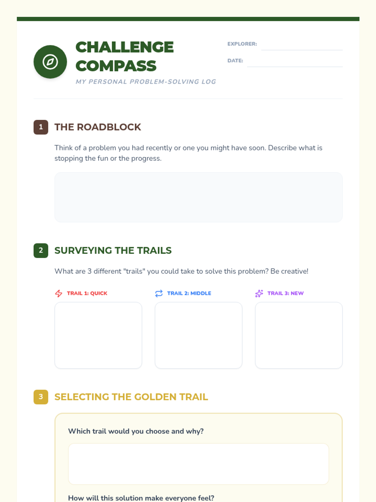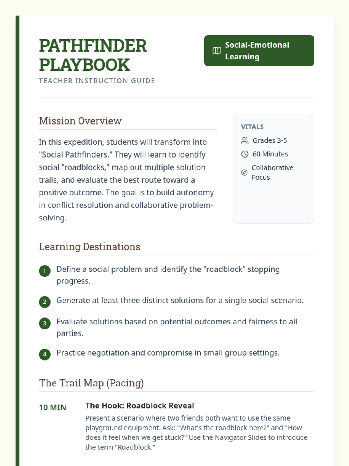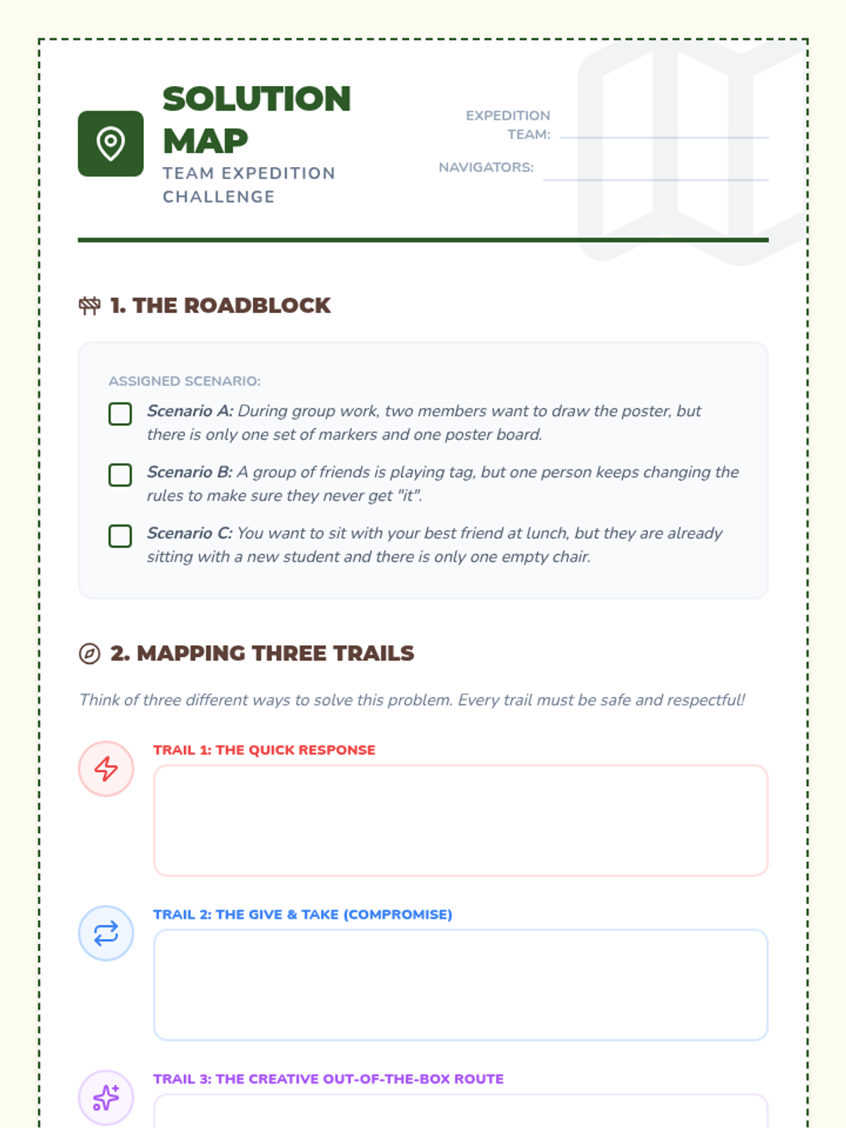 A comprehensive social-emotional learning lesson that teaches students how to navigate social challenges using a 'pathfinder' framework. Students learn to identify roadblocks, brainstorm diverse solutions, and map out the best outcomes through collaborative group work and individual reflection.