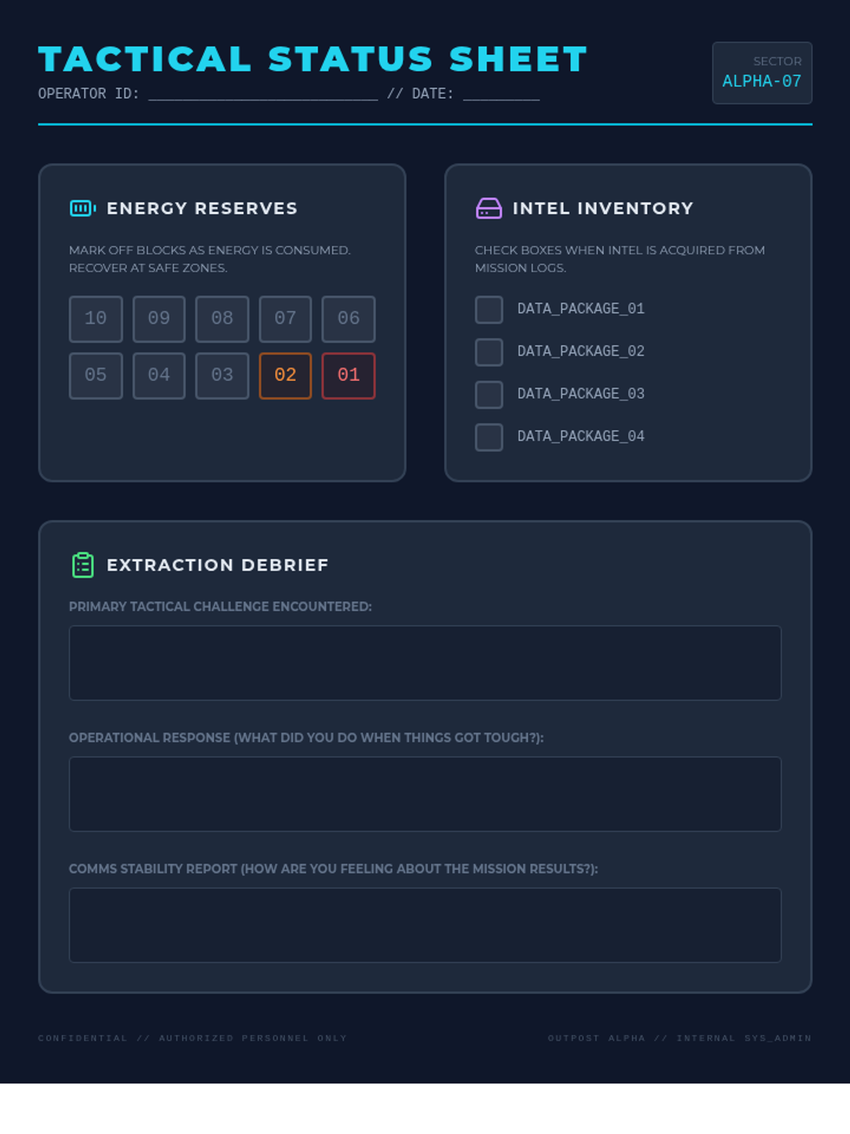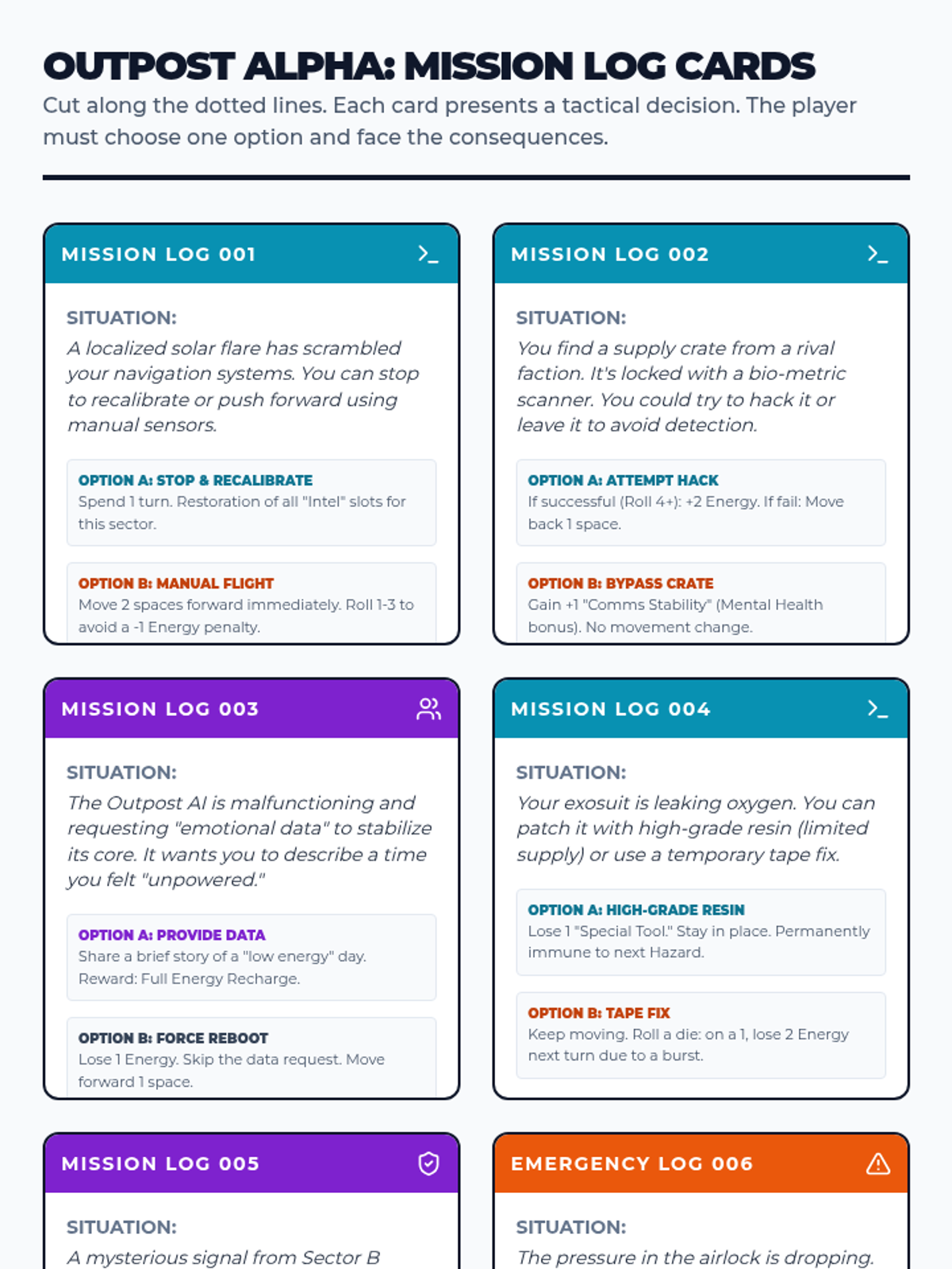 A survival-themed board game and facilitation guide designed for 6th grade students who are hesitant to share feelings. The game focuses on tactical choices and consequences to build rapport and subtly explore emotional regulation.
