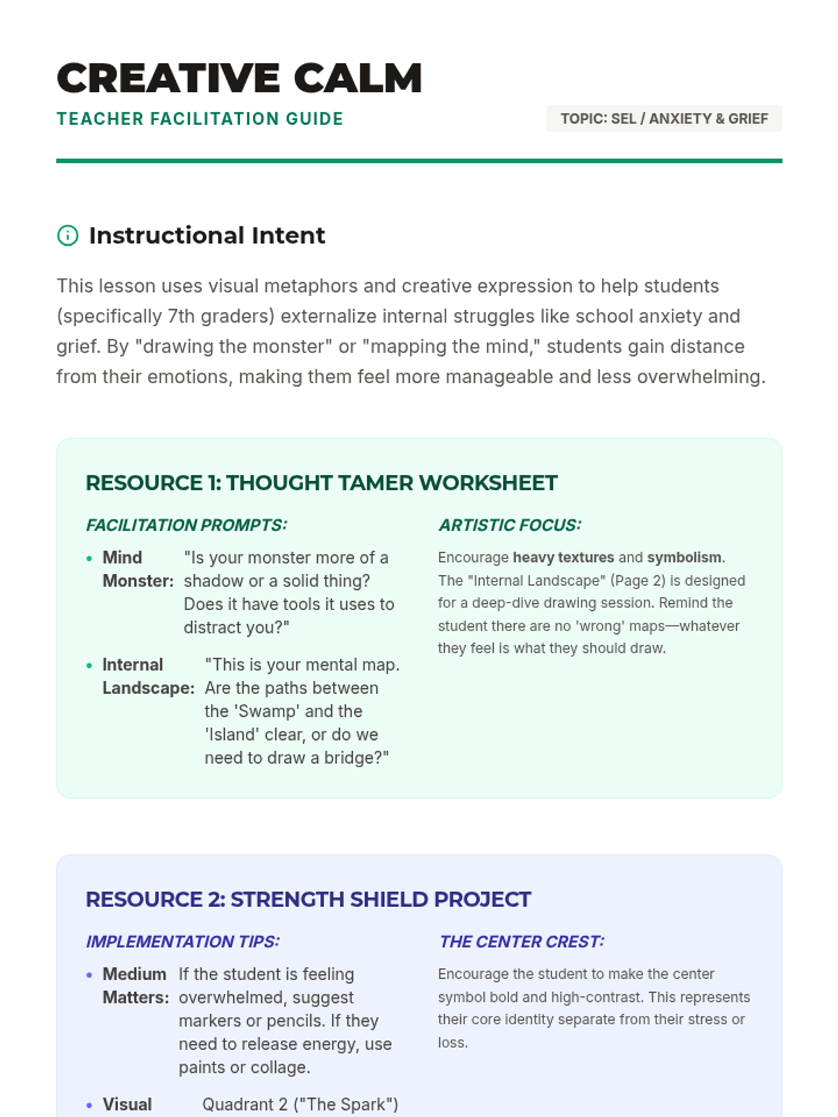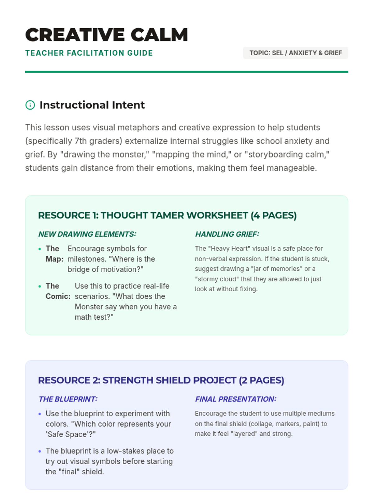 A creative, drawing-based approach to helping 7th graders navigate school anxiety, motivation, and grief through positive self-talk and visual expression.