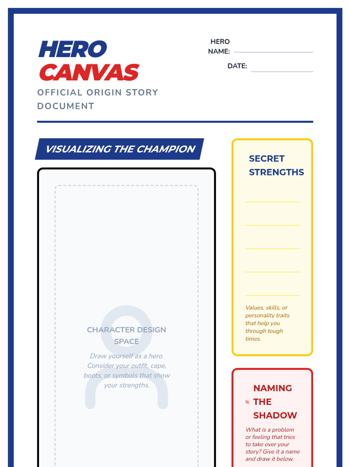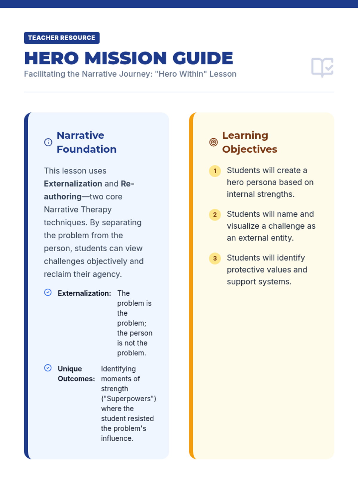 A lesson focused on helping students re-author their personal narratives by identifying their strengths, values, and 'heroic' qualities through creative art activities.