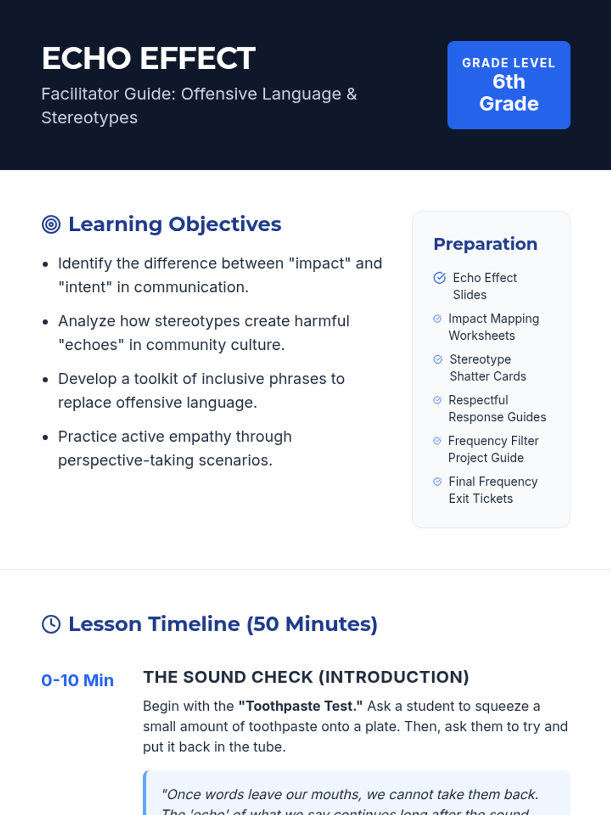 This lesson addresses the impact of offensive language and stereotypes, helping 6th-grade students develop empathy and practice inclusive communication through interactive activities and reflection.