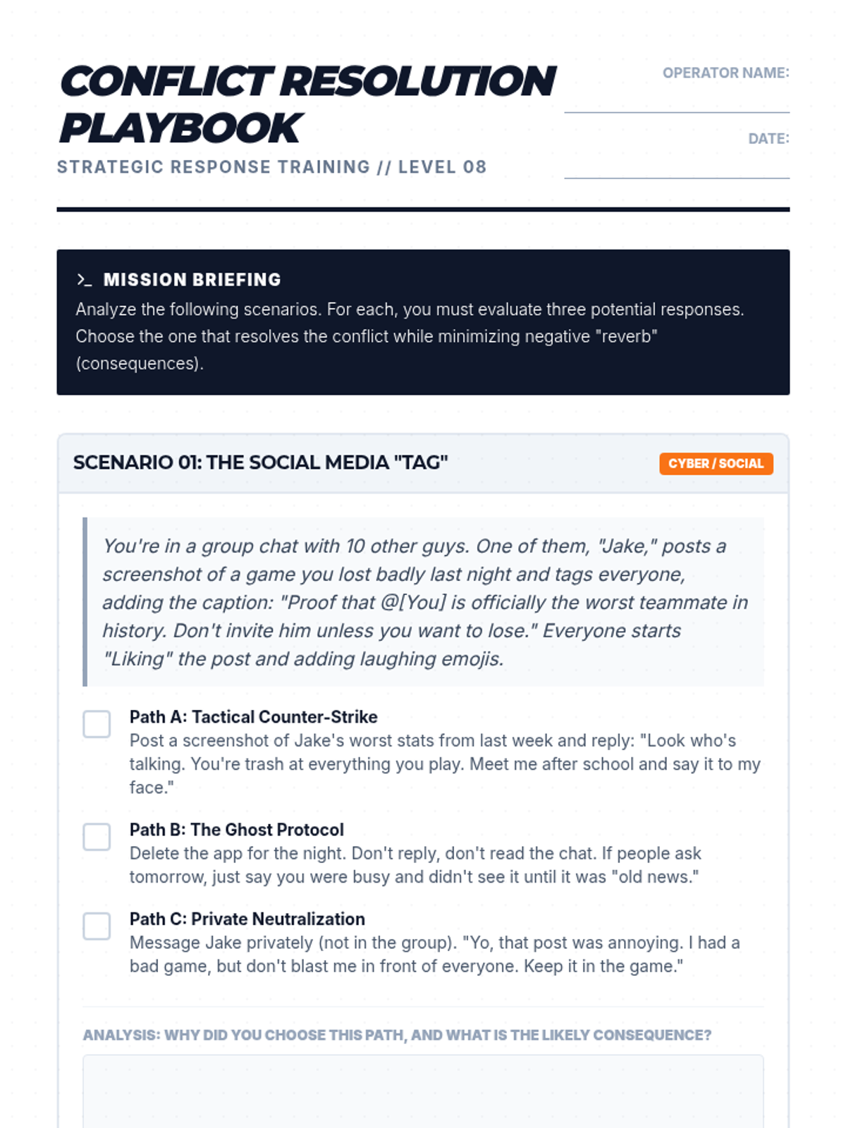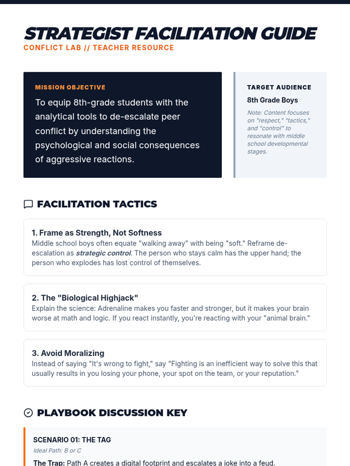 A social-emotional learning lesson designed for 8th-grade boys to analyze peer conflict, understand the 'Escalation Ladder,' and practice tactical de-escalation strategies through realistic scenario-based decision making.