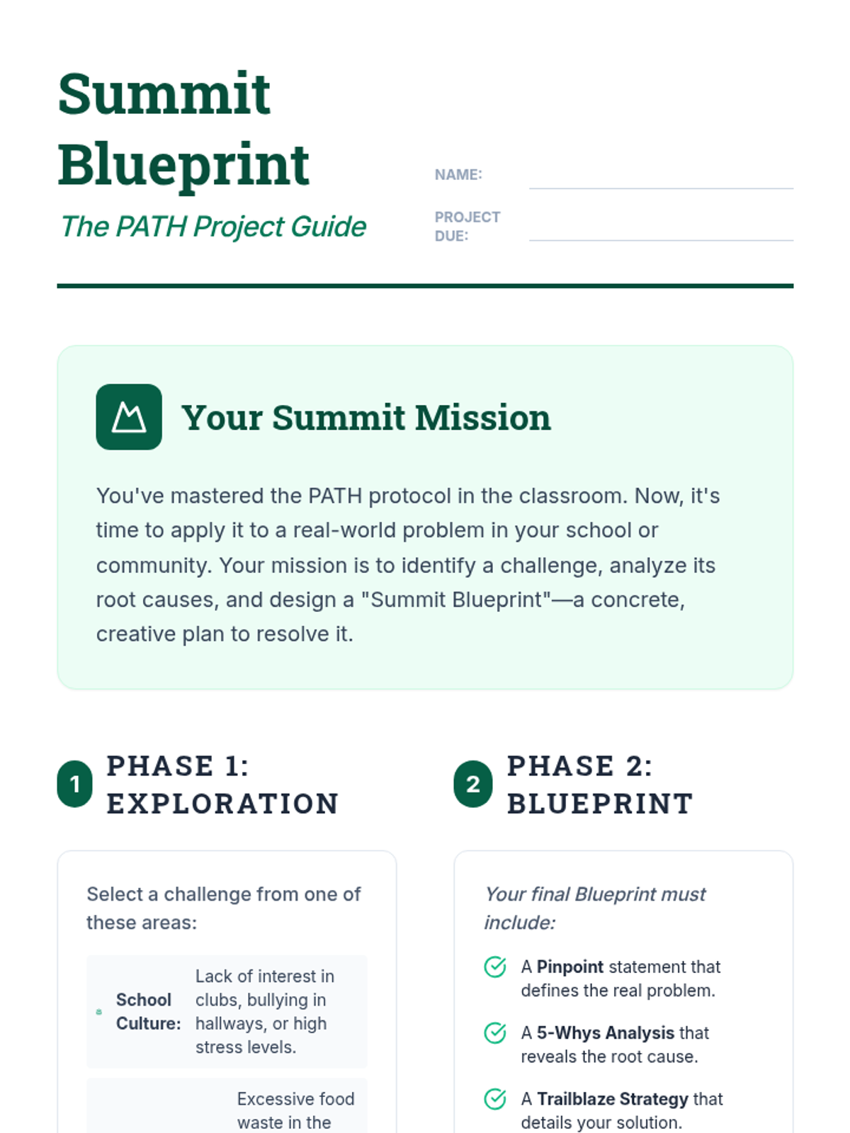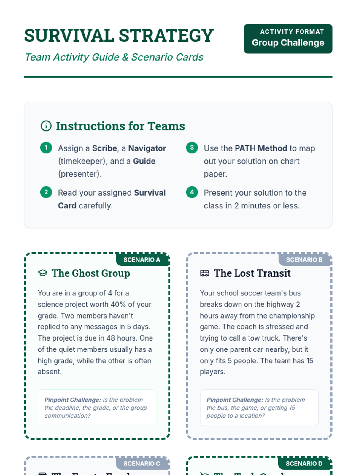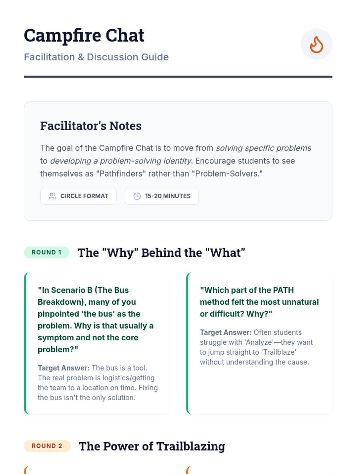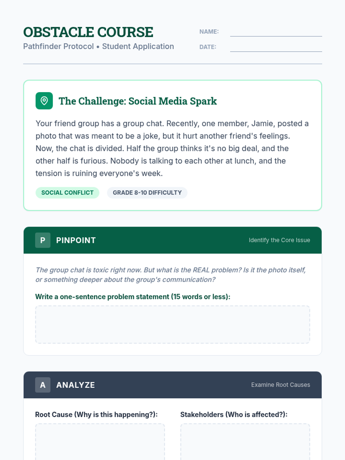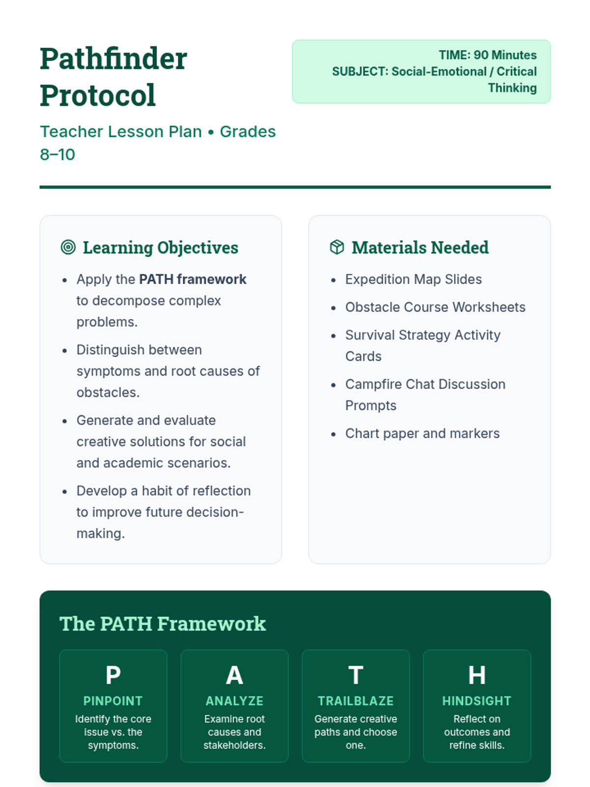 A comprehensive lesson for grades 8-10 that introduces the PATH method for structured problem-solving in academic and social contexts. Students learn to pinpoint issues, analyze causes, trailblaze solutions, and use hindsight for reflection.