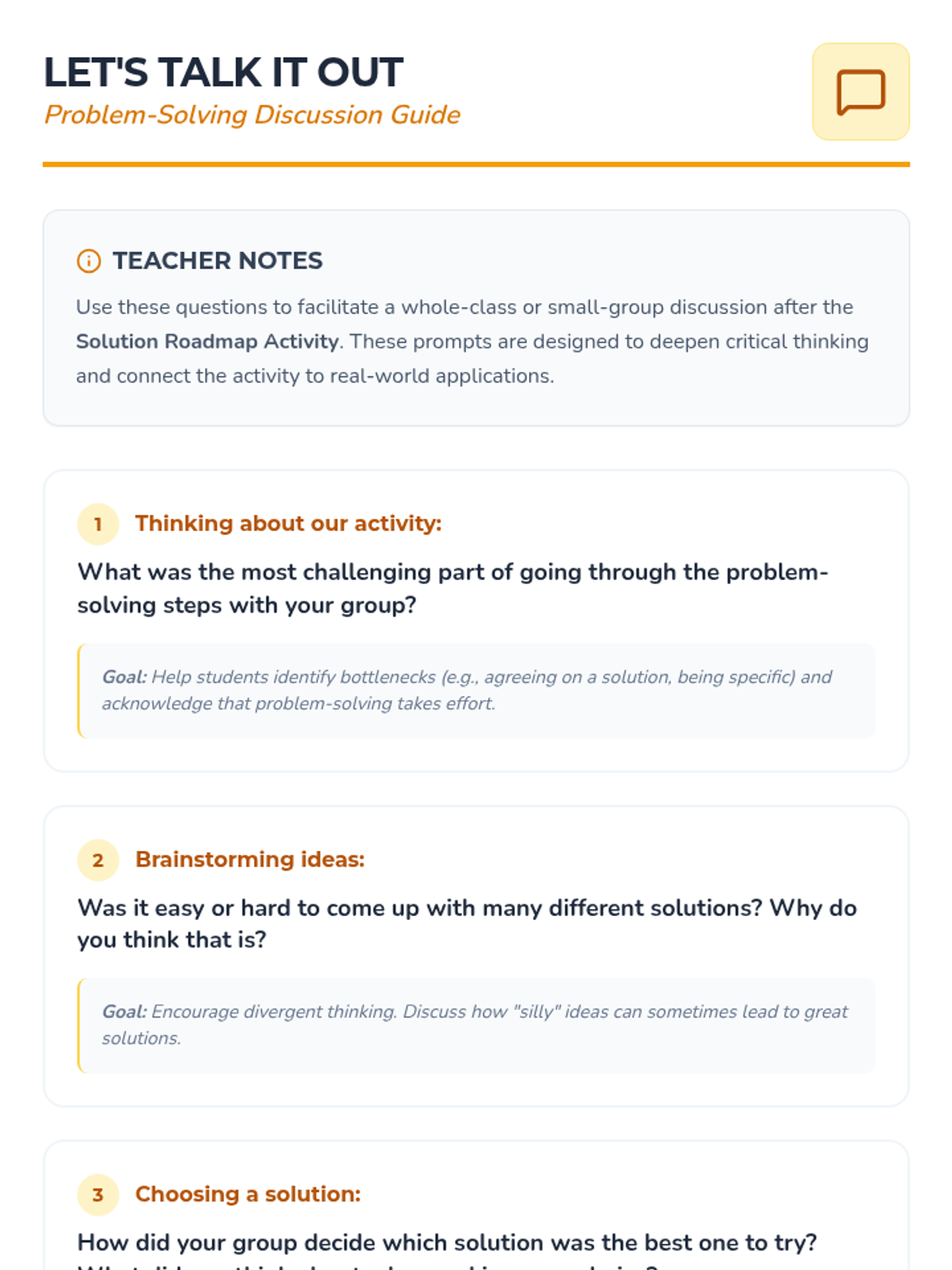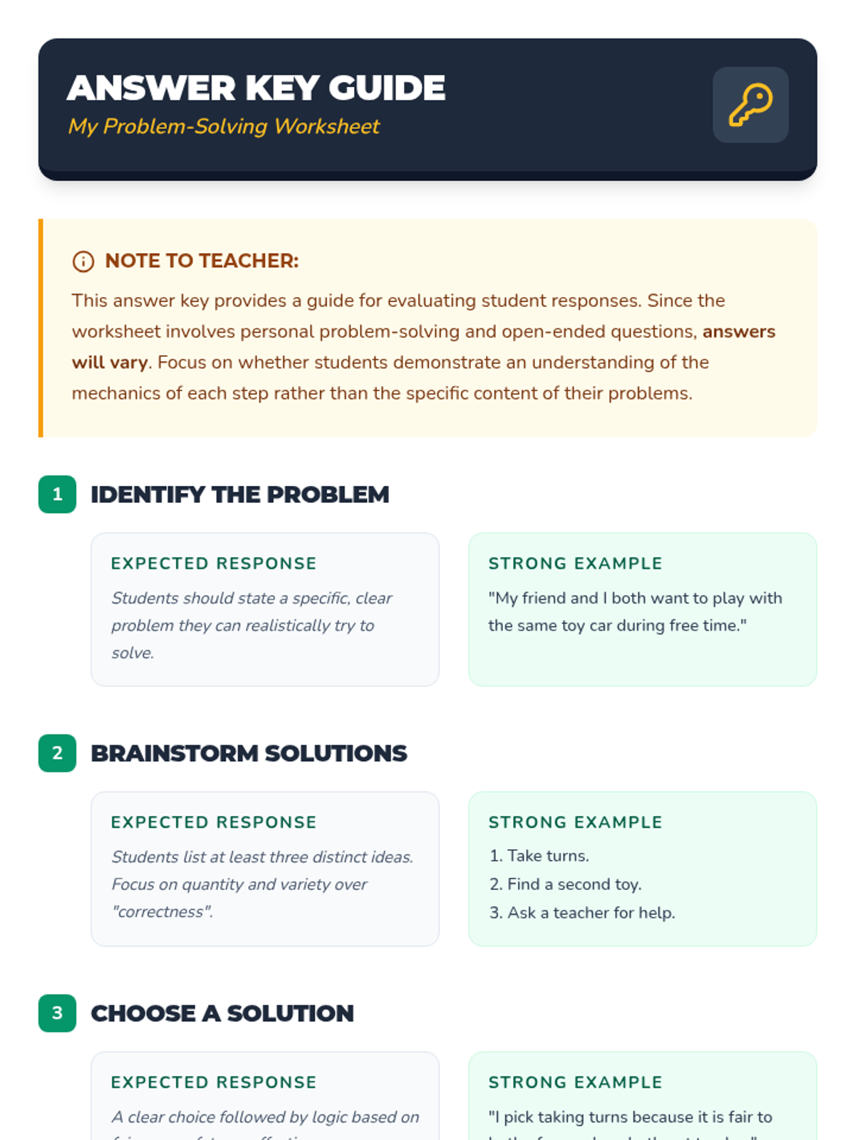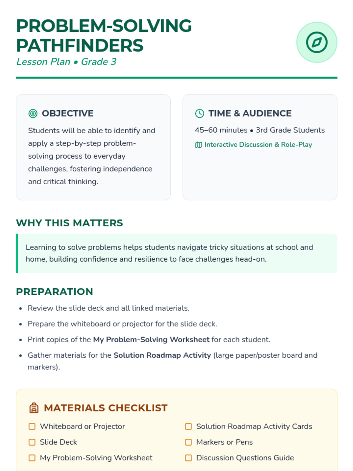 This lesson equips 3rd graders with a step-by-step approach to identify and resolve everyday challenges through a 'solution roadmap' and interactive role-playing. Students will practice breaking down problems, brainstorming options, and evaluating outcomes to build independence and resilience.