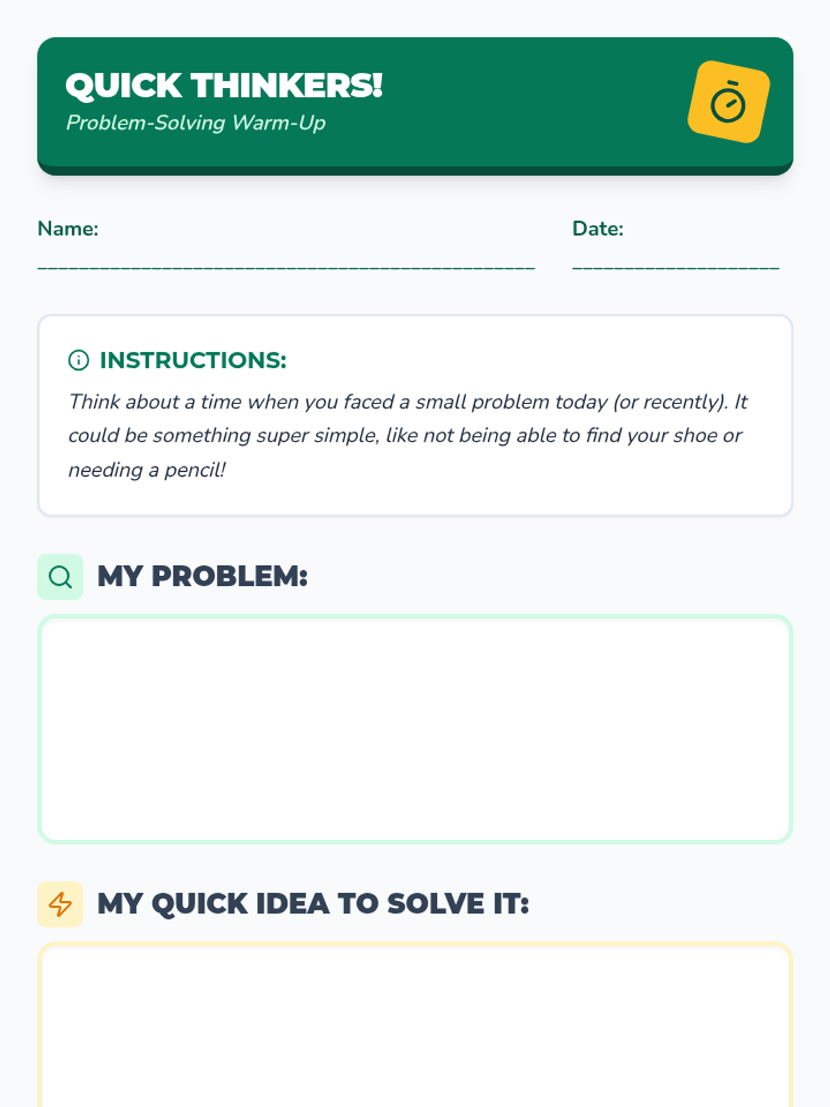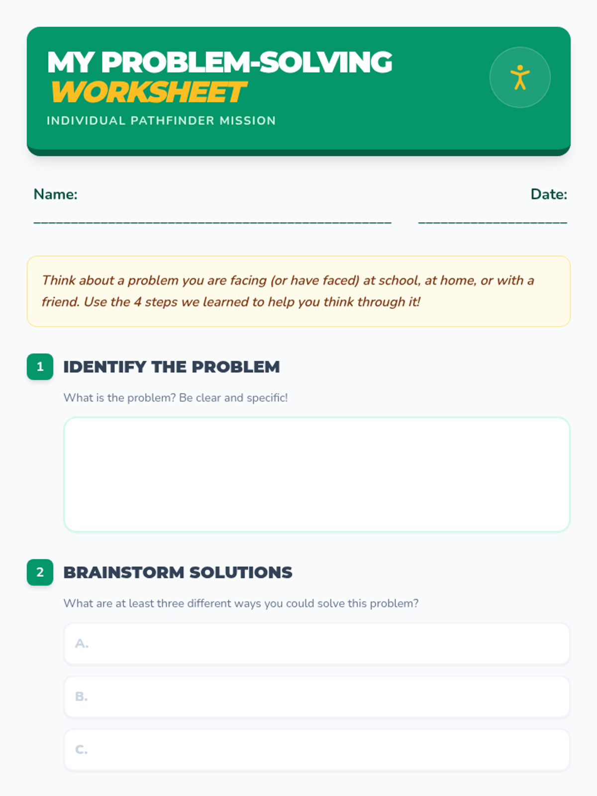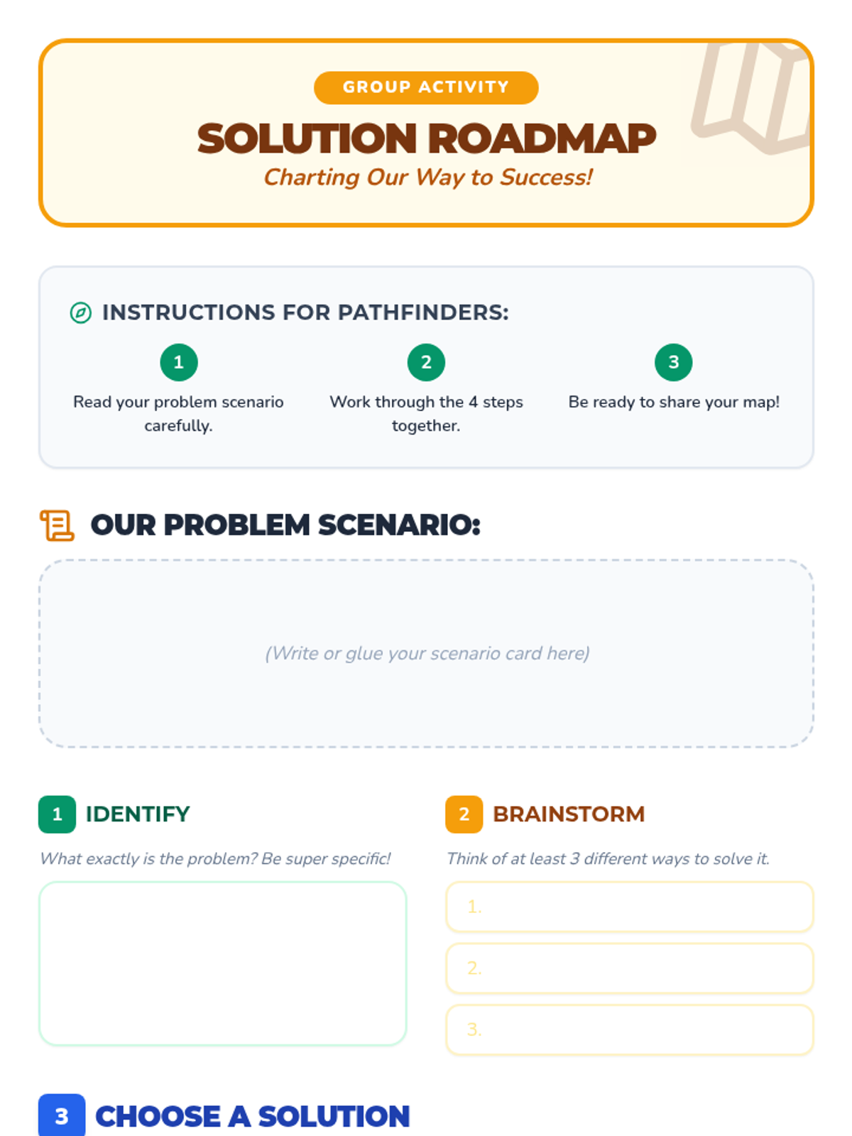 This lesson equips 3rd graders with a step-by-step approach to identify and resolve everyday challenges through a 'solution roadmap' and interactive role-playing. Students will practice breaking down problems, brainstorming options, and evaluating outcomes to build independence and resilience.