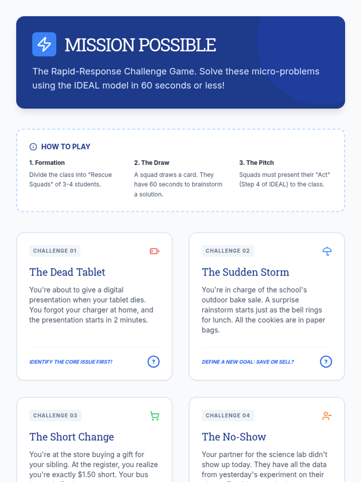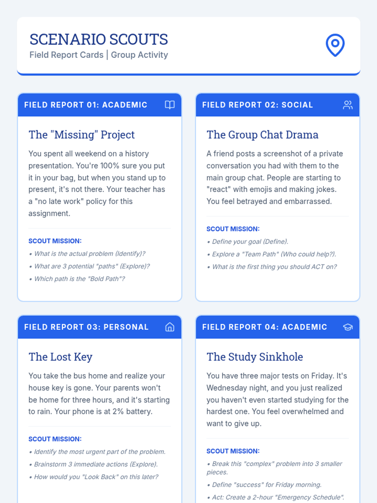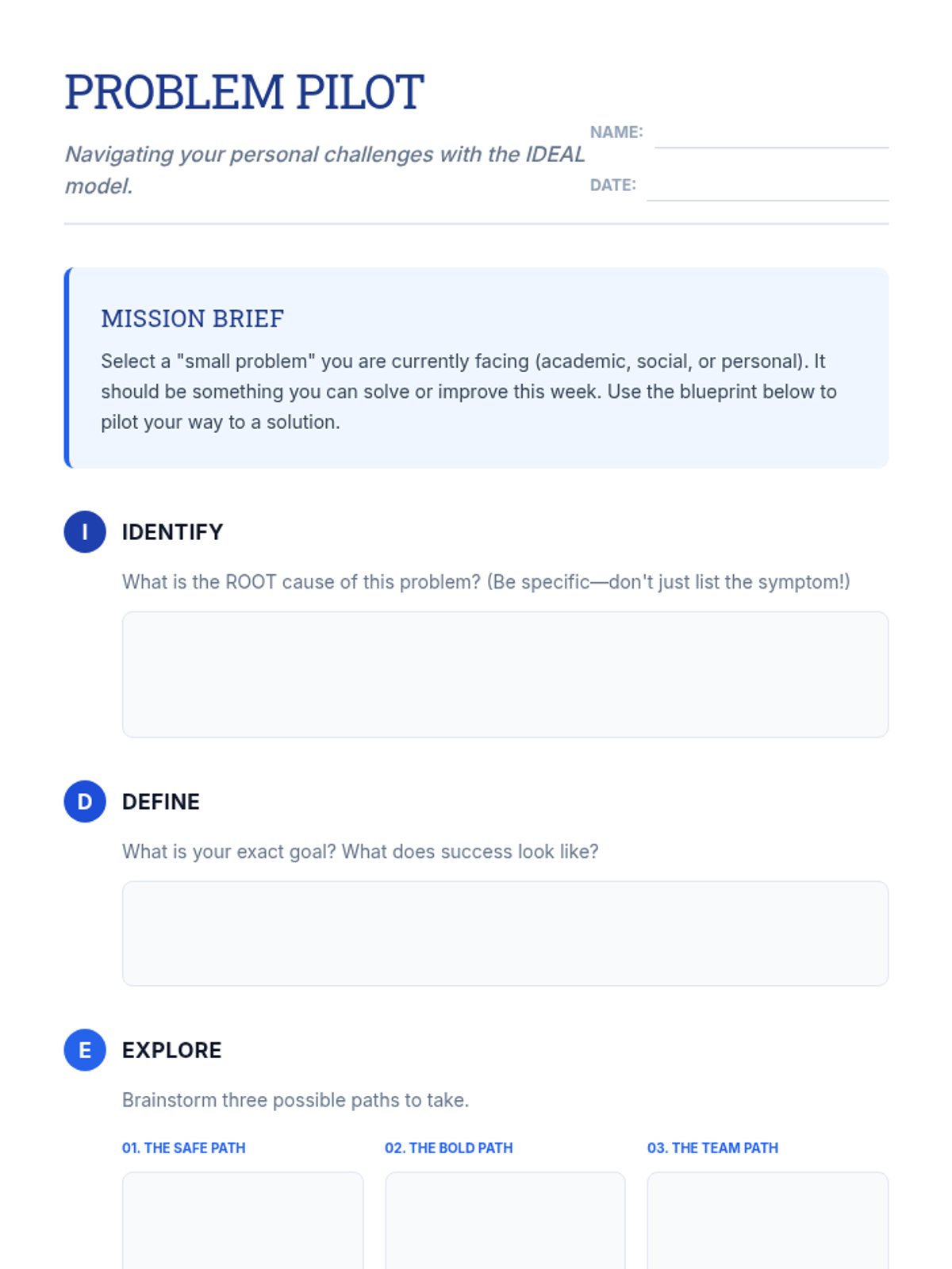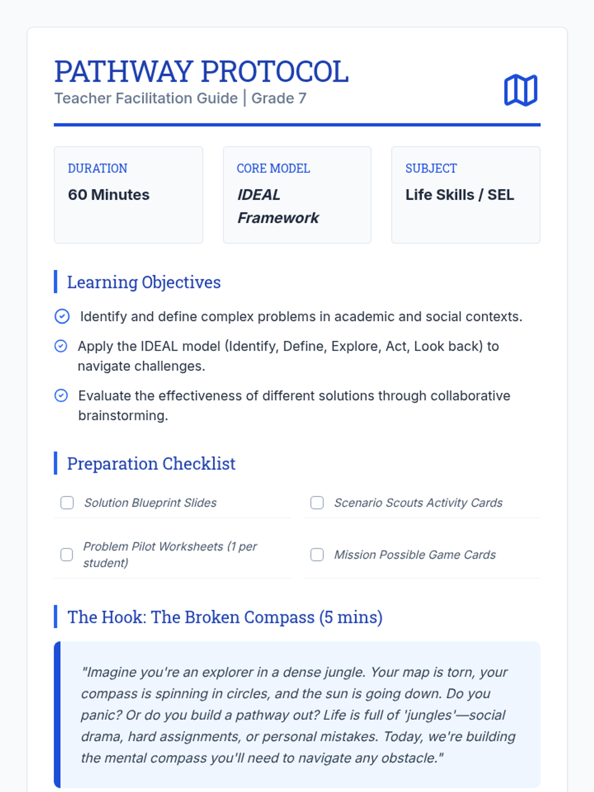 A structured lesson for 7th graders that introduces the IDEAL problem-solving model through collaborative case studies and individual application. Students learn to navigate academic, social, and personal challenges using architectural-themed blueprints for critical thinking.