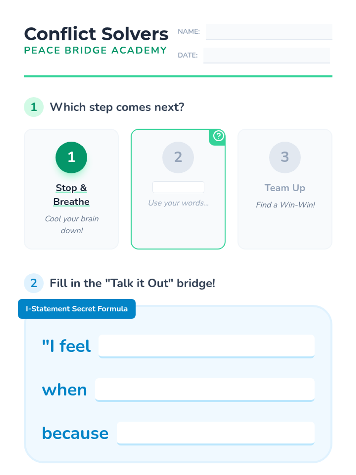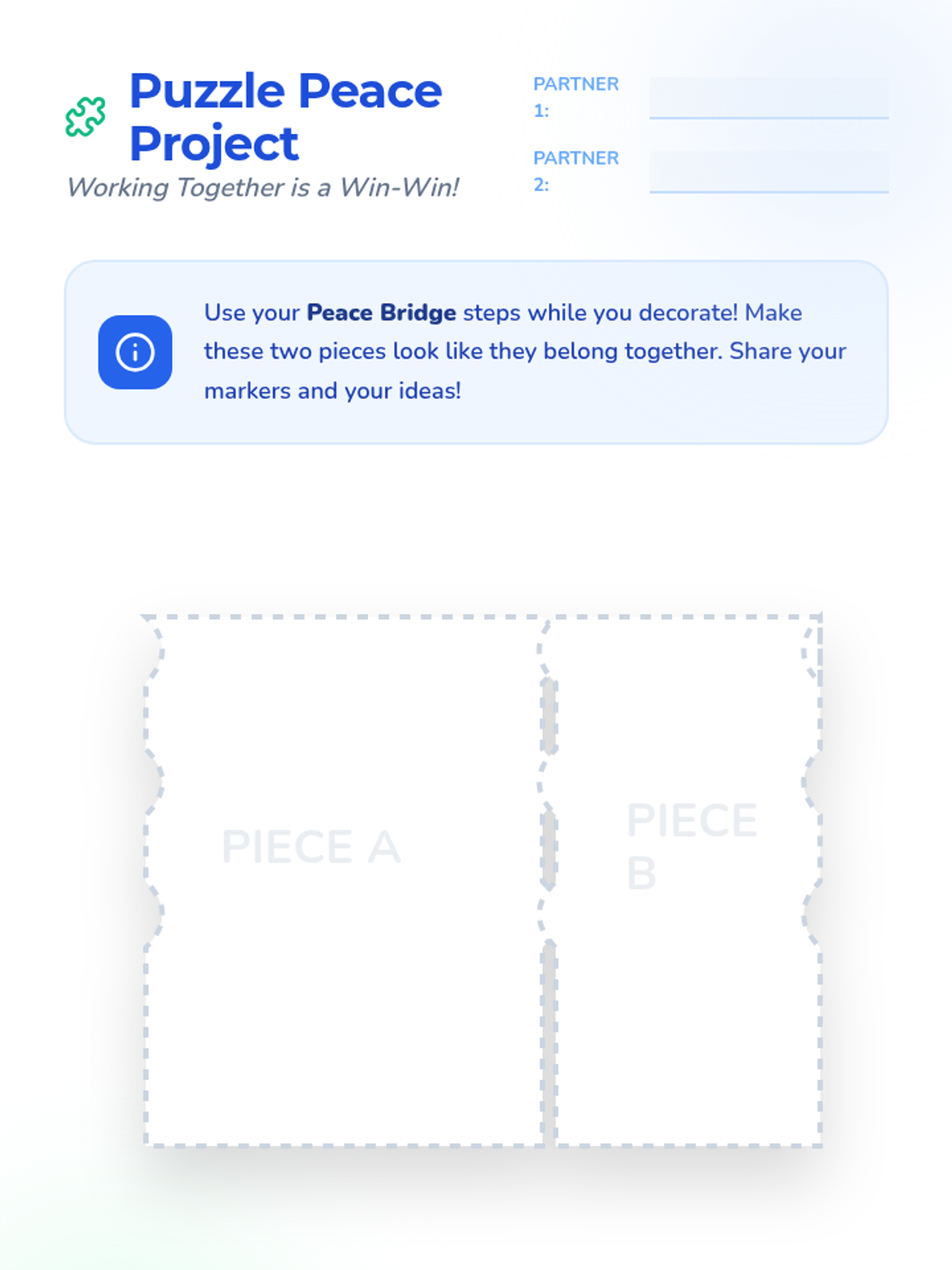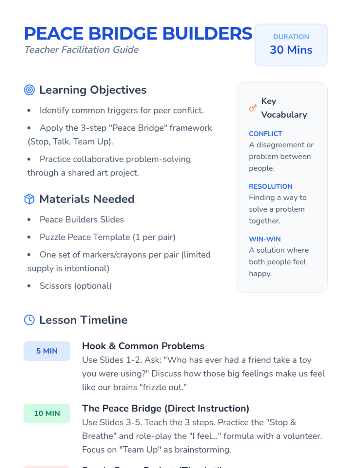 A 30-minute SEL lesson focused on teaching students a 3-step "Peace Bridge" framework for resolving peer conflicts, culminating in a collaborative puzzle art project.