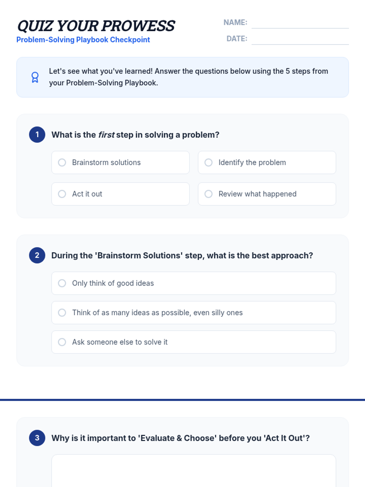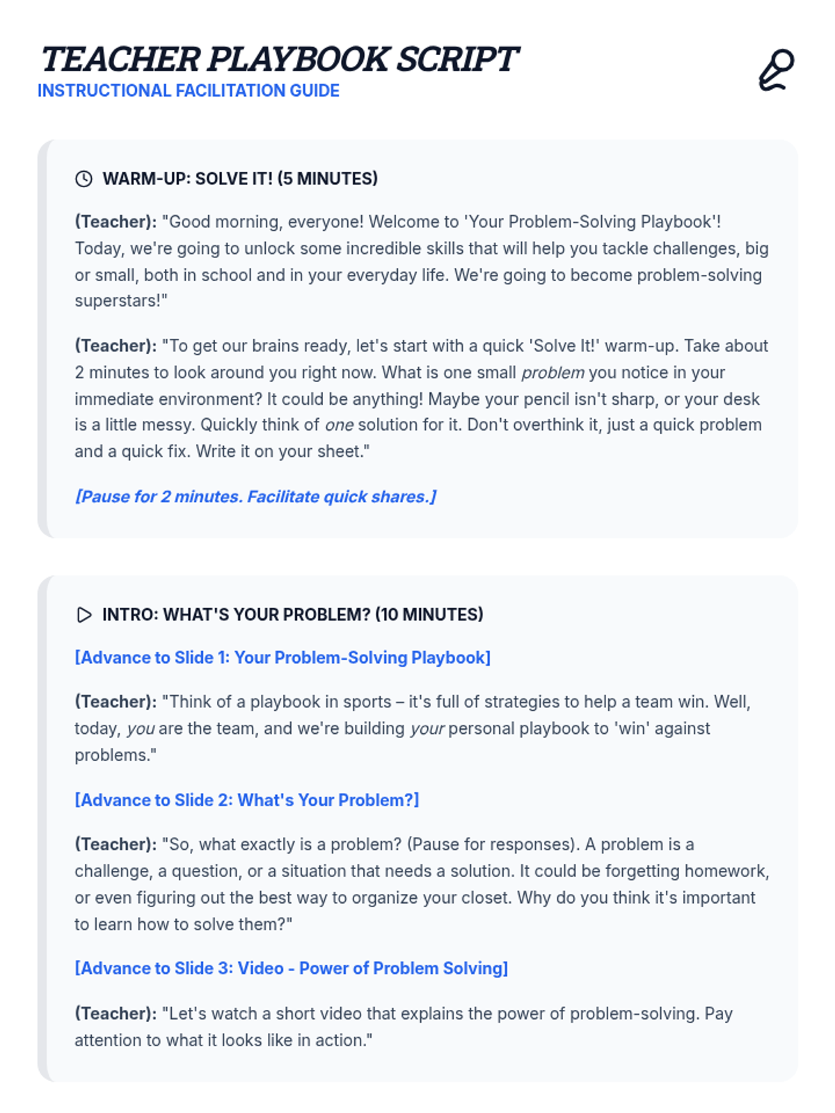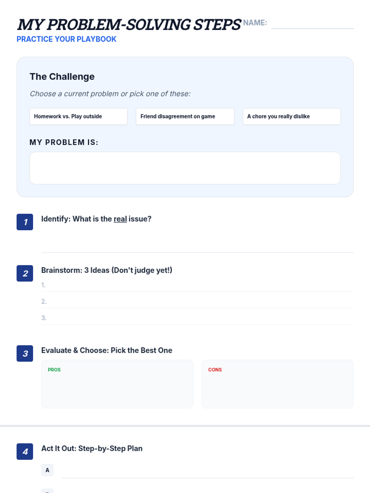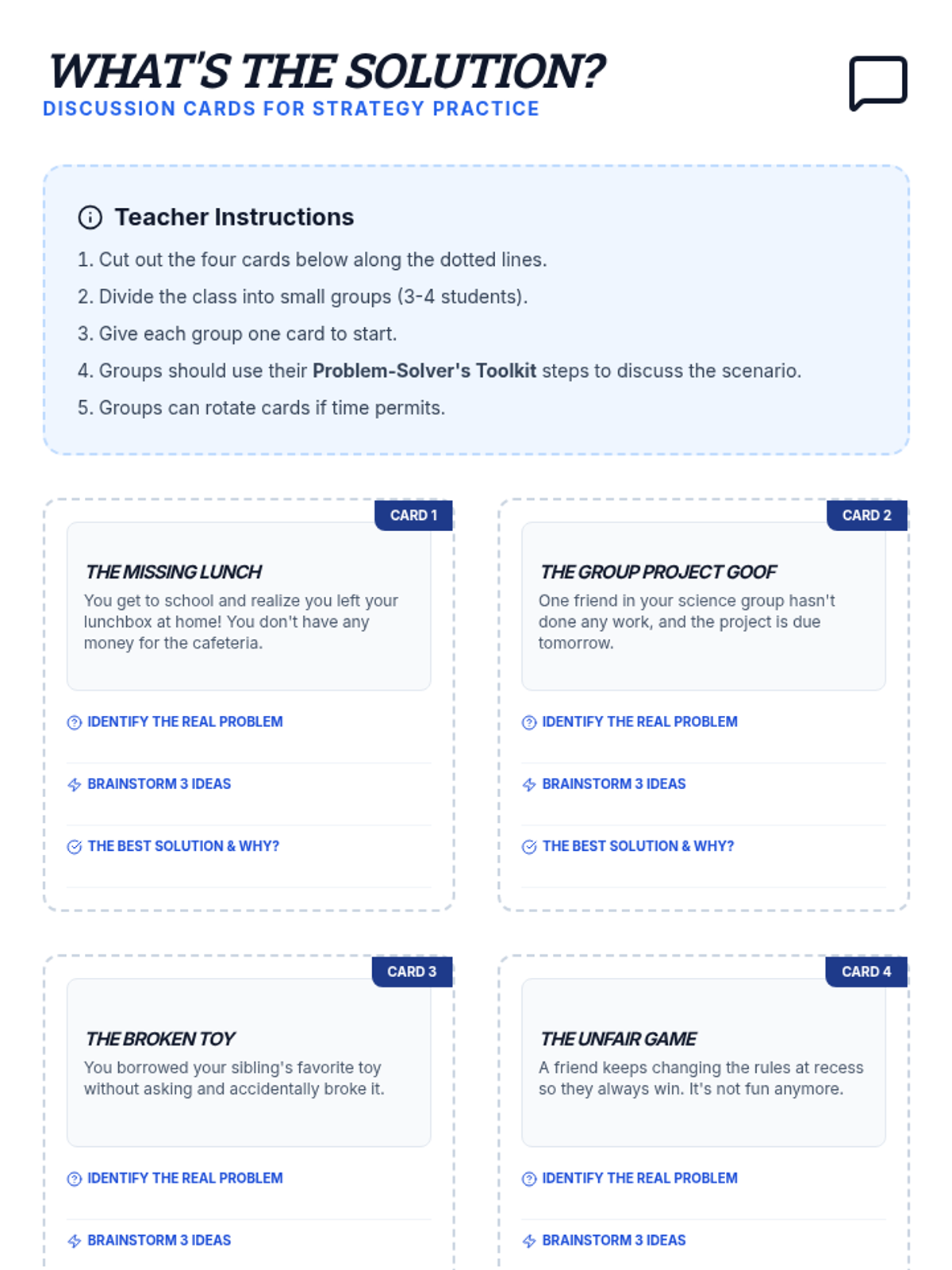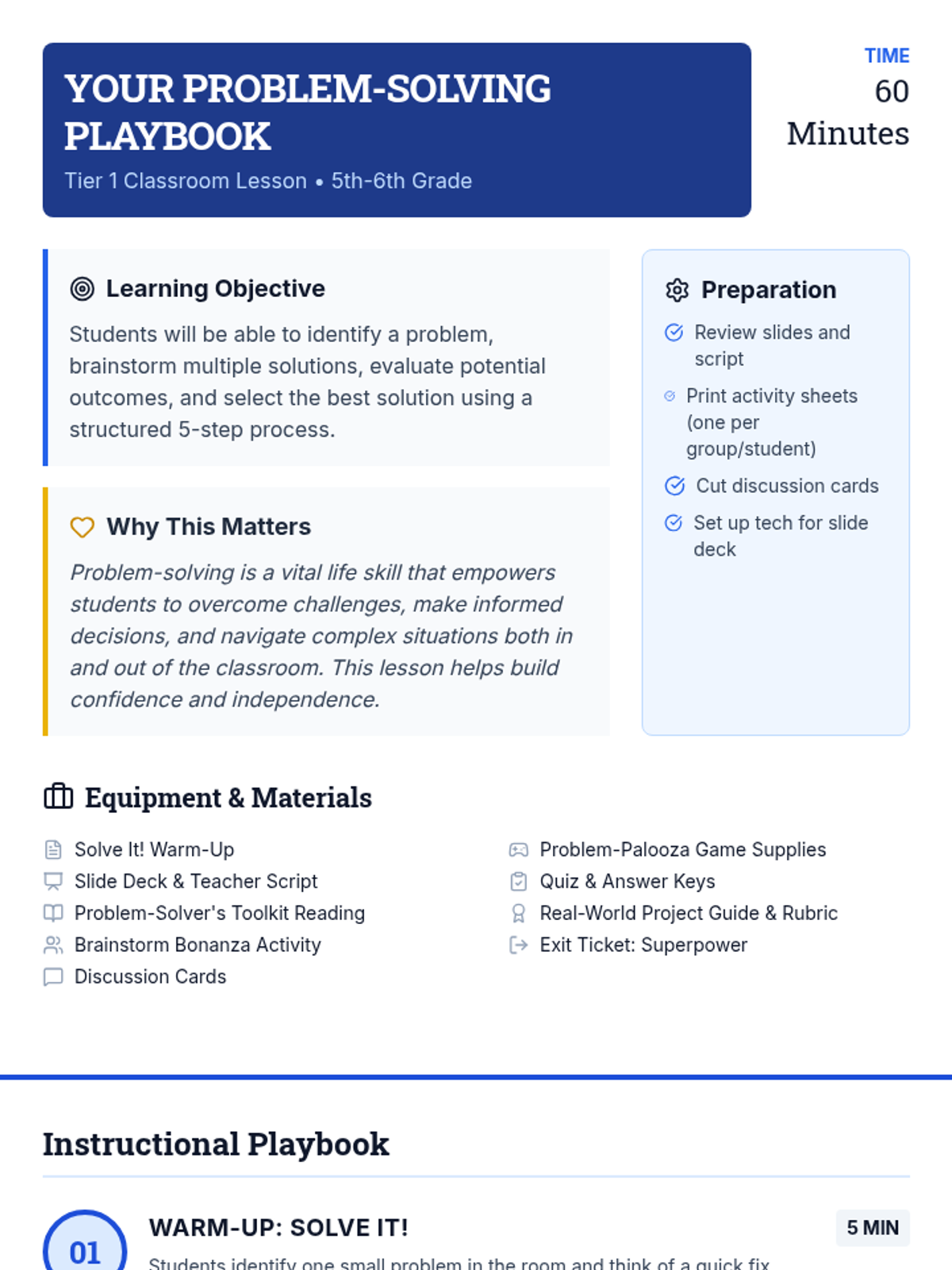 This lesson equips 5th and 6th-grade students with essential problem-solving strategies through a 'Playbook' approach. Students will learn to identify problems, brainstorm creative solutions, and evaluate outcomes using interactive games and real-world scenarios.