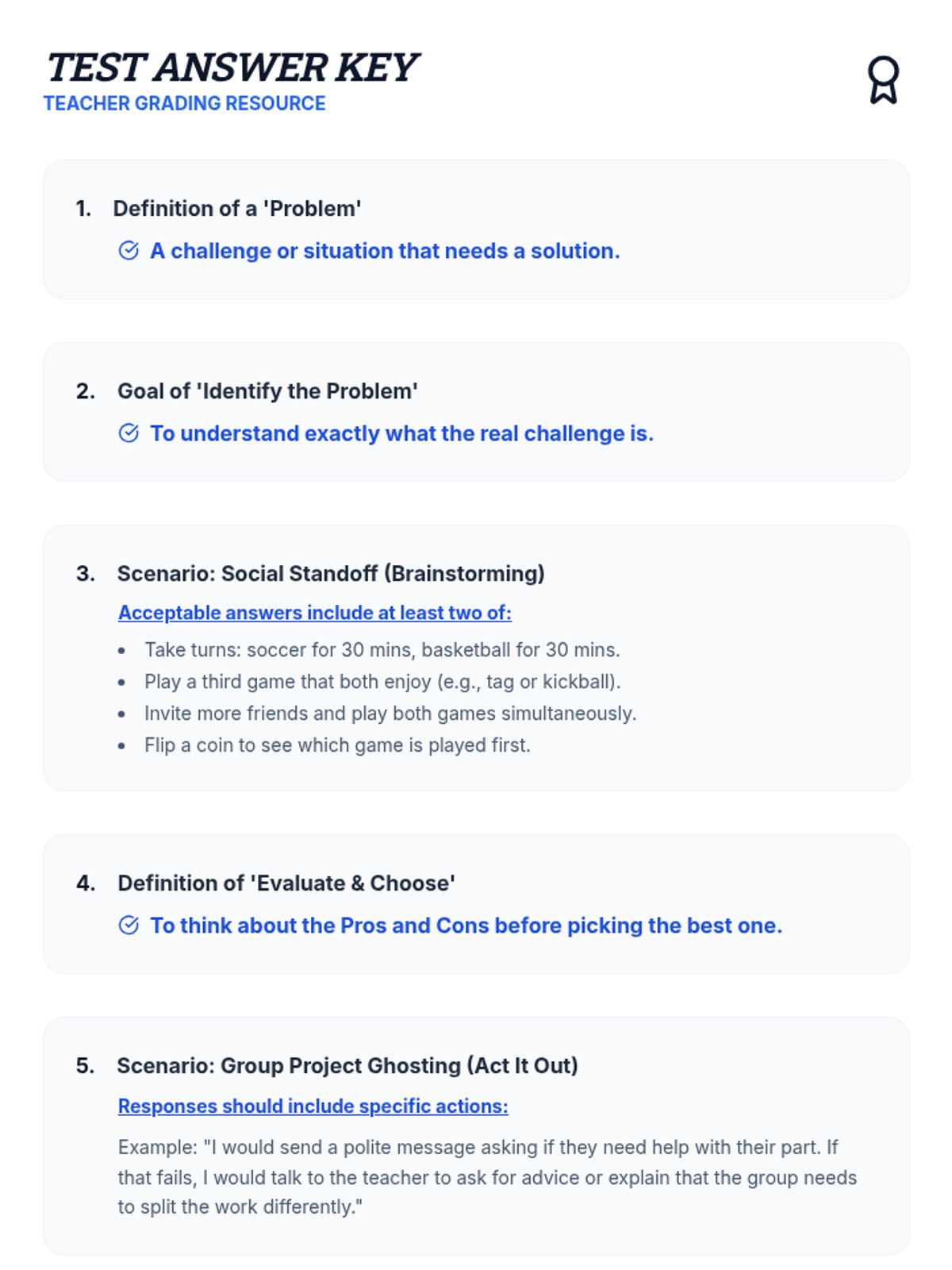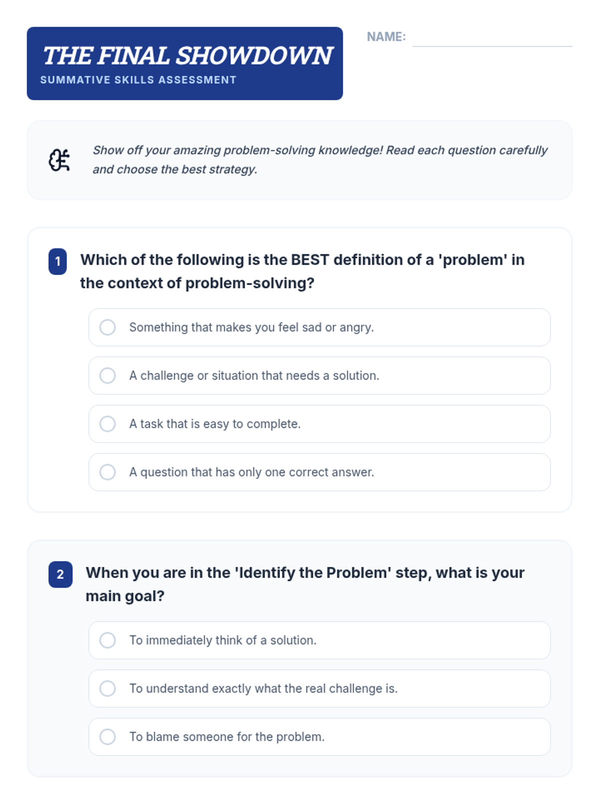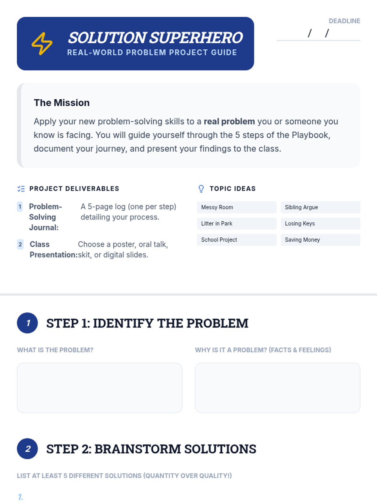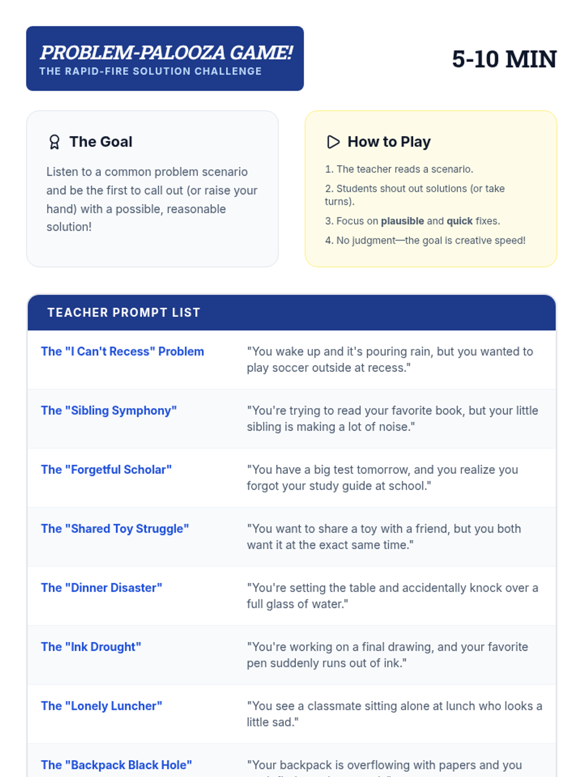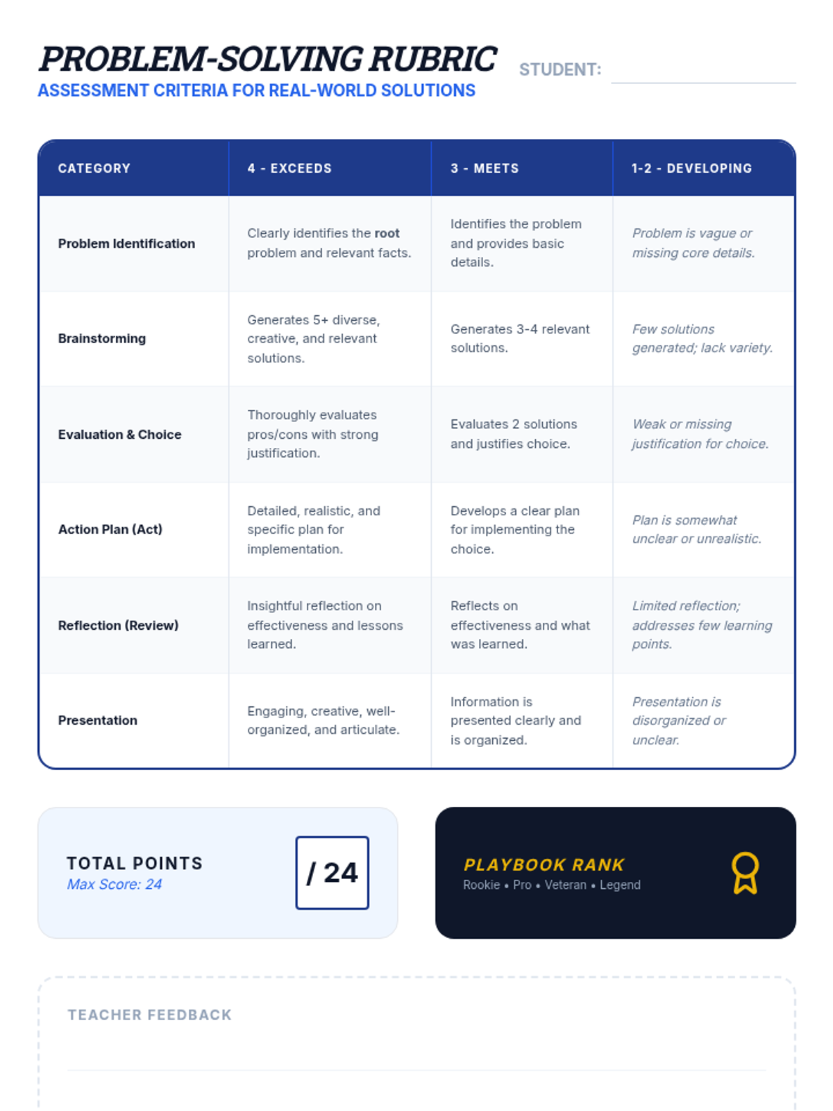 This lesson equips 5th and 6th-grade students with essential problem-solving strategies through a 'Playbook' approach. Students will learn to identify problems, brainstorm creative solutions, and evaluate outcomes using interactive games and real-world scenarios.