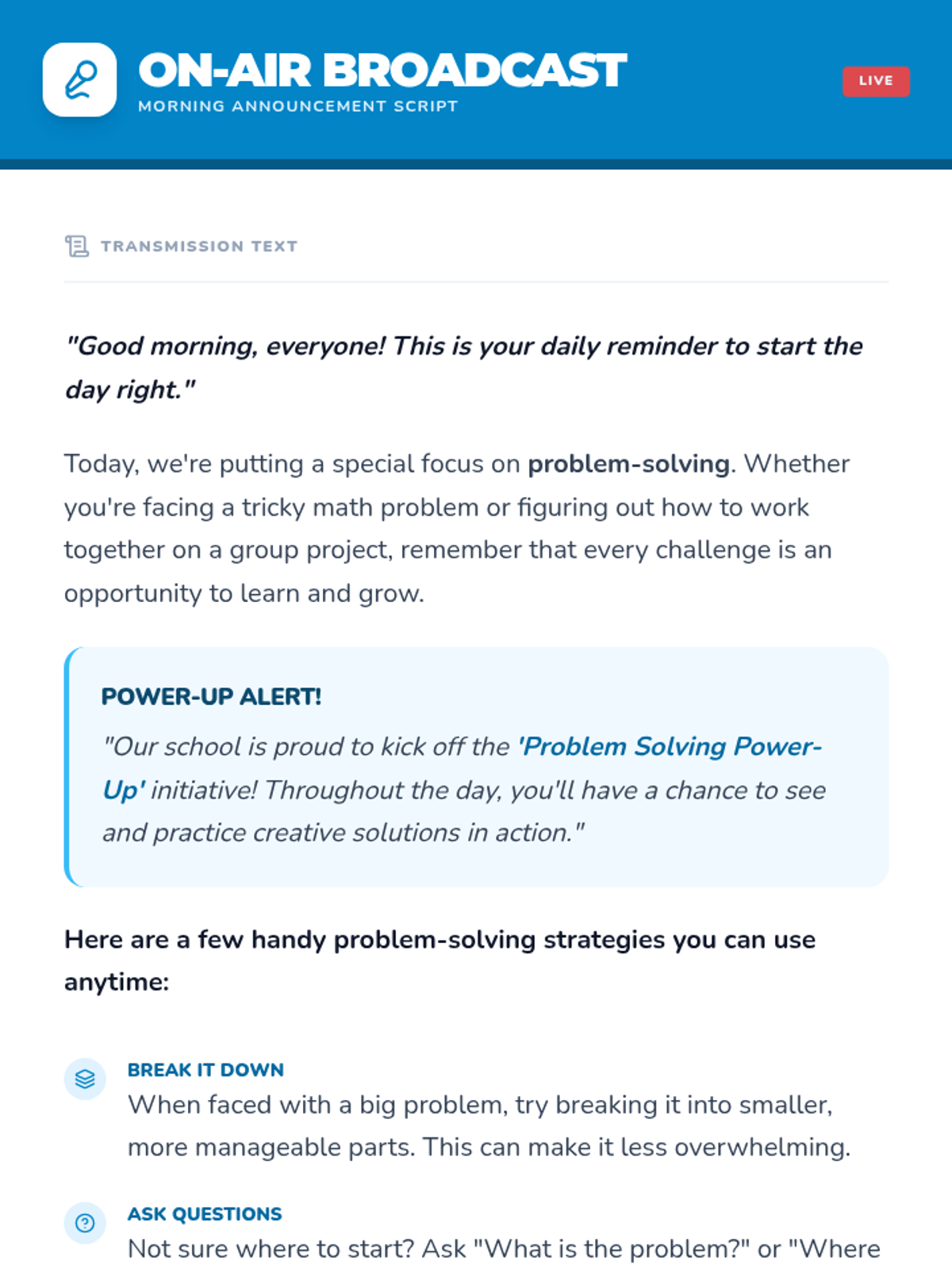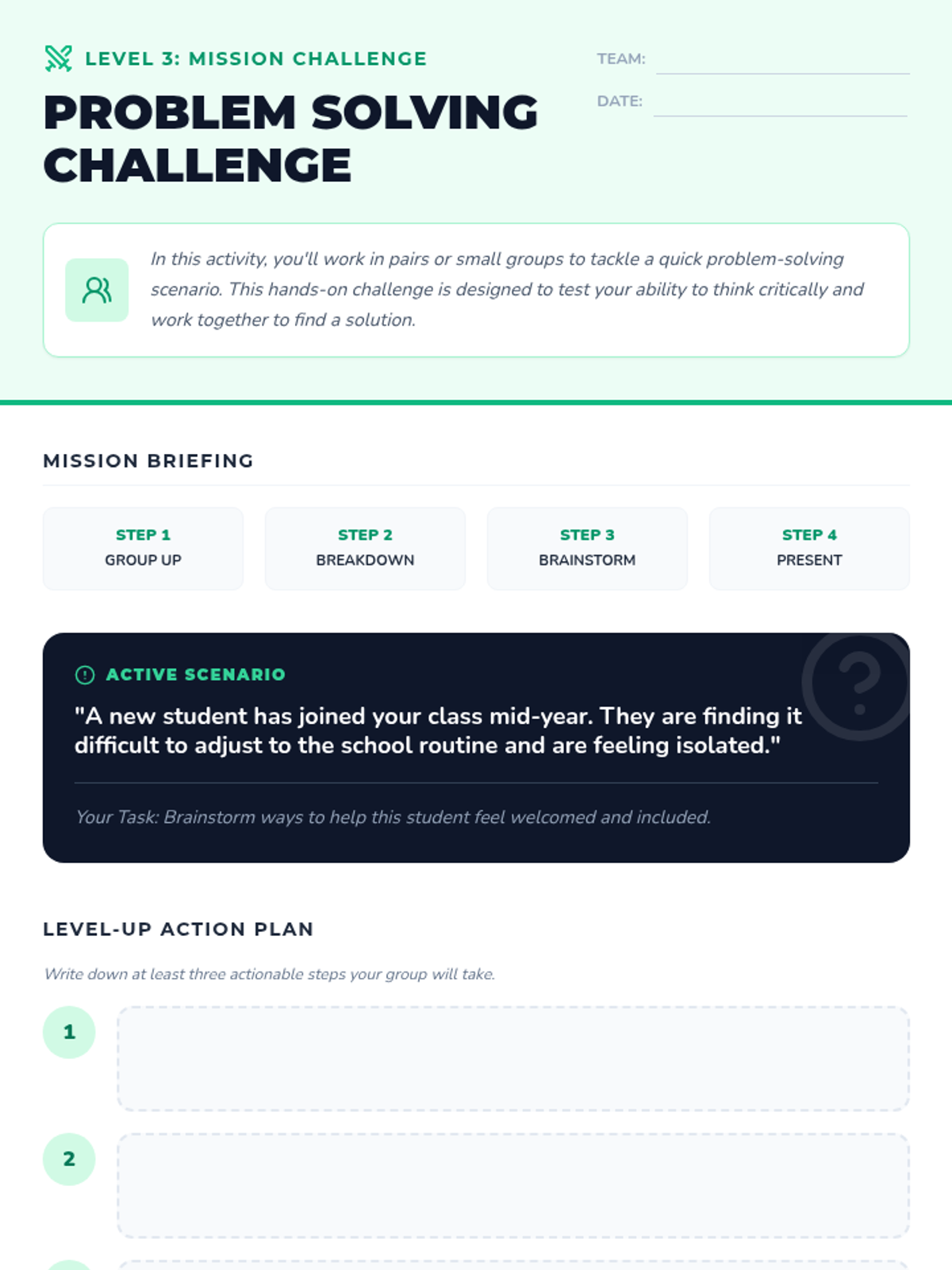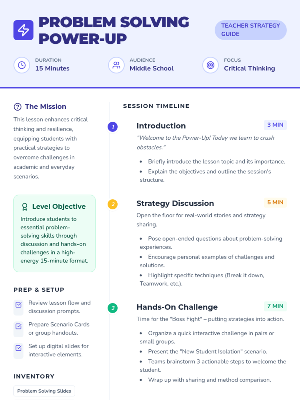 A 15-minute high-energy lesson designed for middle schoolers to learn practical problem-solving strategies through interactive challenges and role-play. Students level up their critical thinking and resilience.