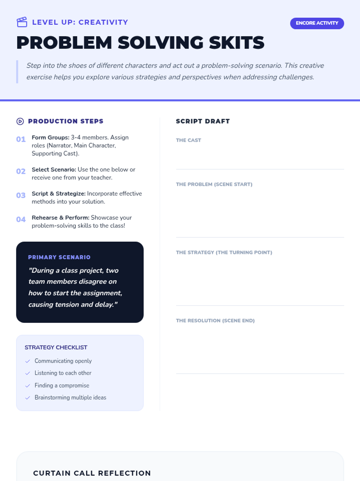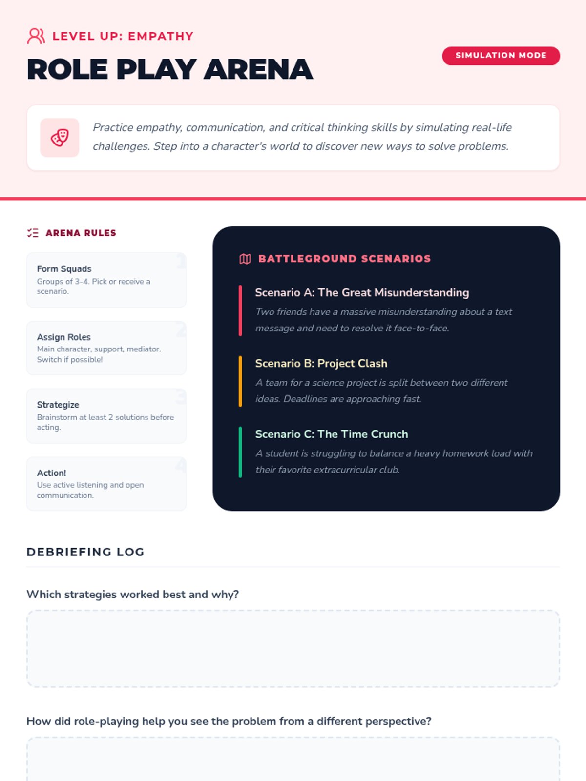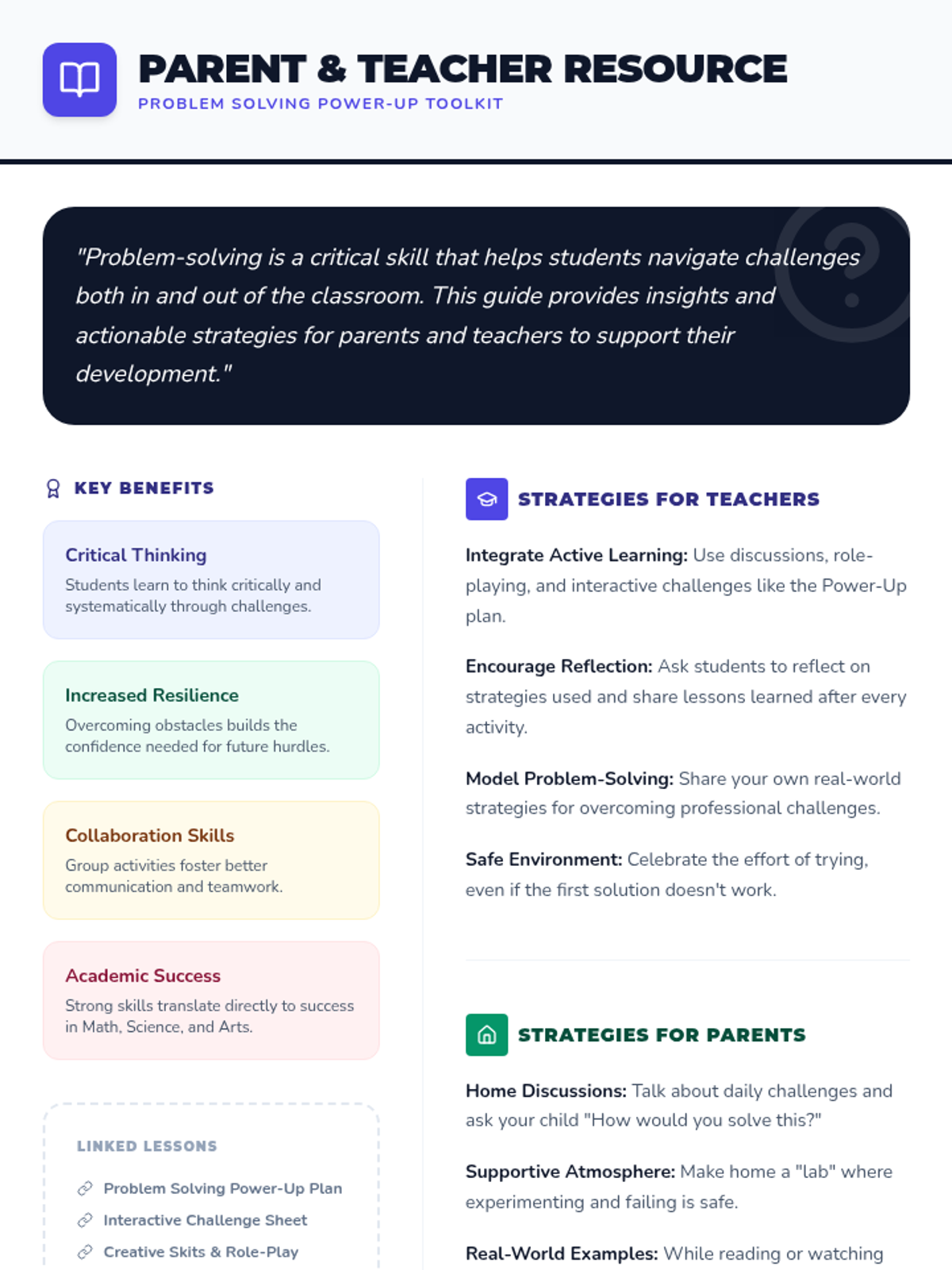 A 15-minute high-energy lesson designed for middle schoolers to learn practical problem-solving strategies through interactive challenges and role-play. Students level up their critical thinking and resilience.