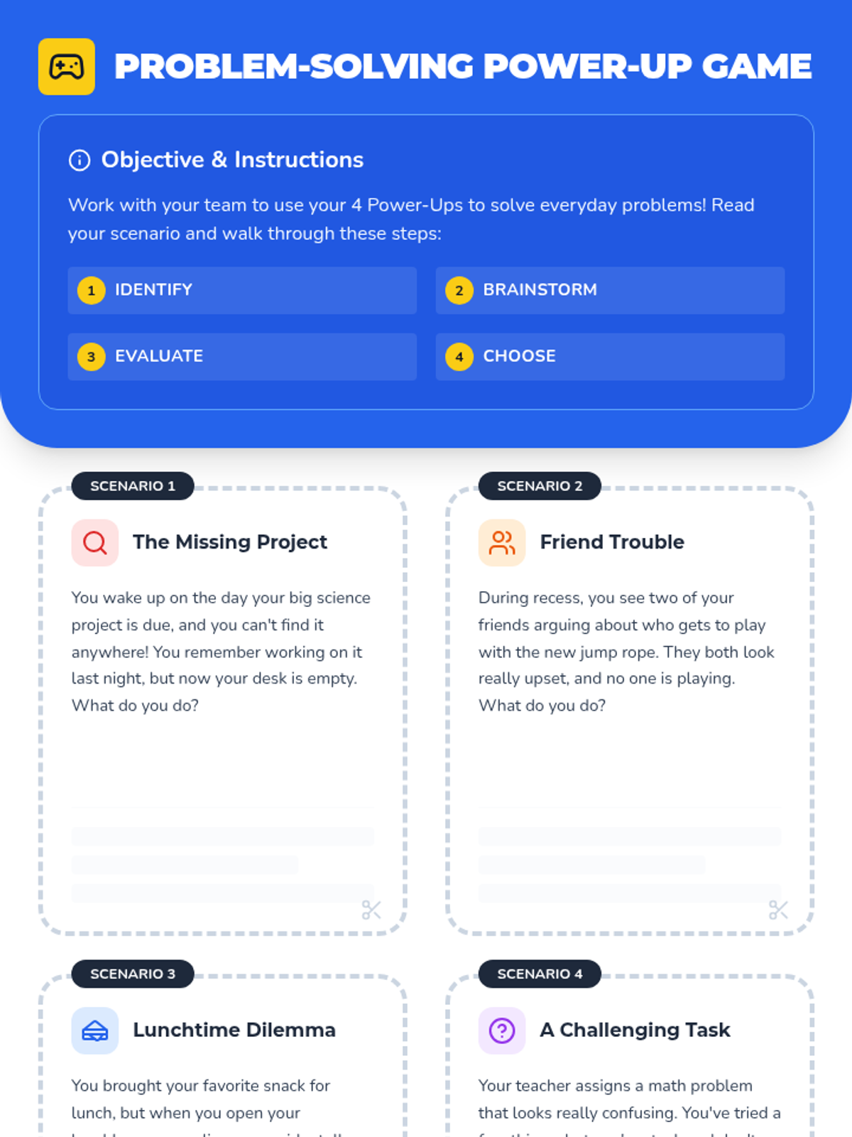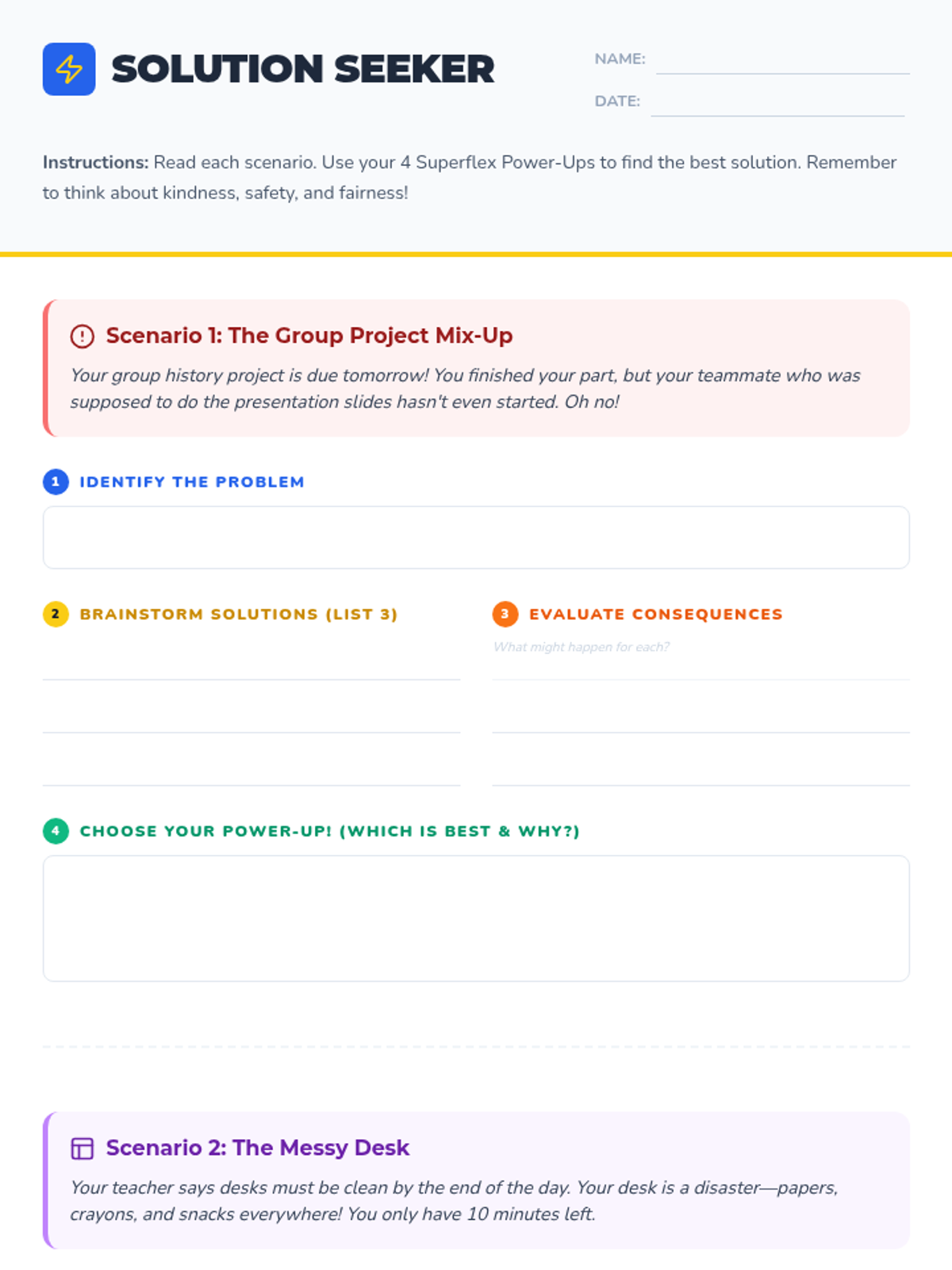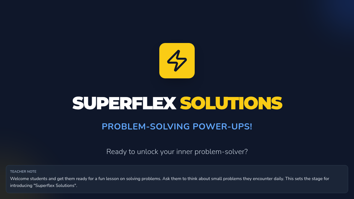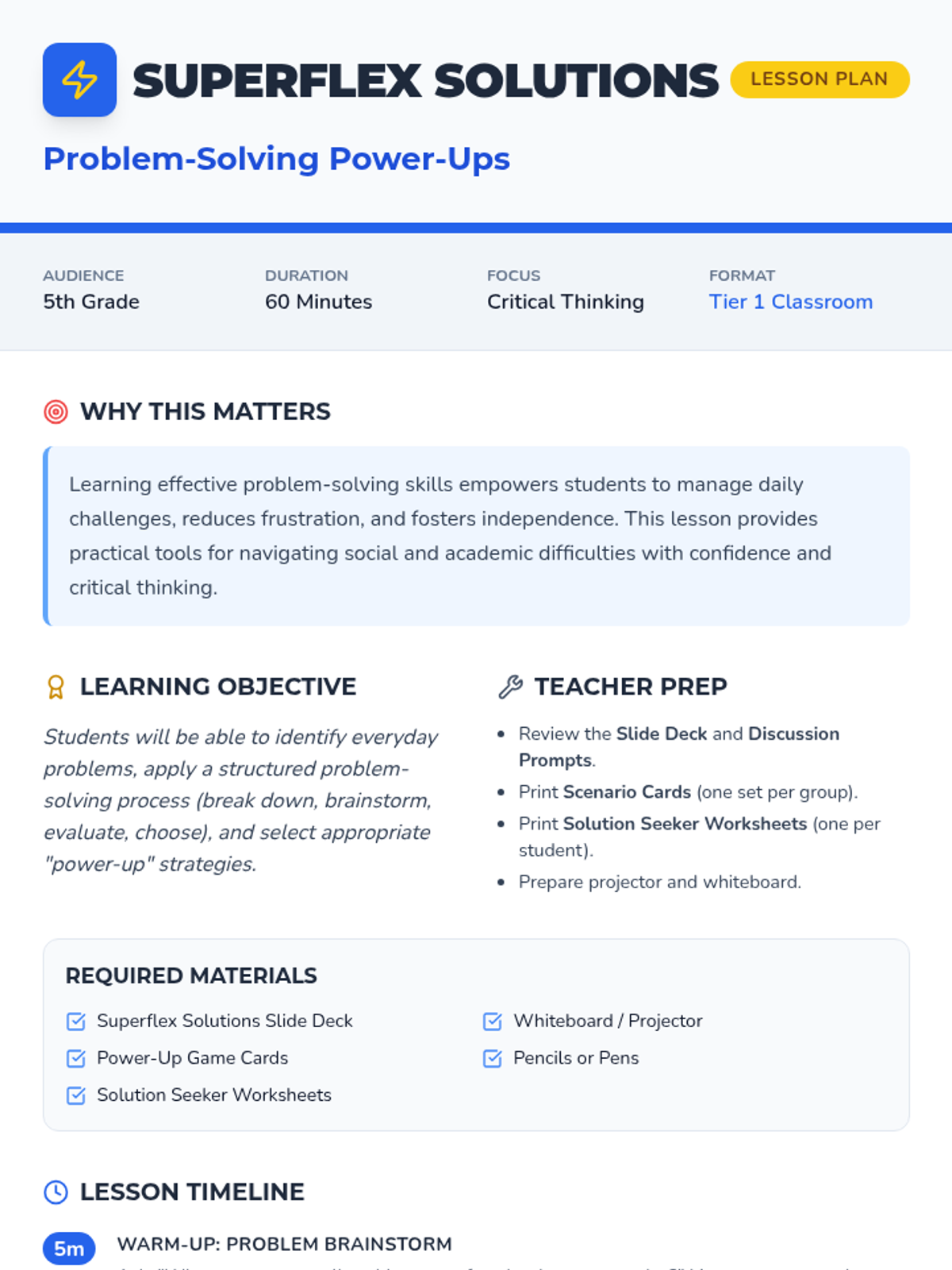 This lesson introduces 5th graders to a structured approach to everyday problem-solving using 'Superflex Solutions'. Students will learn to break down challenges, brainstorm solutions, evaluate consequences, and choose effective strategies through interactive slides, a group game, and independent practice.