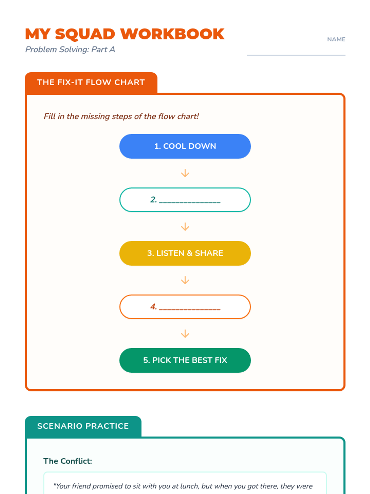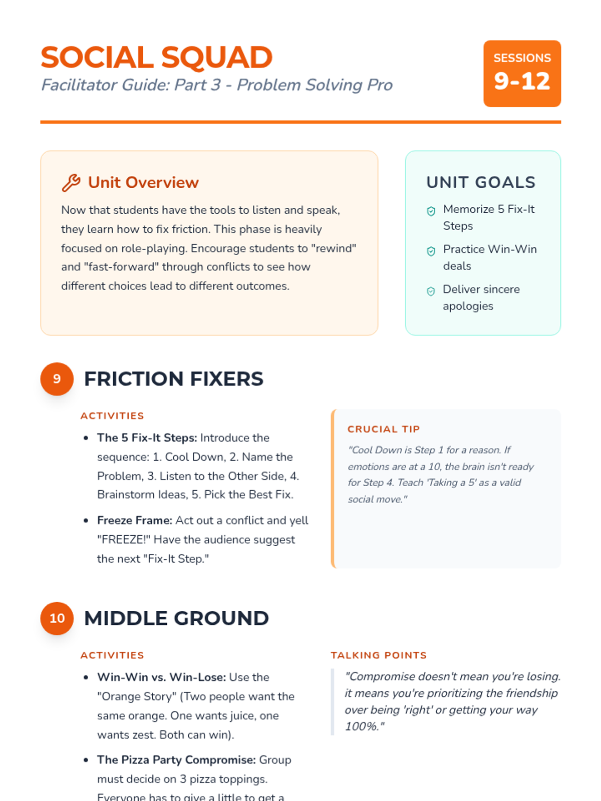 Sessions 9-12: Learning concrete steps for conflict resolution, the art of compromise, handling social challenges like gossip, and making sincere apologies.