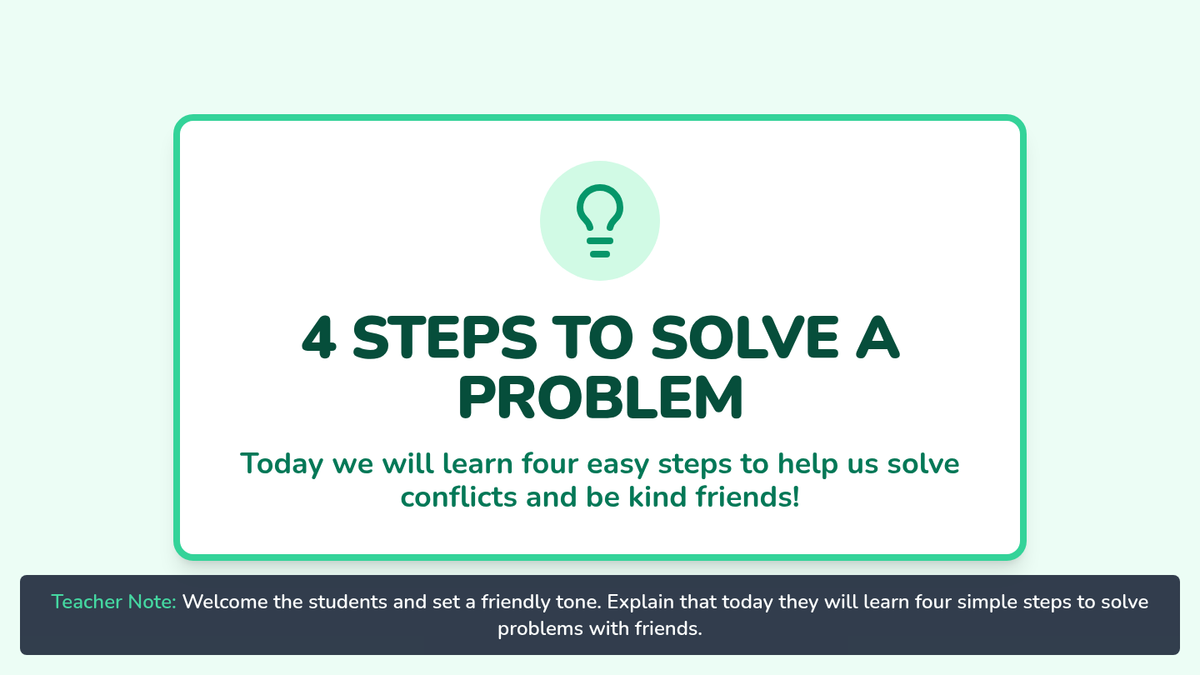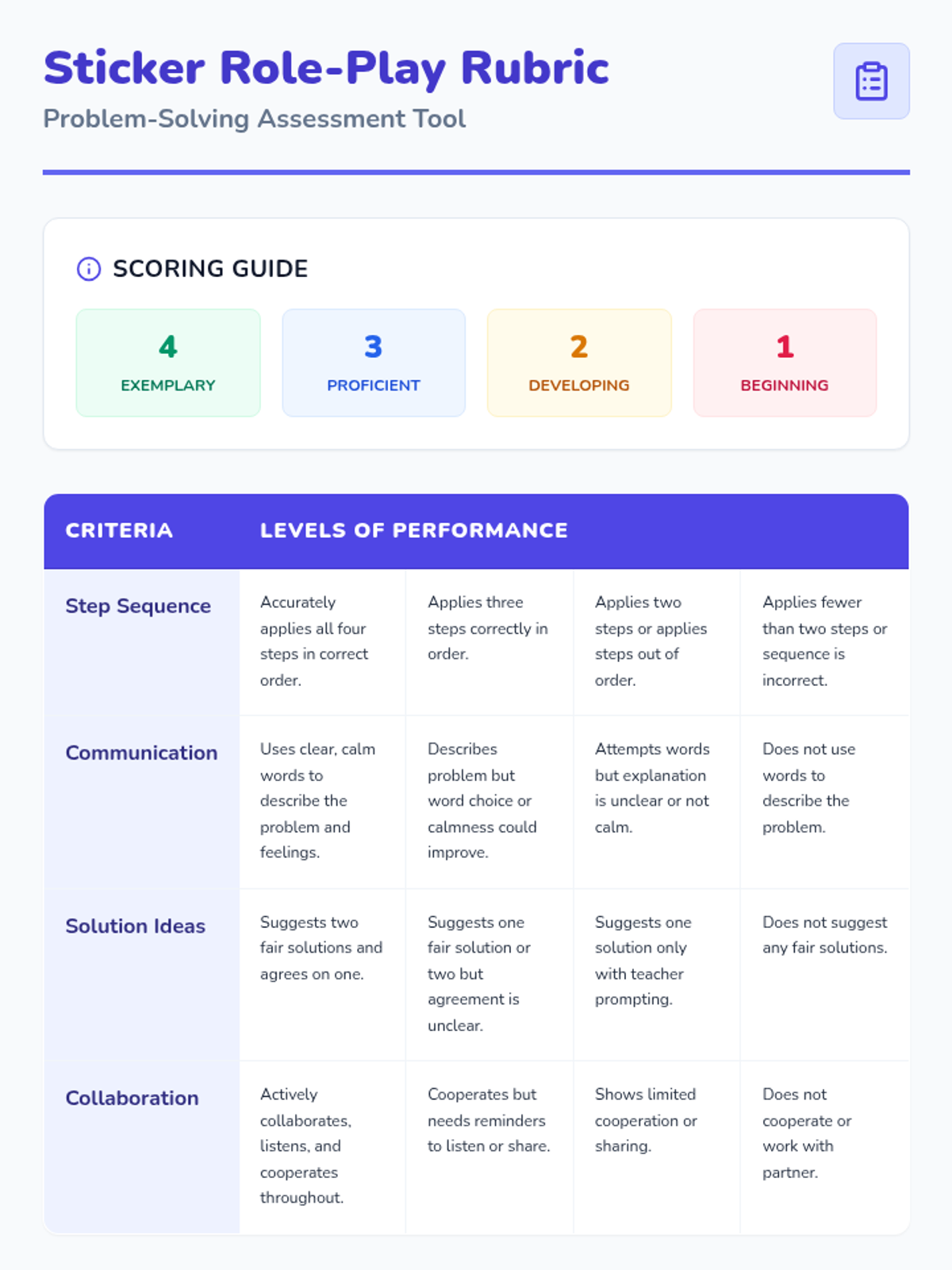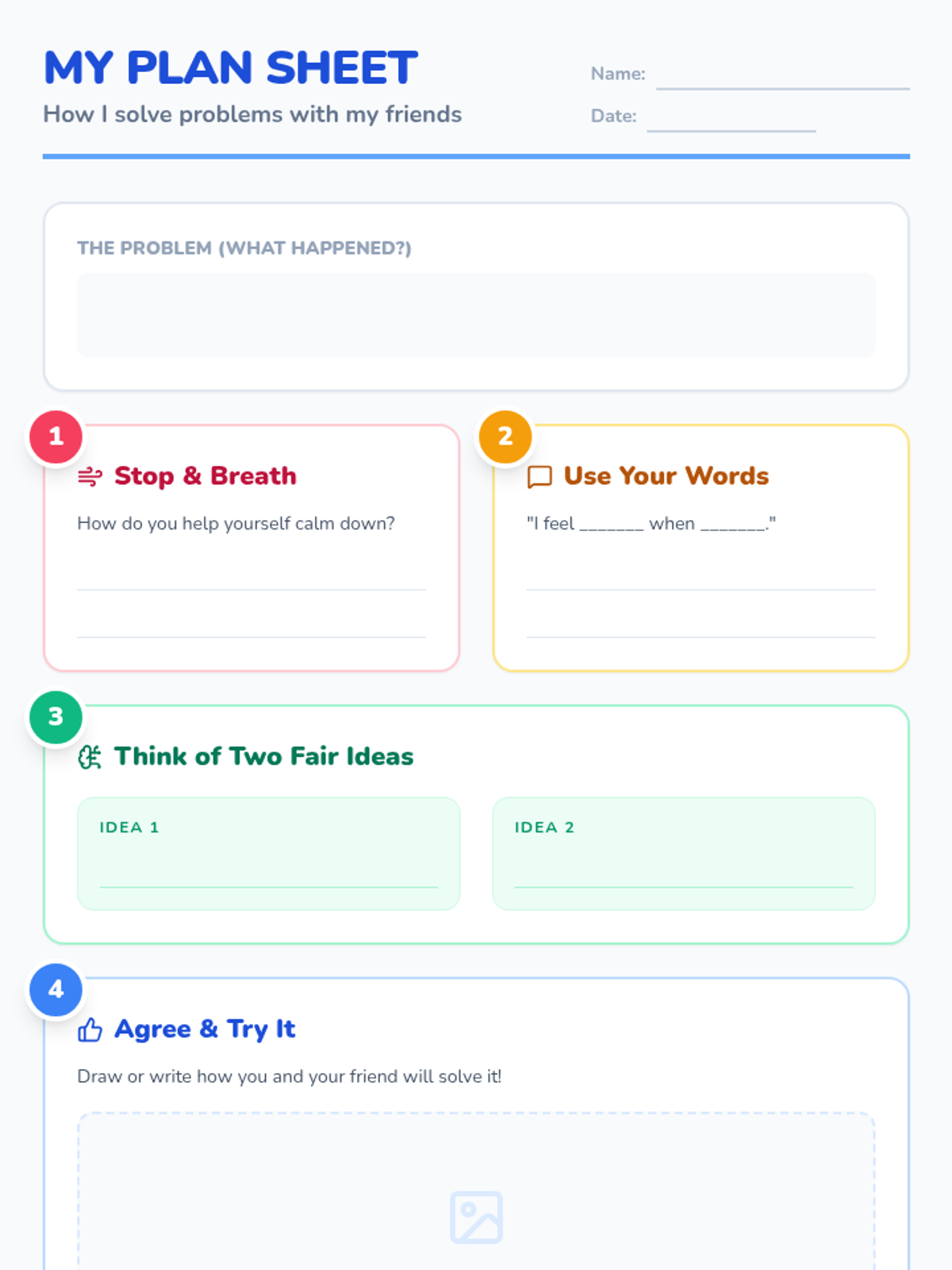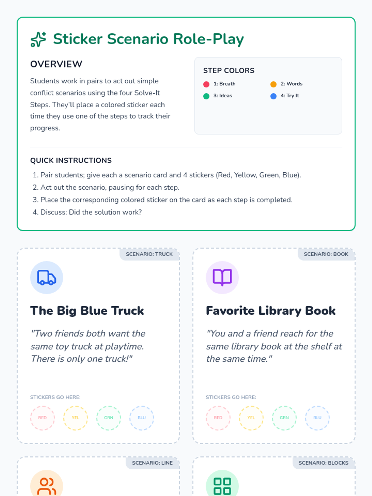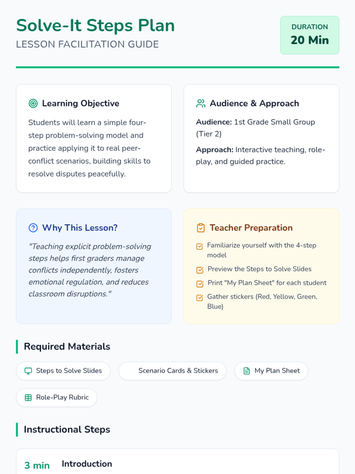 A 20-minute Tier 2 small-group lesson for 1st graders to learn and practice a four-step problem-solving model for resolving peer conflicts peacefully.