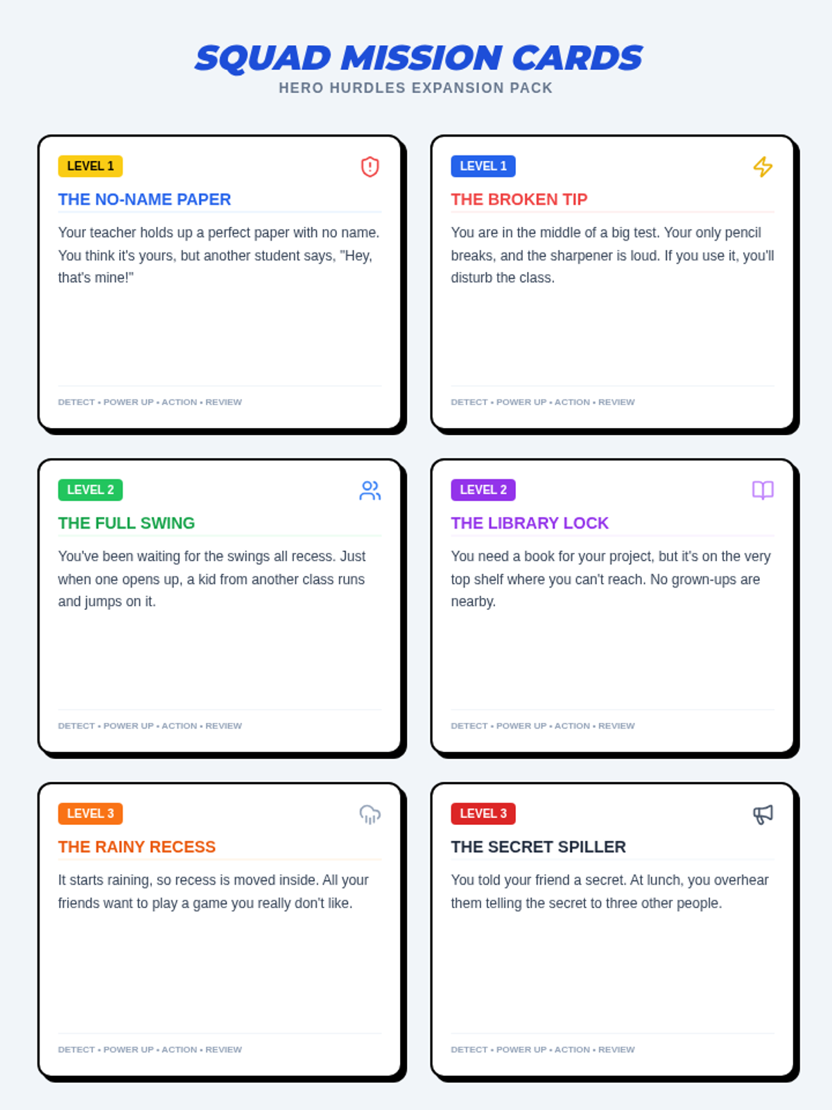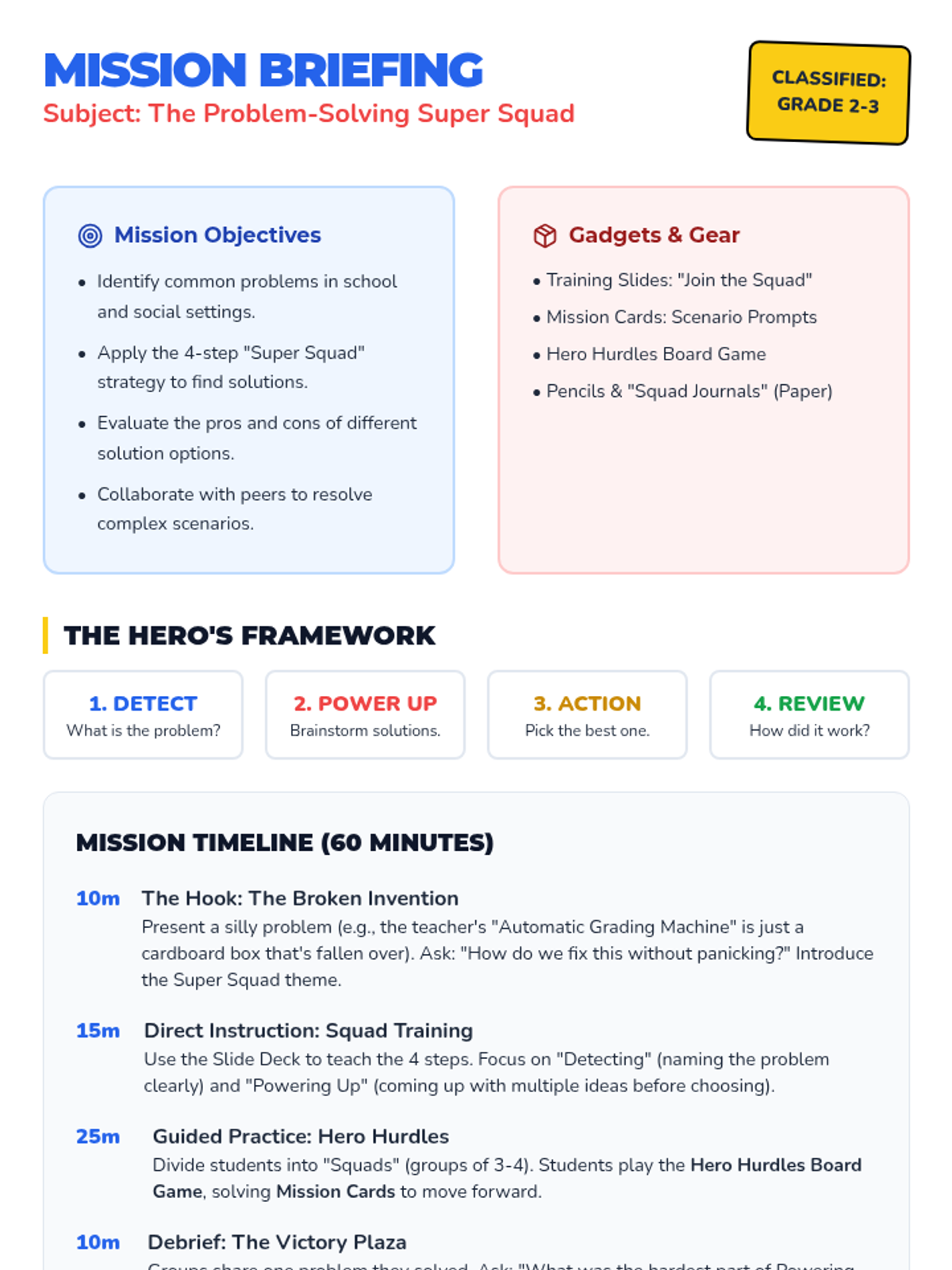 A high-energy, superhero-themed lesson for 2nd and 3rd graders that teaches a 4-step framework for solving everyday social and academic problems. Students transition from 'trainees' to 'Super Squad' members through scenario practice and a collaborative board game.
