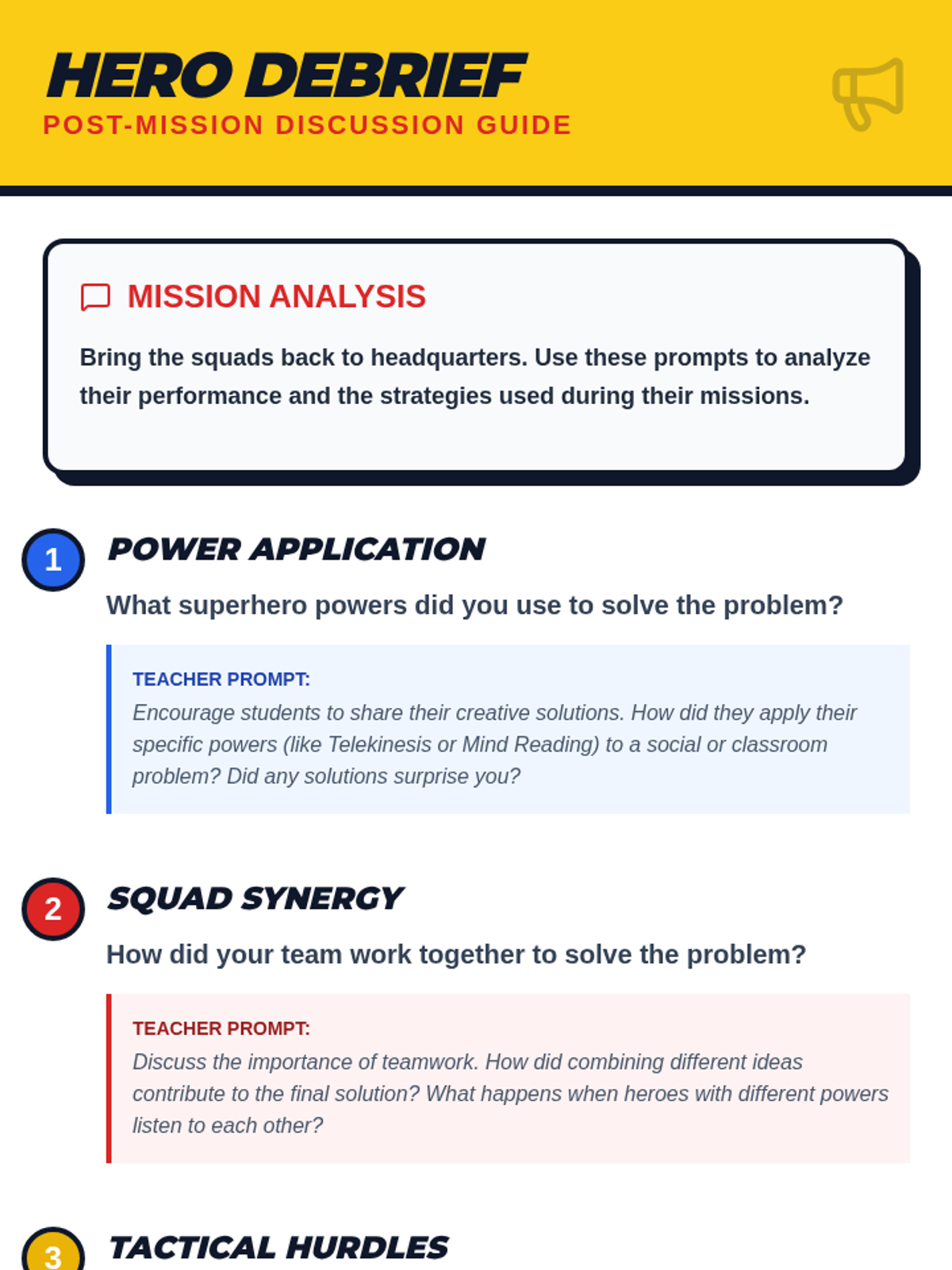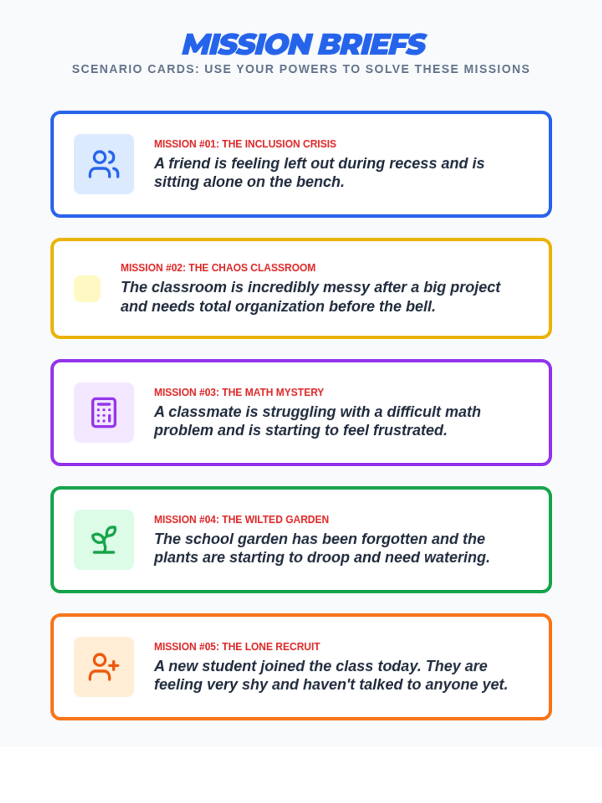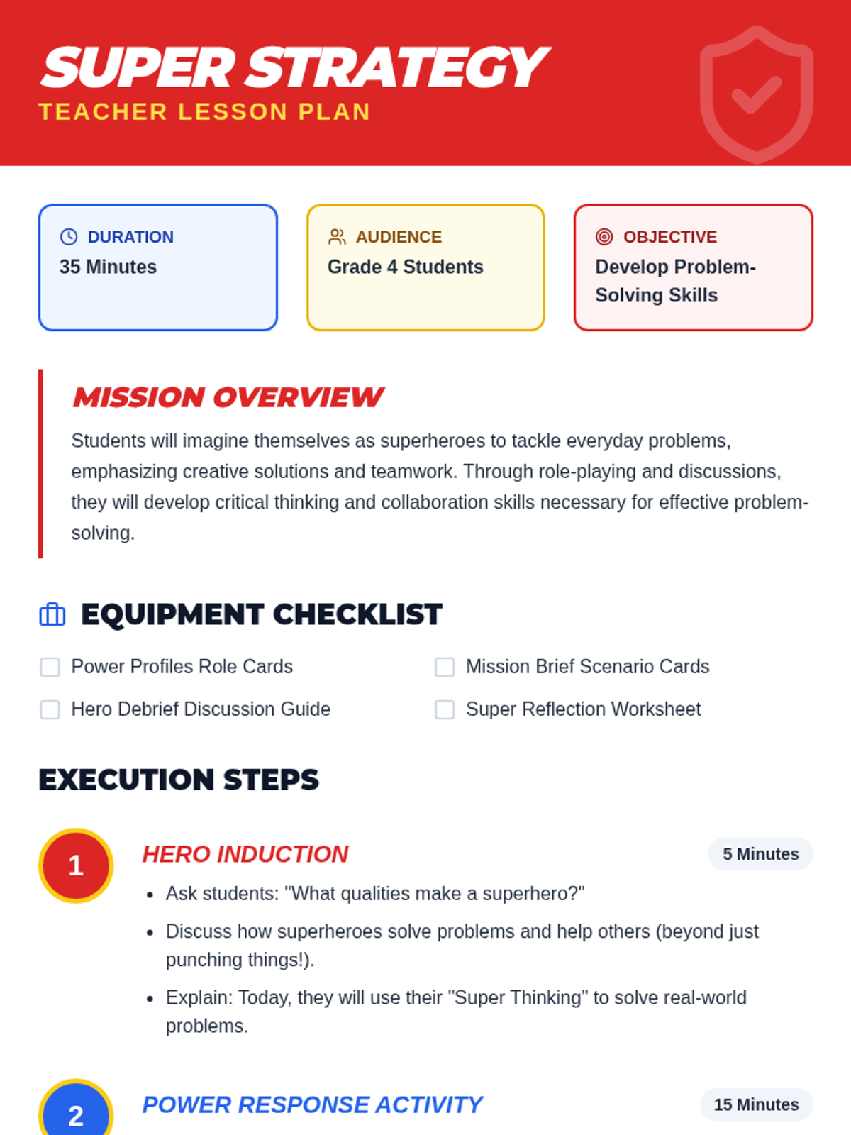 Students imagine themselves as superheroes to tackle everyday problems, emphasizing creative solutions and teamwork through role-playing and discussion.