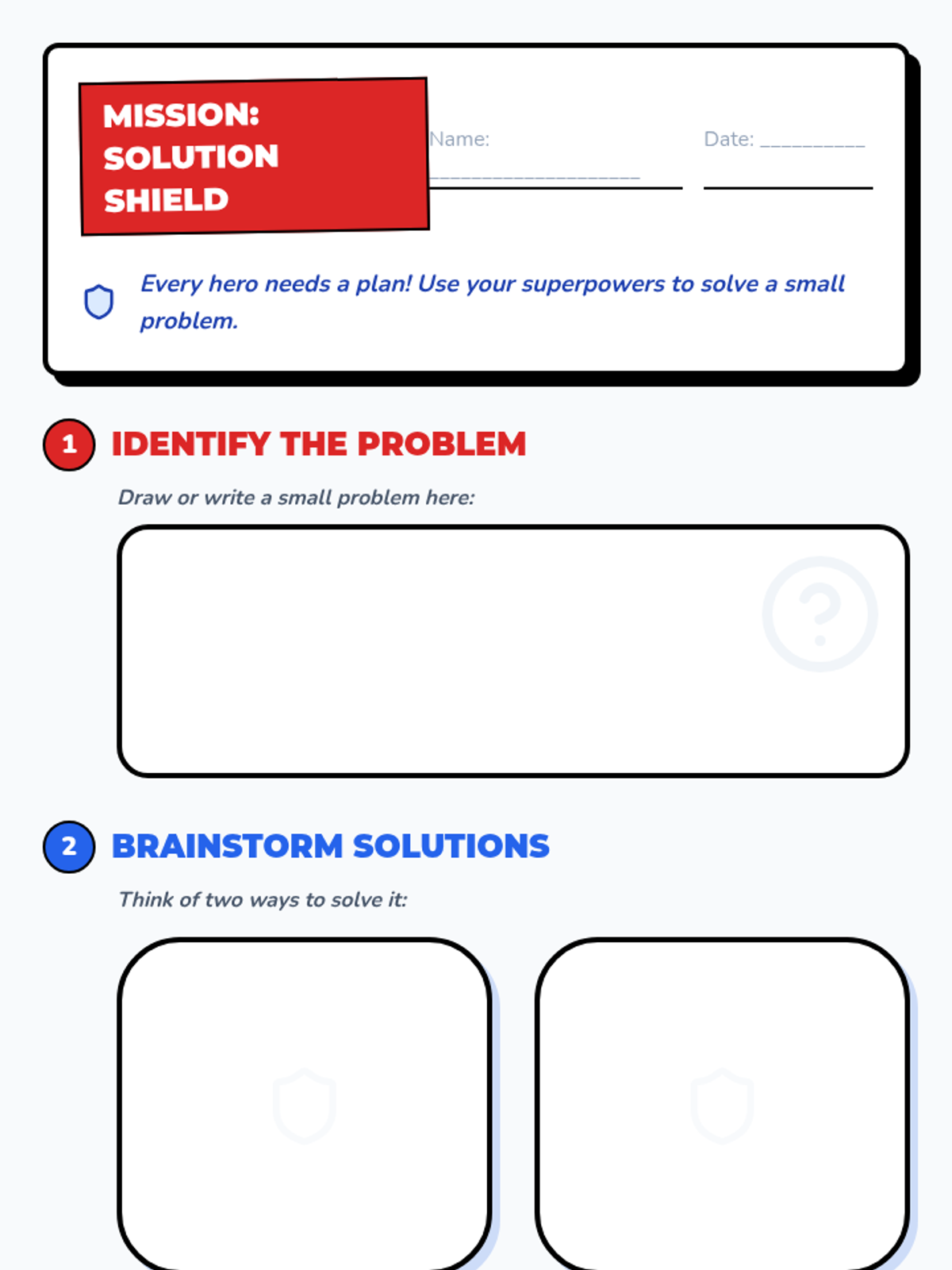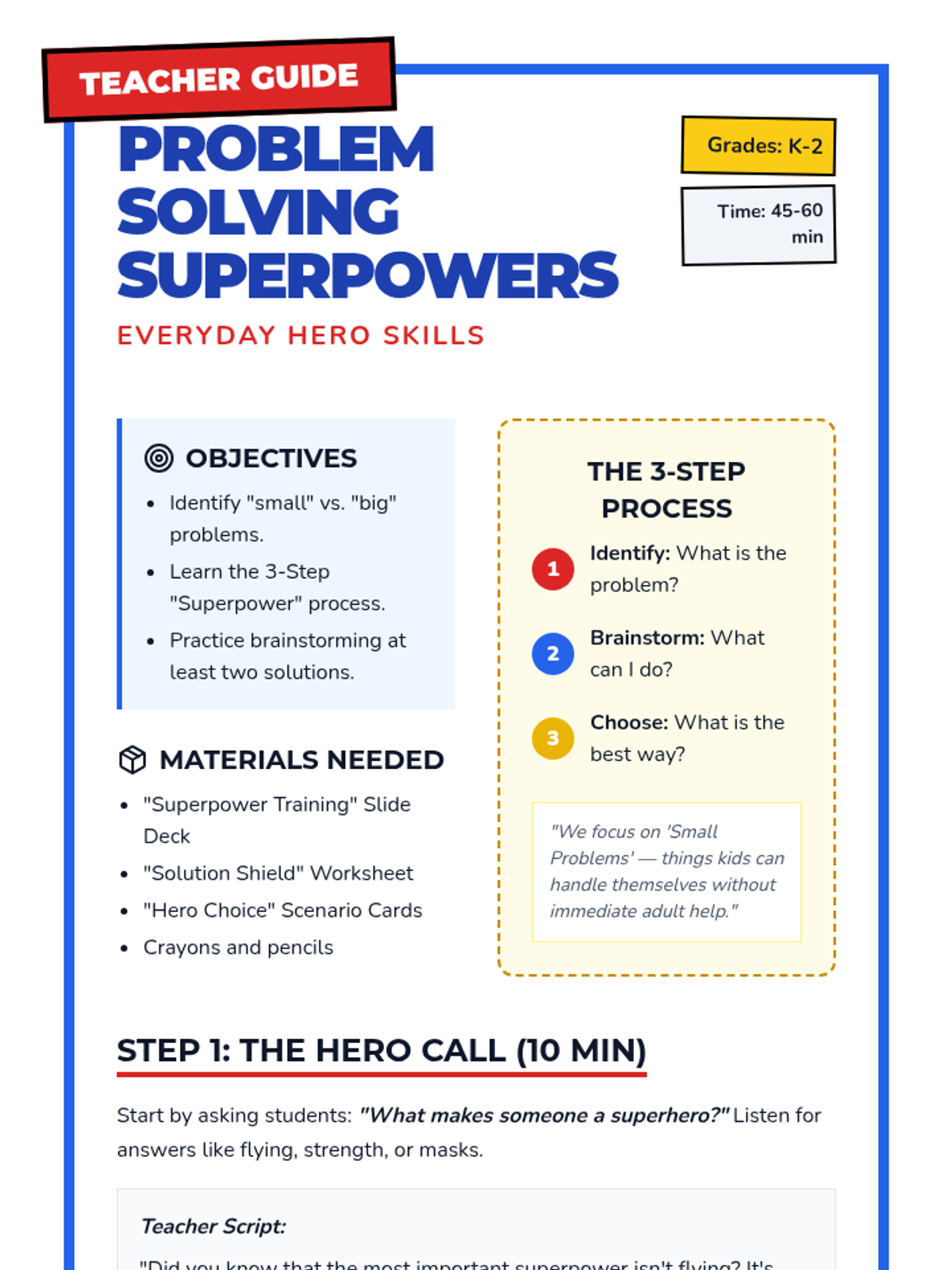 A K-2 lesson that introduces a three-step problem-solving process using a superhero theme to build independence and resilience. Students will learn to identify problems, brainstorm solutions, and take action like everyday heroes.