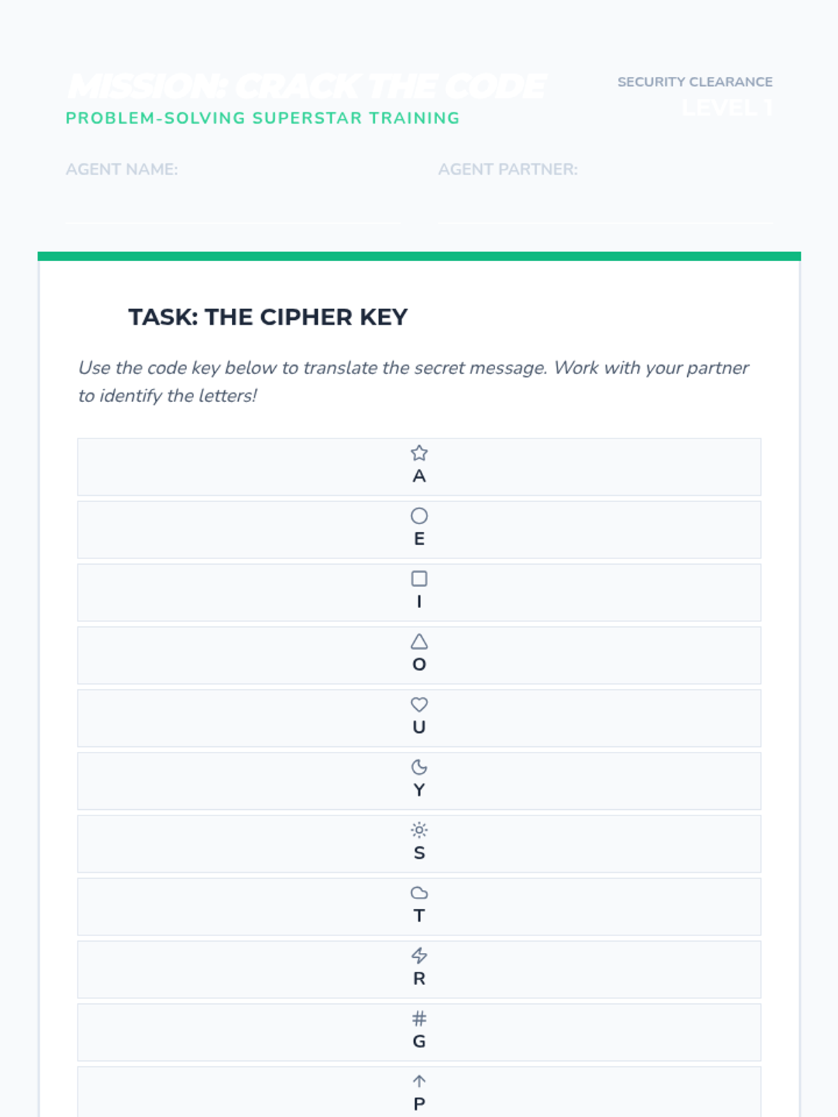 A high-energy, 20-minute lesson where students use critical thinking and collaboration to solve 'top secret' puzzles and develop a toolkit for approaching any challenge.